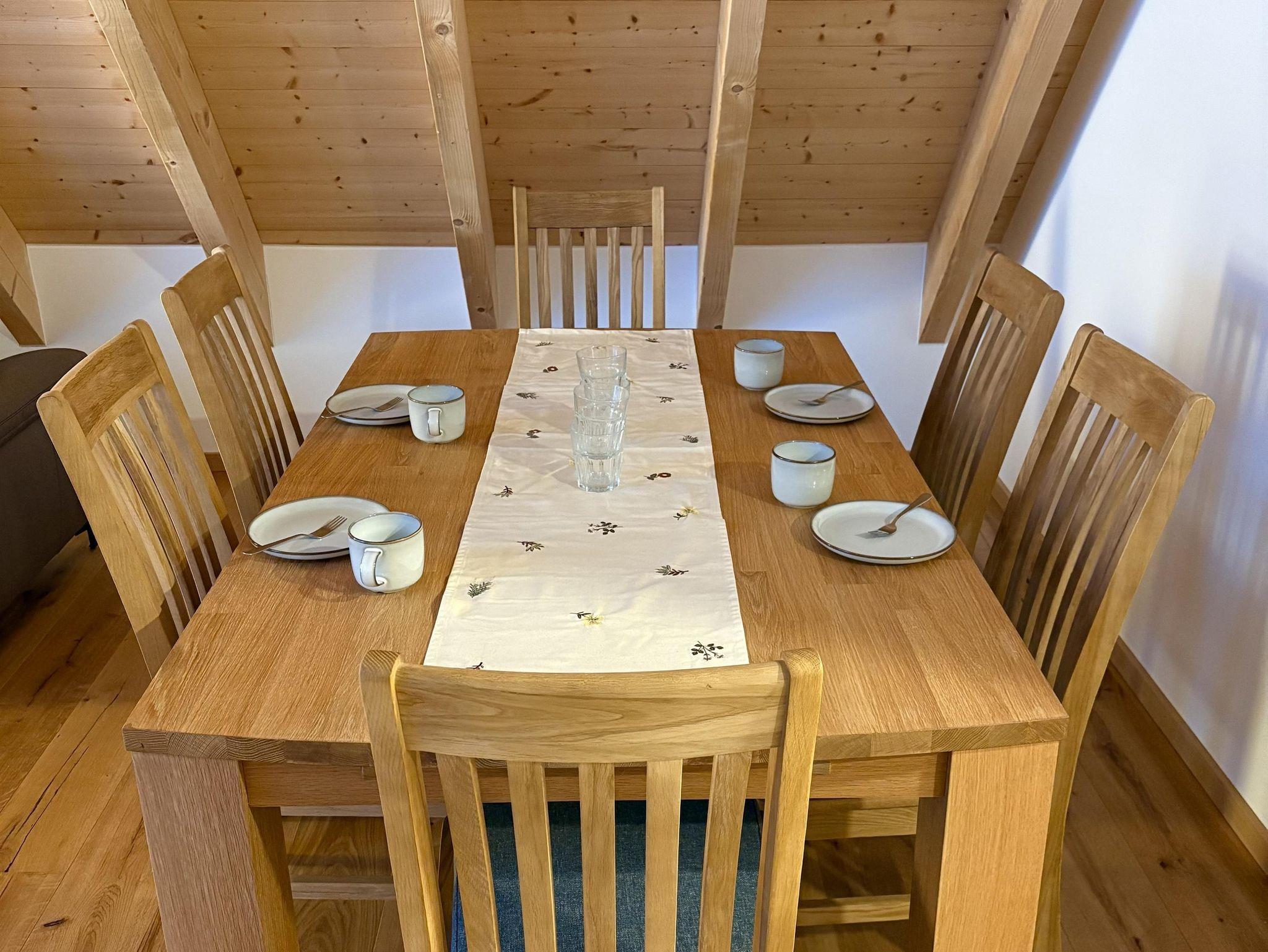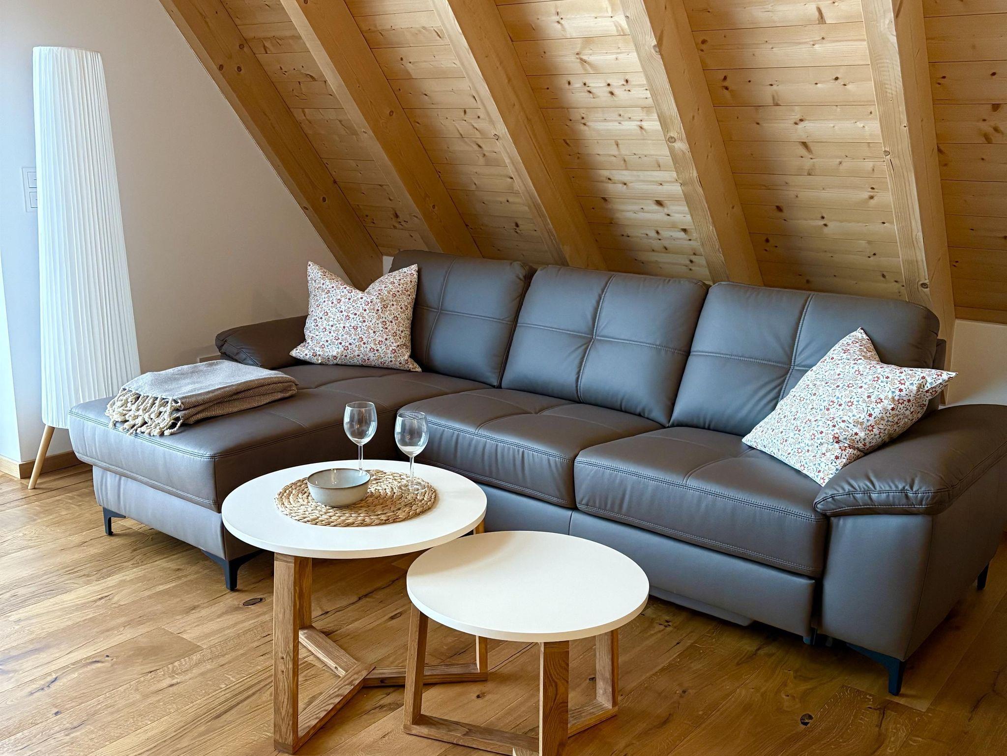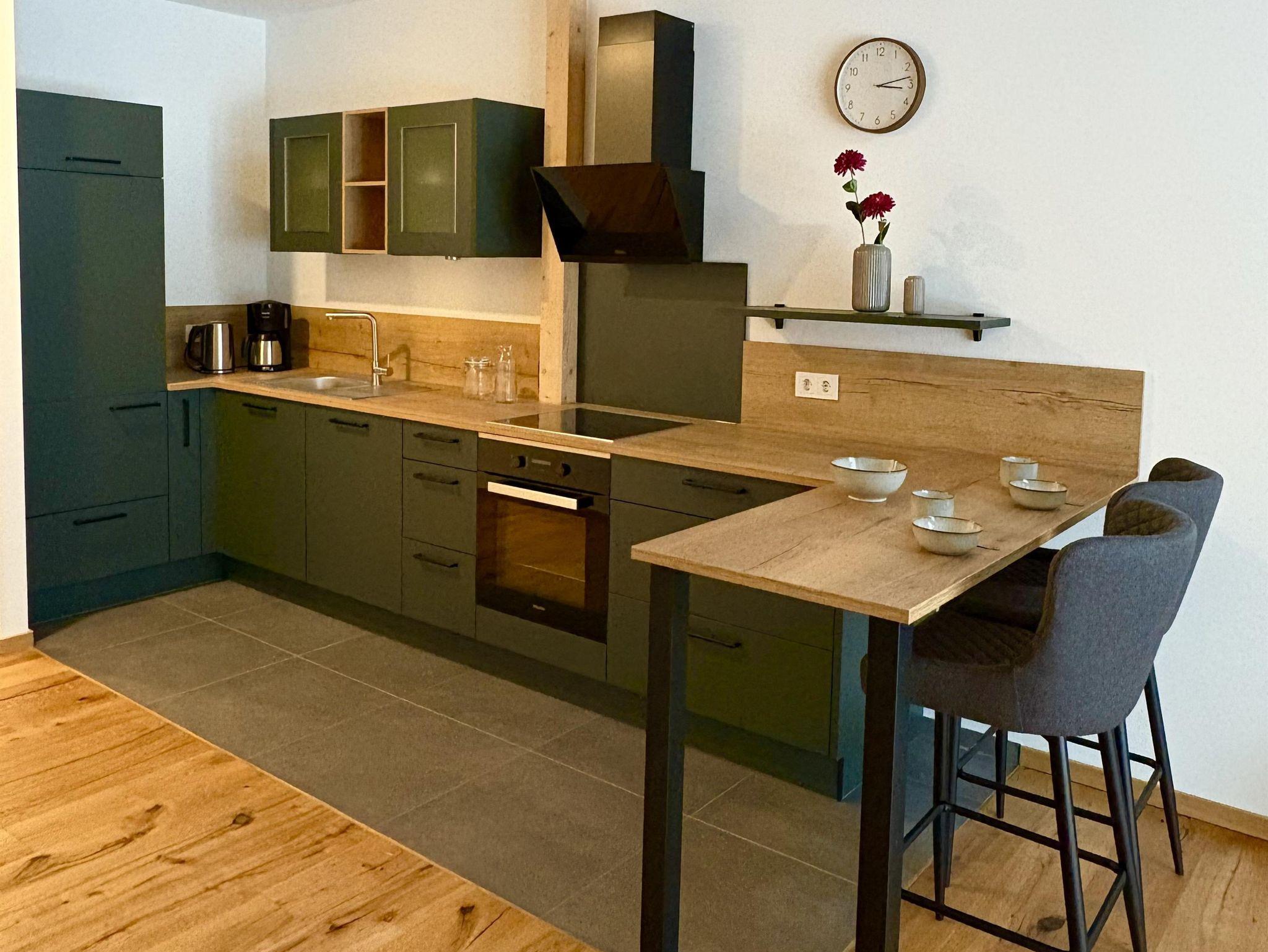 Die großzügigen, lichtdurchfluteten Wohn- und Essbereiche sind das Herzstück unserer Wohnungen. Große Fenster holen die Natur direkt ins Haus und schenken euch zu jeder Jahreszeit ein helles, freundliches Ambiente. Der warme Holzboden und die angenehme Fußbodenheizung sorgen für ein behagliches Wohngefühl – barfußlaufen ausdrücklich erwünscht! Die Wohnung verfügt über zwei gemütliche Schlafzimmer, ein modernes Bad sowie ein separates WC. Im Wohnbereich findet ihr ein bequemes Ausziehsofa, auf dem bei Bedarf bis zu zwei weitere Gäste Platz finden. Die Wohnungen sind außerdem allergikerfreundlich gestaltet. Aus Rücksicht darauf, und auf alle Gäste sind Haustiere in unseren Ferienwohnungen nicht gestattet. Die offenen, modernen Küchen sind mit allem ausgestattet, was ihr für euren Aufenthalt braucht – von Töpfen und Pfannen bis hin zur Kaffeemaschine und Spülmaschine. So könnt ihr entspannt gemeinsam kochen, essen und genießen.