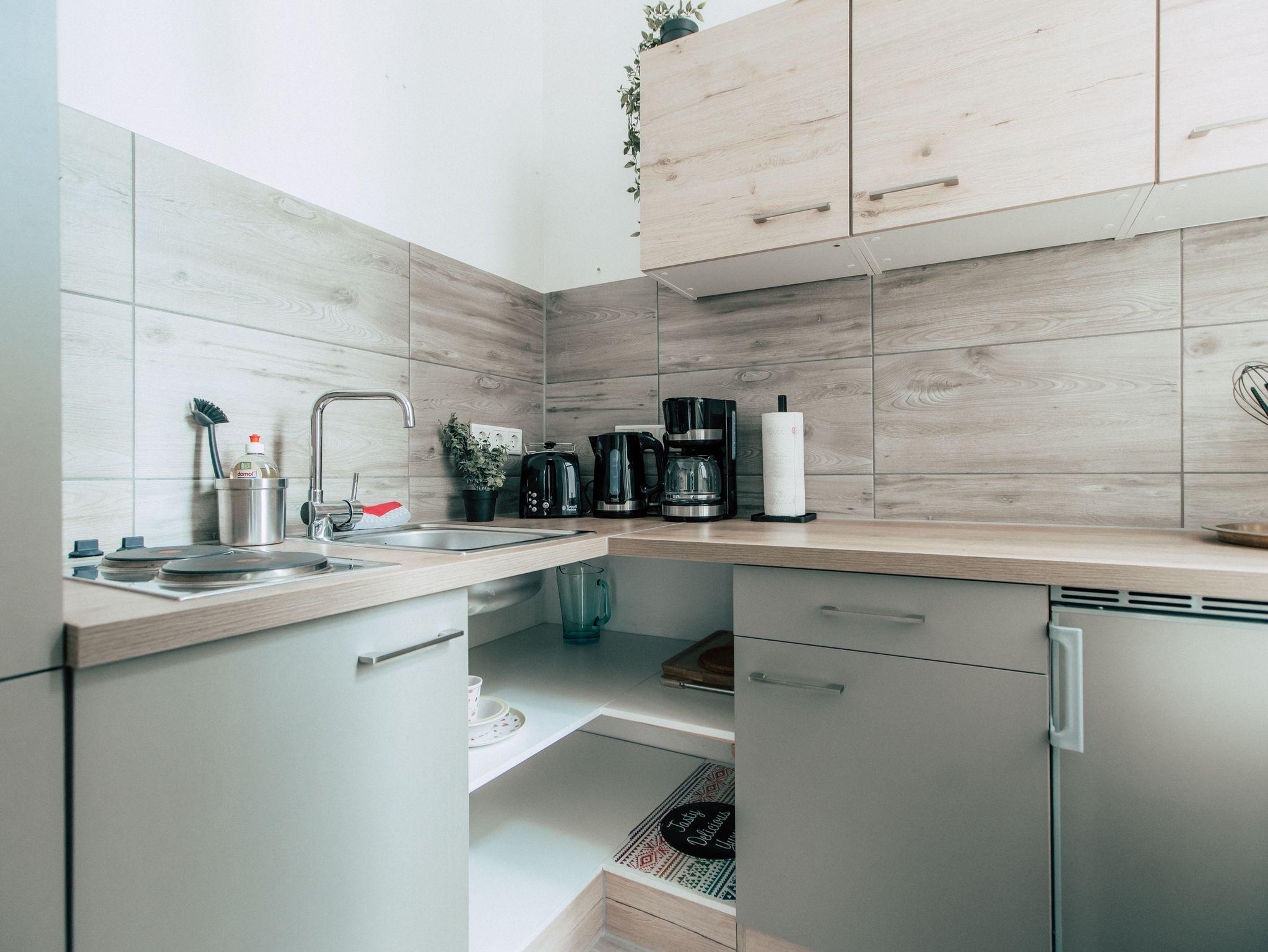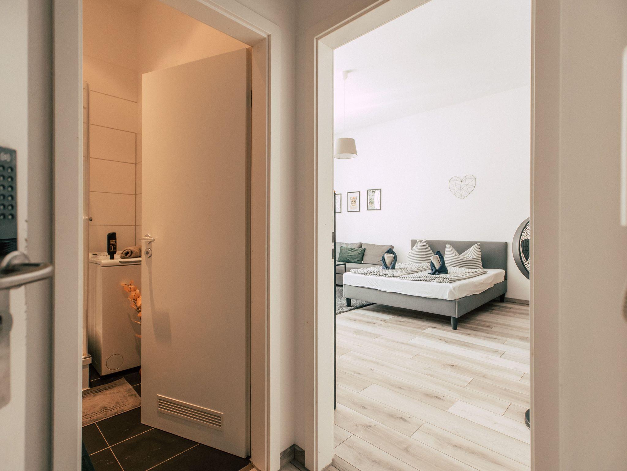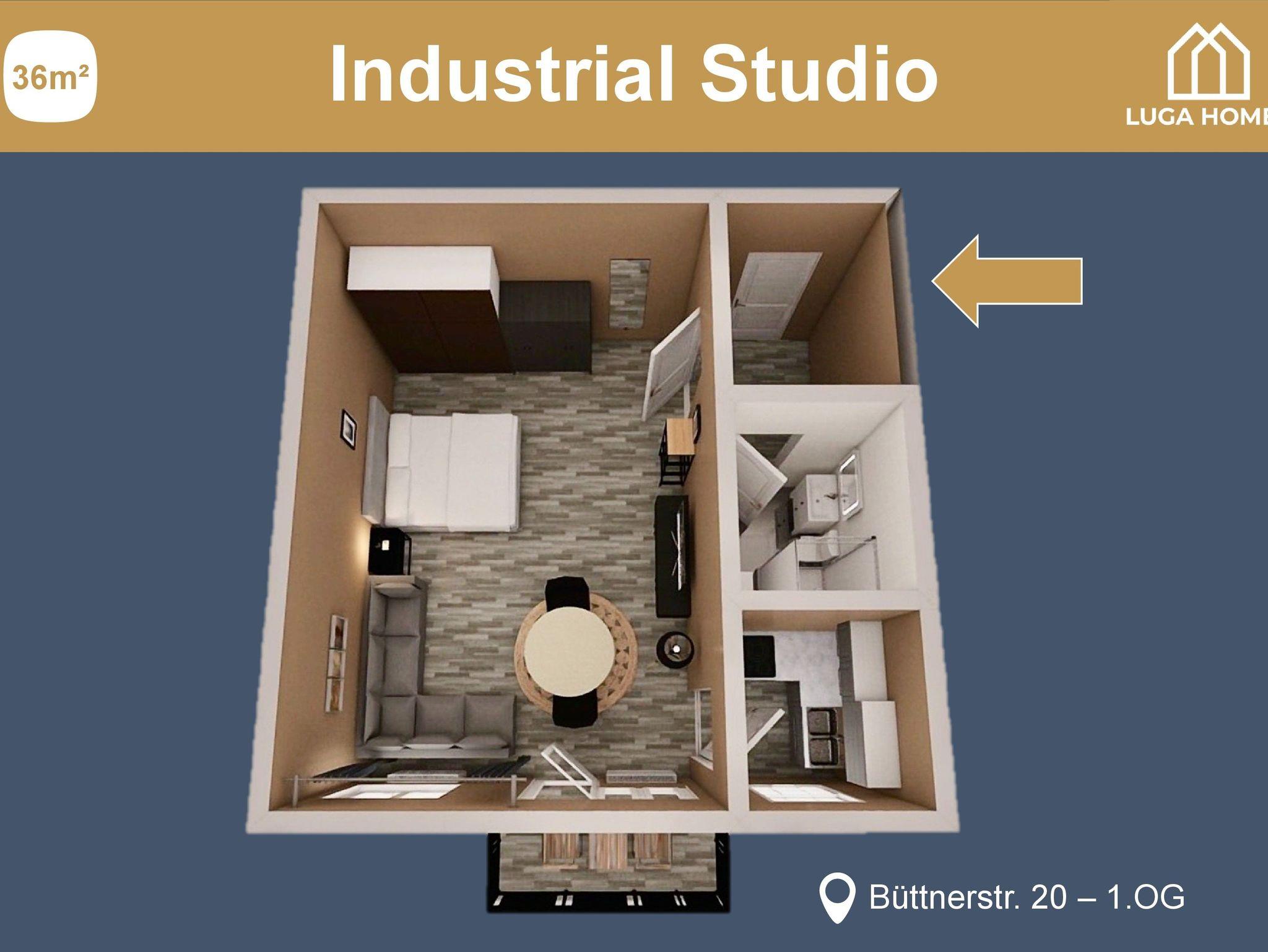 ?Nach Hause kommen? würdest Du gerne auch woanders? Trendig darf´s auch sein? Dann herzlich Willkommen in Deinem eigenen Studio, das sogar mehr als das für Dich bereithält! Neben einem eigenem kleinen Bad und einer Küche, ist jedoch der Nabel dieser kleinen Wohnwelt das stylishe Wohn- und Schlafzimmer im Loftstil. Die Einrichtung im passenden industriellen Design wurde gekonnt von einem Hauch luxuriösem Gold und kuschelig weichen Materialien abgerundet. Zum Ausspannen verleitet, hast Du dann die Qual der Wahl zwischen Sofa und einladendem Bett. Hier kannst Du zum Beispiel gechillt netflixen oder mit einem guten Buch ins Sofa sinken. Oder Du machst es Dir gleich auf dem sonnigen Balkon gemütlich! Sonnenlicht erhellt auch die einladende Küche nebenan, die mit umfassender Ausstattung und schicker Holzoptik Lust zum Kochen weckt!