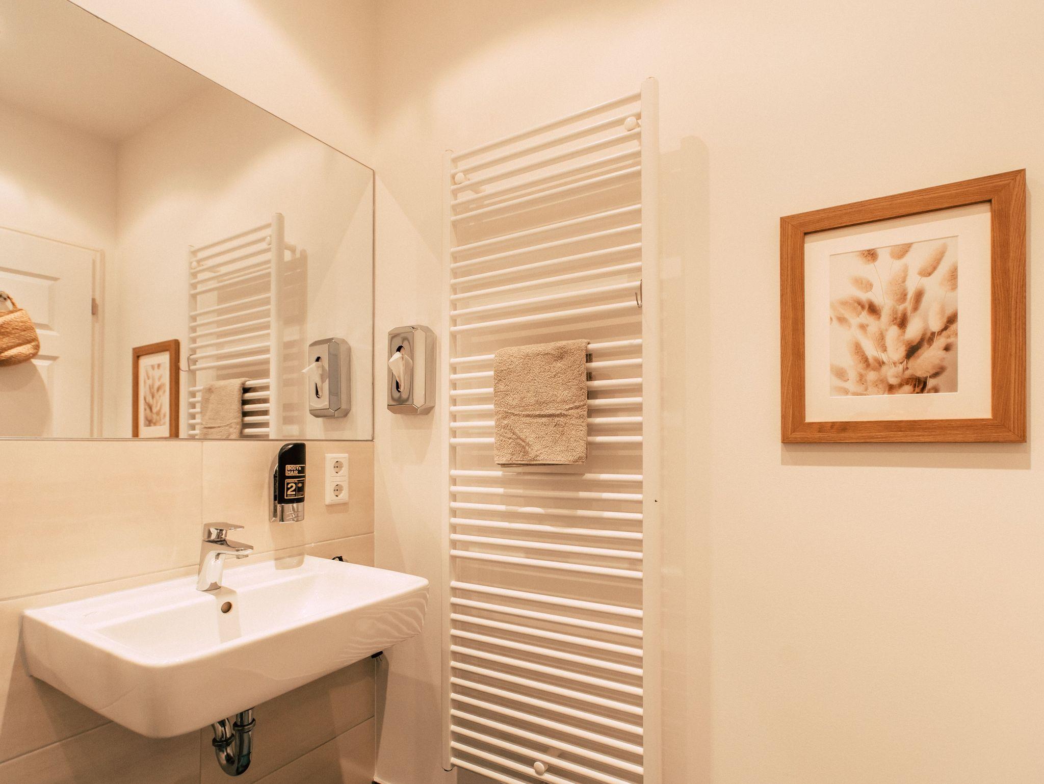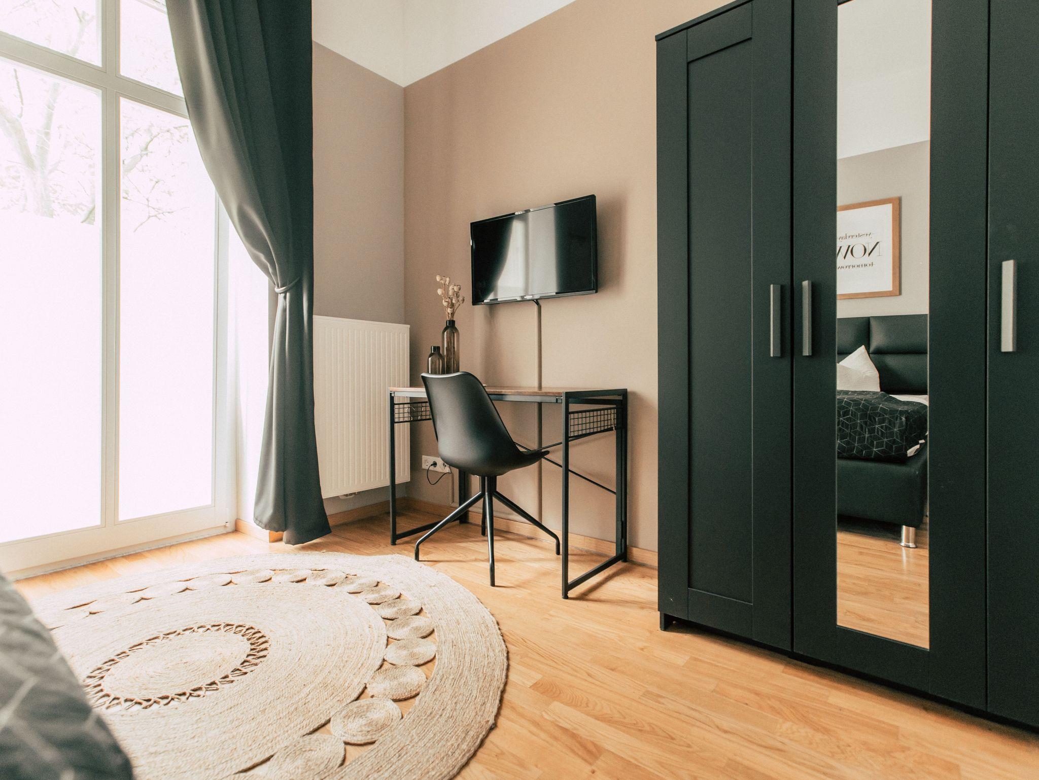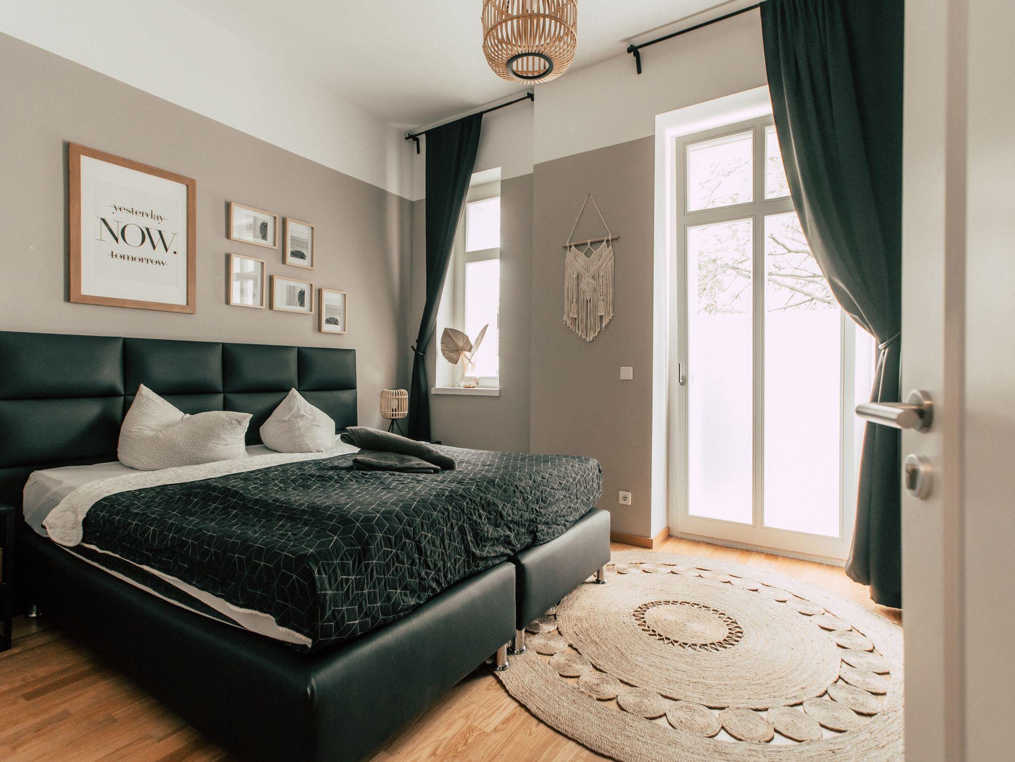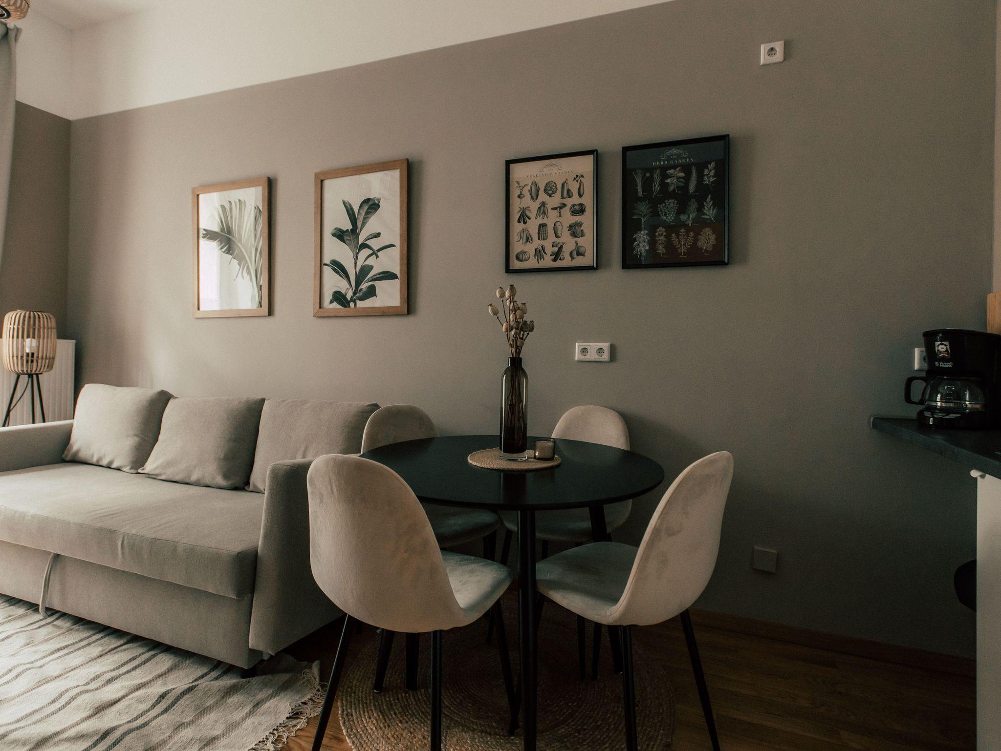 Minimalistisches Design ist Dein Ding? Auf einen Balkon möchtest Du auf keinen Fall verzichten? Na dann hereinspaziert in die gute Stube! Vom schmalen Flur abgehend findest Du sogleich ein modernes Badezimmer mit einer großen, ebenerdigen Dusche. Im Wohnbereich erwartet Dich, in Anthrazit und Silber getaucht, eine zweckmäßige Küchenzeile mit Essbereich und ein bequemes Ecksofa, das sich bei Bedarf auch ausziehen lässt. Eine Handvoll Schwarz-Weiß-Fotografien verleihen dem Raum eine dezente, persönliche Note. Das Schlafzimmer nebenan bleibt dem eleganten monochromen Look treu und überzeugt mit unserem erlesenen Boxspringbett für beste Schlafqualität! Auch hier gibt es natürlich einen Fernseher, abgesehen von Schreibtisch und kompakter Garderobe. Beide Zimmer zeichnen sich durch ihre ruhige Lage aus und öffnen ihre Türen zum gemütlichen Balkon in den Hinterhof!
