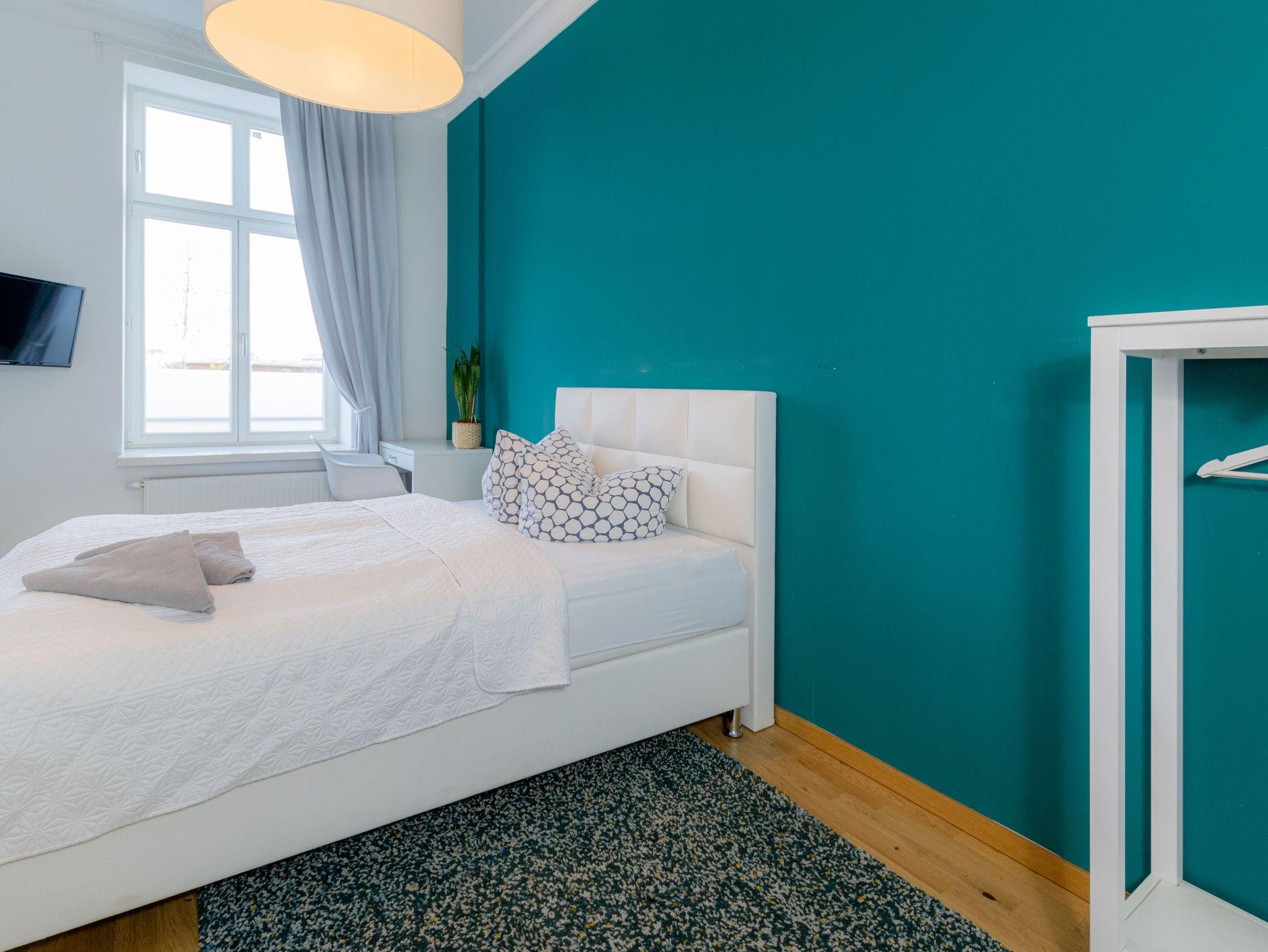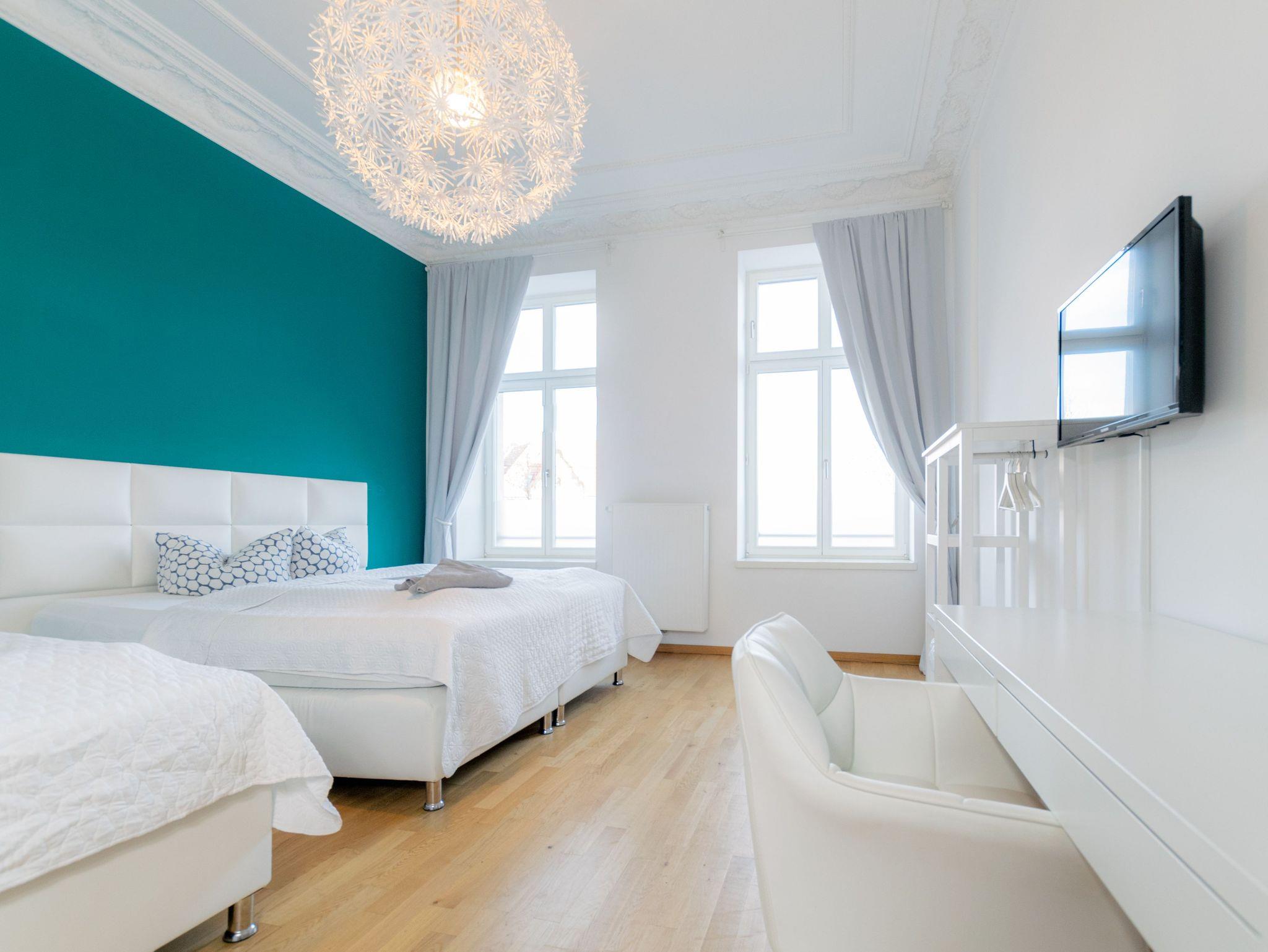Du suchst nach einem Zimmer mit dem gewissen Etwas und hast mehr als vier Personen im Schlepptau? Keine Sorge, deine Suche hat ein Ende: Hier erwartet Dich nämlich eine geschmackvolle Unterkunft für sechs Personen. Für wenig Geld bekommst Du sogar Appartementflair! Im großen Zimmer finden vier Deiner Reisetruppe großzügig Platz und das kleinere Schlafzimmer nimmt es mit den restlichen Beiden locker auf. In strahlendem Weiß gehalten, überzeugen beide Räume durch die historisch hohen Decken und Fenster des Altbaus mit viel Licht. Mit zweckmäßiger, ruhevoller Einrichtung und einem Hauch spritzigem Türkis wird eine erholsame Atmosphäre geschaffen, die den Trubel der Großstadt draußen lässt. Im Badezimmer glänzen neue Ausstattung und elegantes Design um die Wette. Sechs auf einen Streich für einen klasse Preis mit Flair! Was will man mehr?