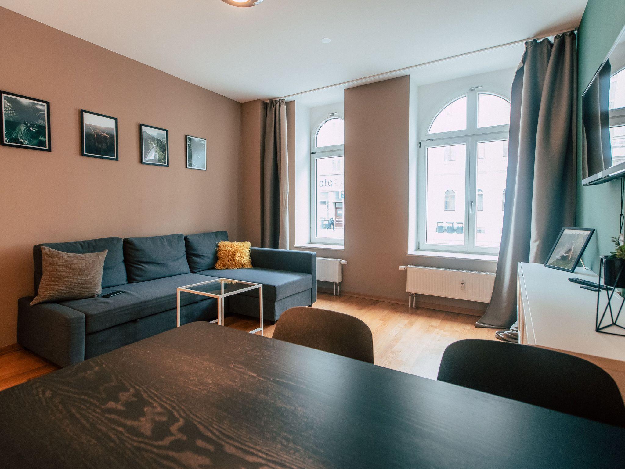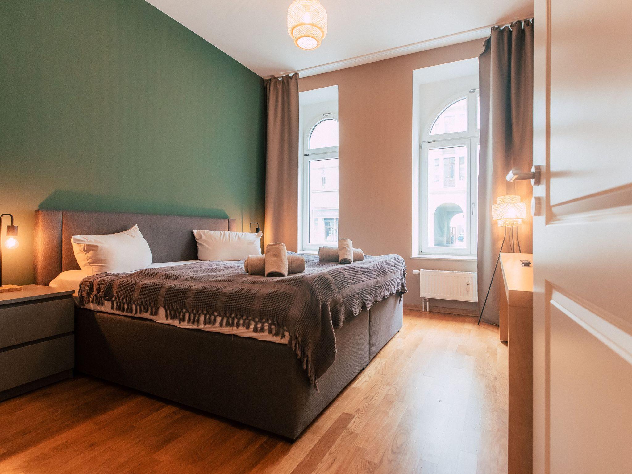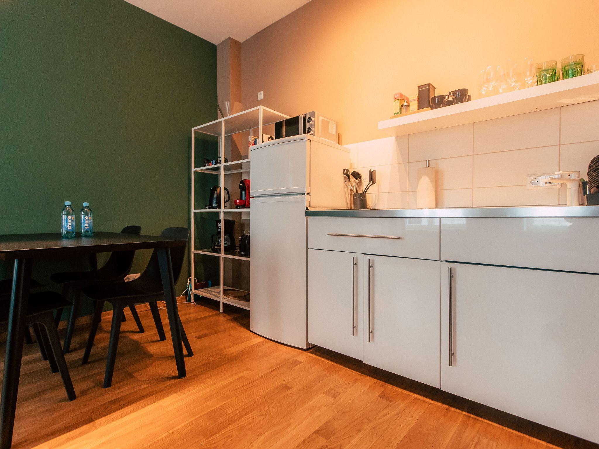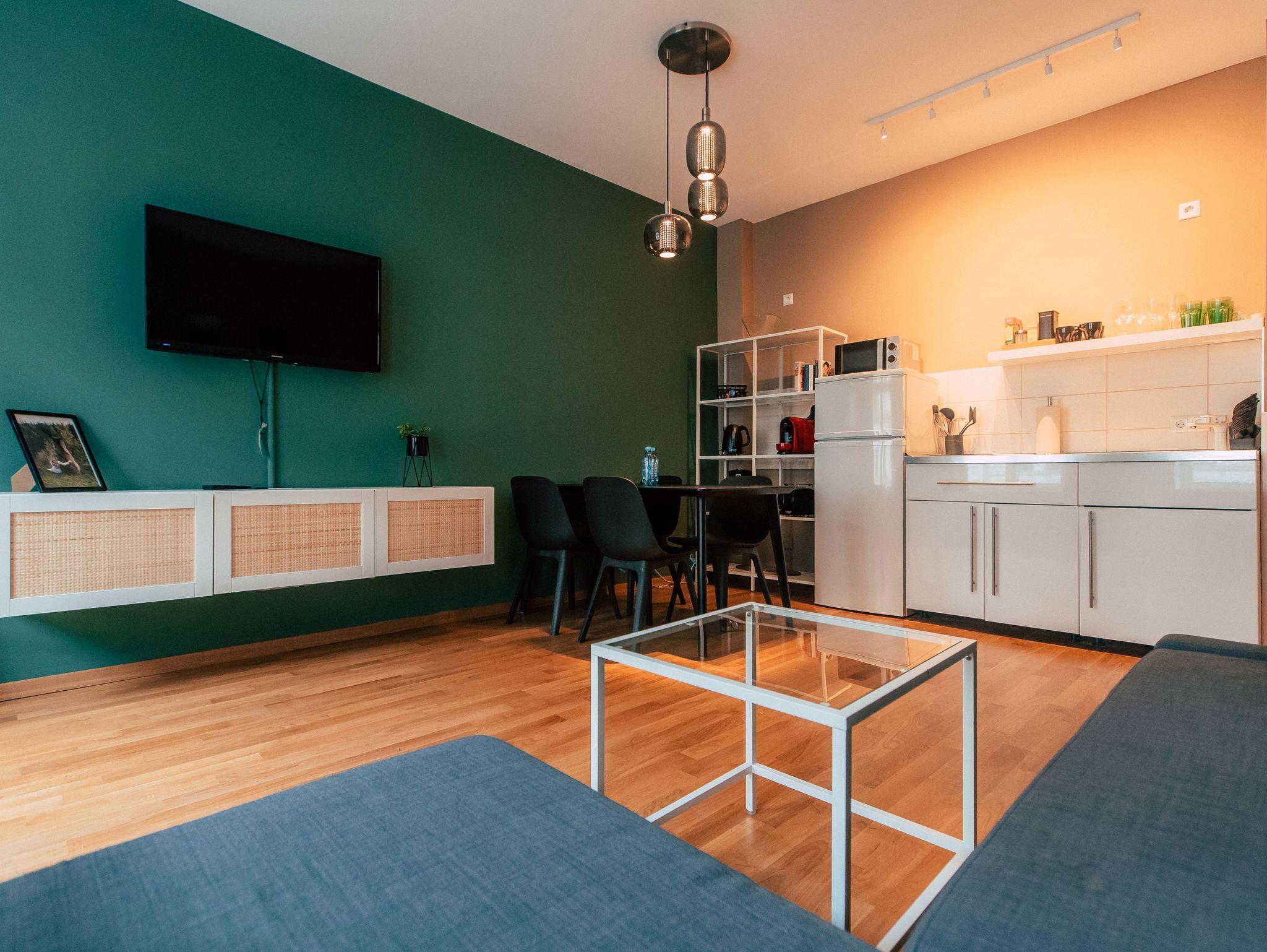 Dir ist Dein eigenes Reich wichtig? Du möchtest gerne länger bleiben und benötigst neben Unabhängigkeit auch Wohlfühlgarantie? Das schreiben wir auch hier groß! Dein idyllischer Rückzugsort wurde hingebungsvoll eingerichtet, sorgsam durchdacht, und hat alles was Du brauchst. Neben dem eigenen Bad, kannst Du Dich entspannt in der praktischen Wohnküche selbst verköstigen und es Dir am Esstisch bequem machen. Im geräumigen Wohnbereich, der sich übrigens kinderleicht in weitere Schlafplätze verwandeln lasst, schlägt sanftes Waldgrün eine Brücke zur Natur im Großstadtdschungel. Und weil Farbe bekanntlich froh macht, kannst Du dich im Schlafzimmer jeden Morgen von zartem Sonnengelb wach küssen lassen. In diese stylishe, kleine Oase im Herzen der Stadt kommst Du, um zu bleiben. Zuhause ist´s halt nicht immer am Schönsten?