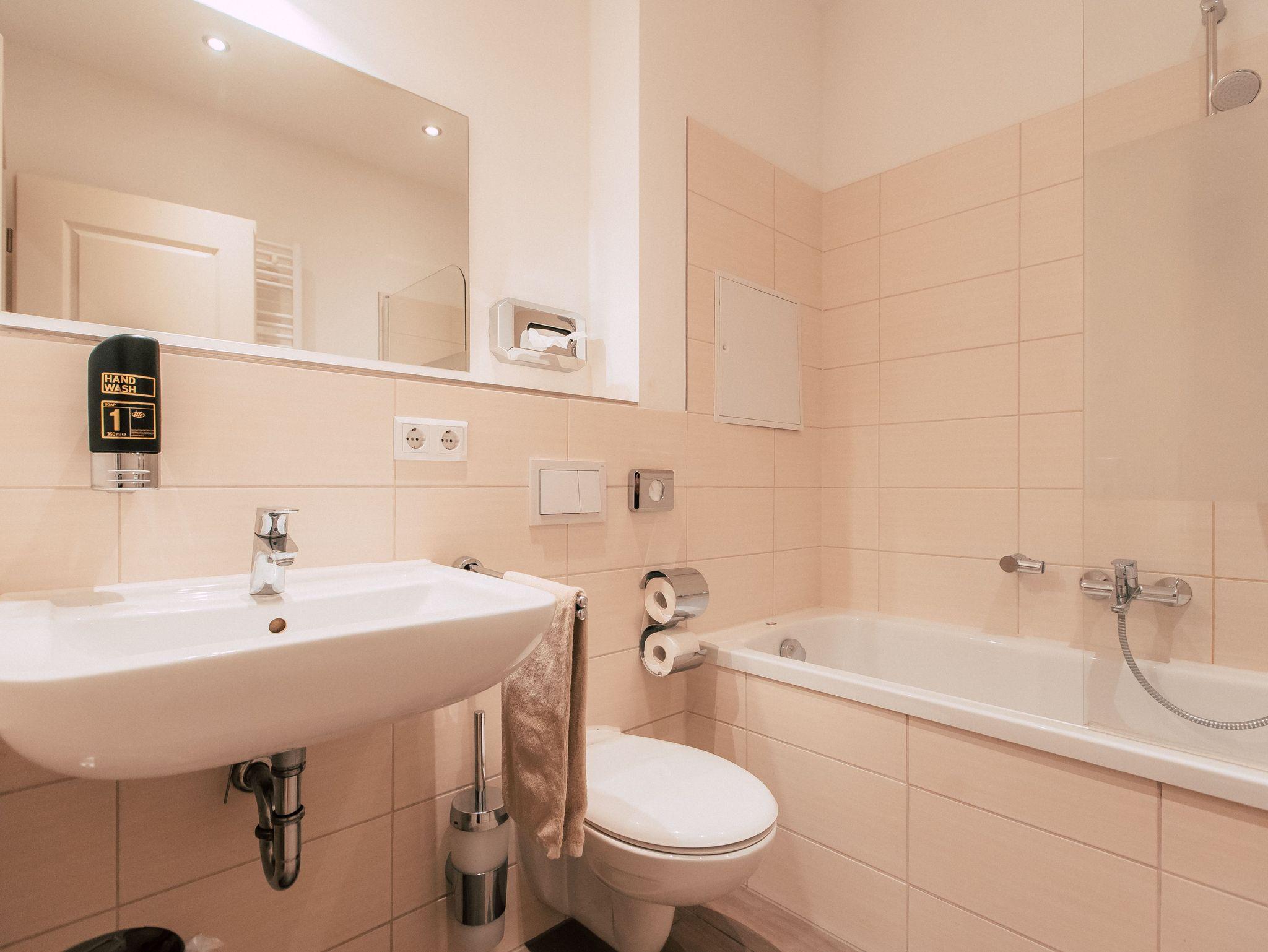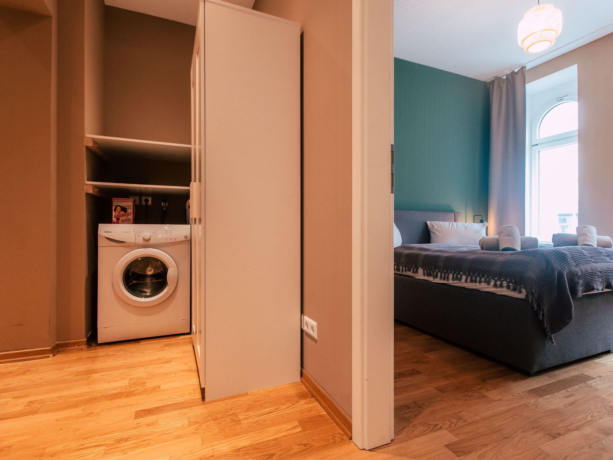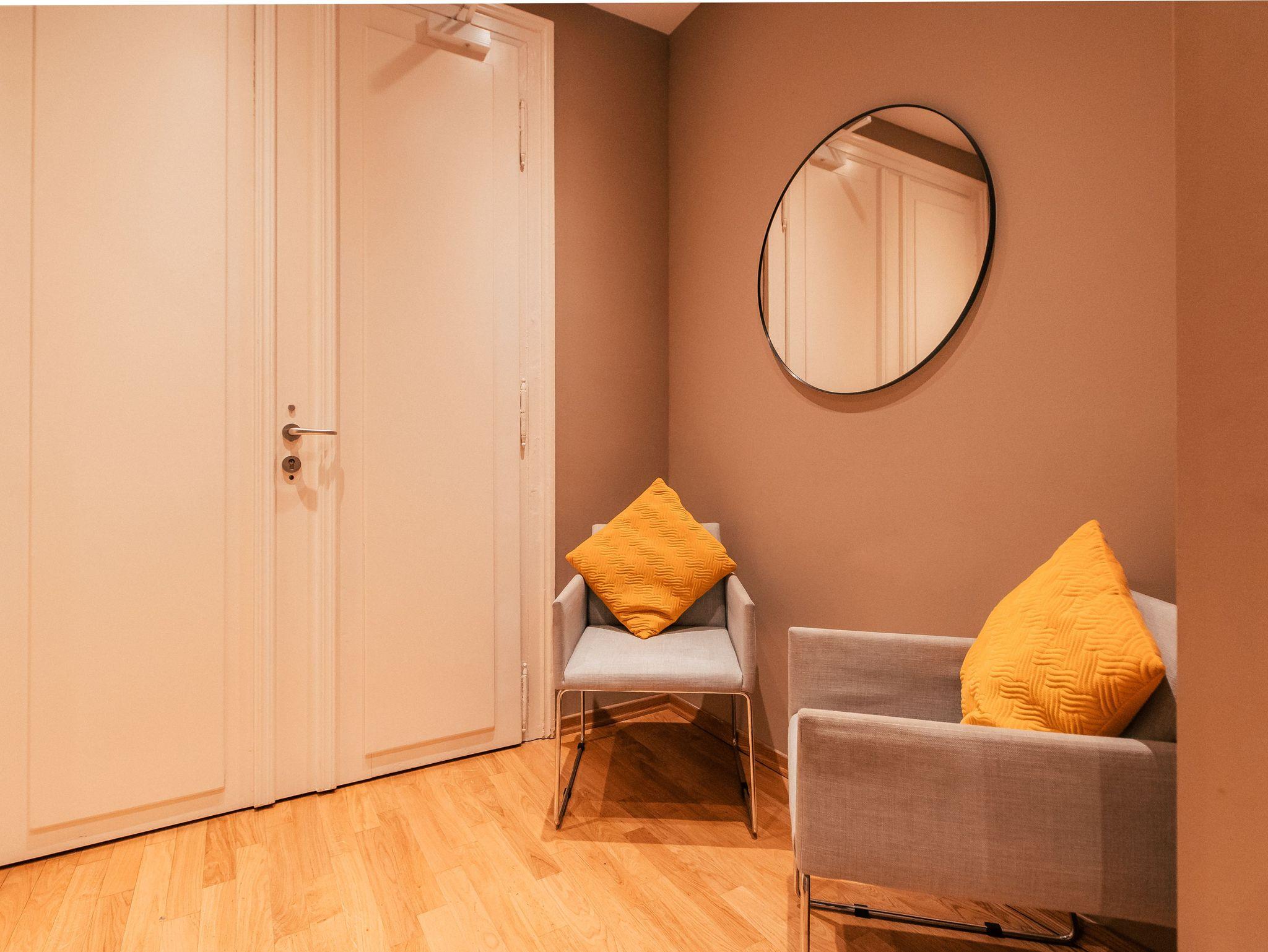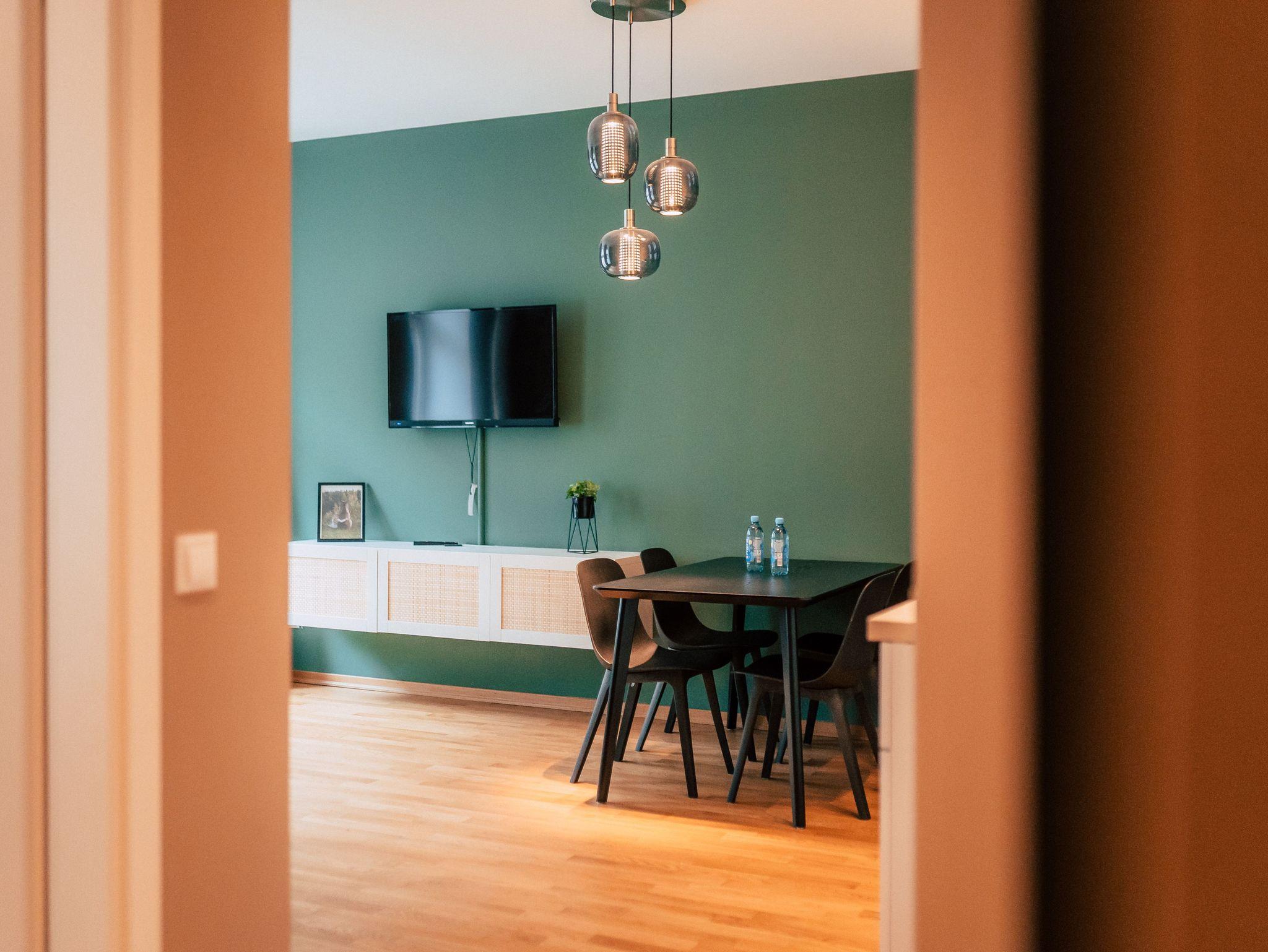 Dir ist Dein eigenes Reich wichtig? Du möchtest gerne länger bleiben und benötigst neben Unabhängigkeit auch Wohlfühlgarantie? Das schreiben wir auch hier groß! Dein idyllischer Rückzugsort wurde hingebungsvoll eingerichtet, sorgsam durchdacht, und hat alles was Du brauchst. Neben dem eigenen Bad, kannst Du Dich entspannt in der praktischen Wohnküche selbst verköstigen und es Dir am Esstisch bequem machen. Im geräumigen Wohnbereich, der sich übrigens kinderleicht in weitere Schlafplätze verwandeln lasst, schlägt sanftes Waldgrün eine Brücke zur Natur im Großstadtdschungel. Und weil Farbe bekanntlich froh macht, kannst Du dich im Schlafzimmer jeden Morgen von zartem Sonnengelb wach küssen lassen. In diese stylishe, kleine Oase im Herzen der Stadt kommst Du, um zu bleiben. Zuhause ist´s halt nicht immer am Schönsten?