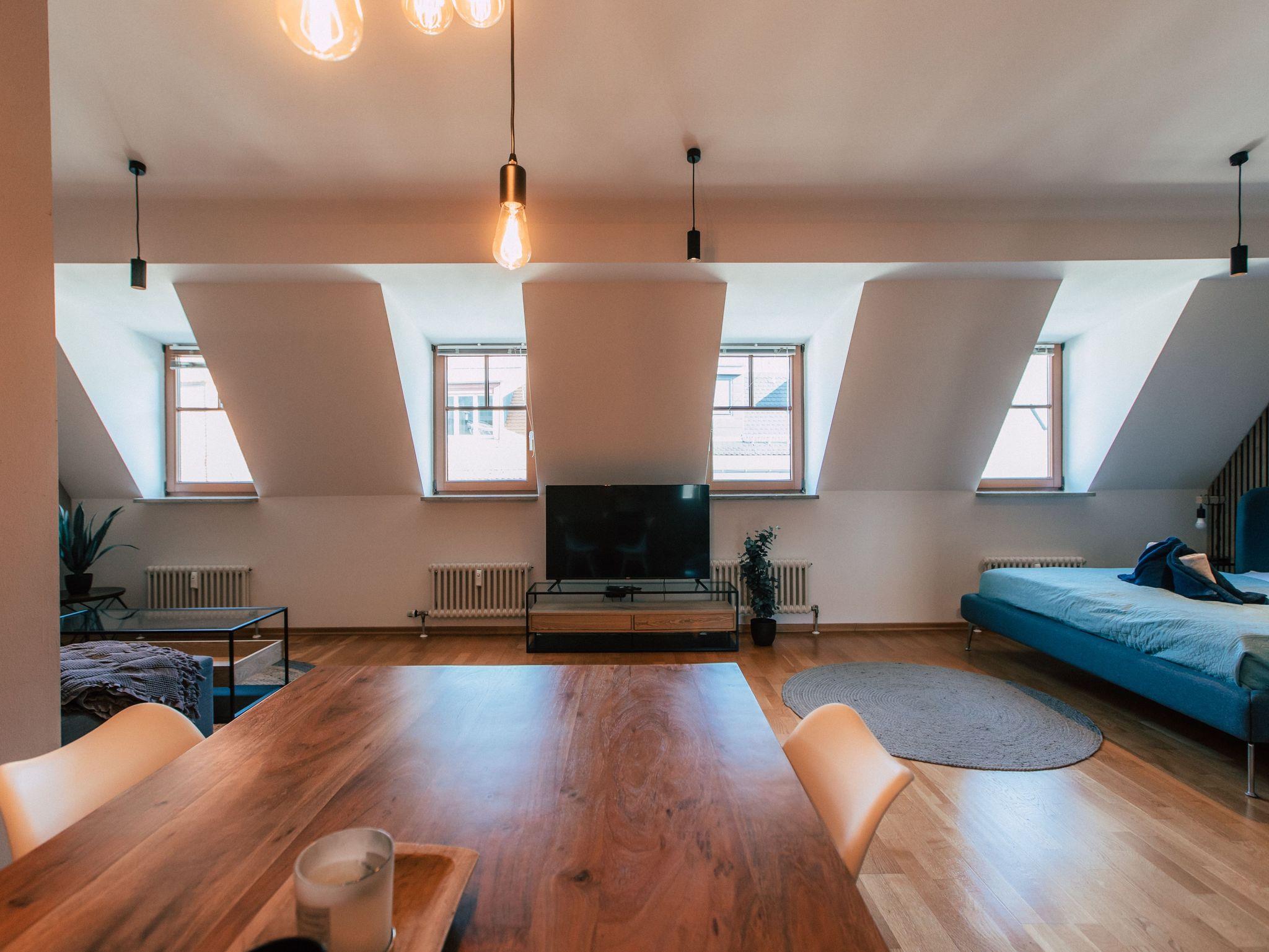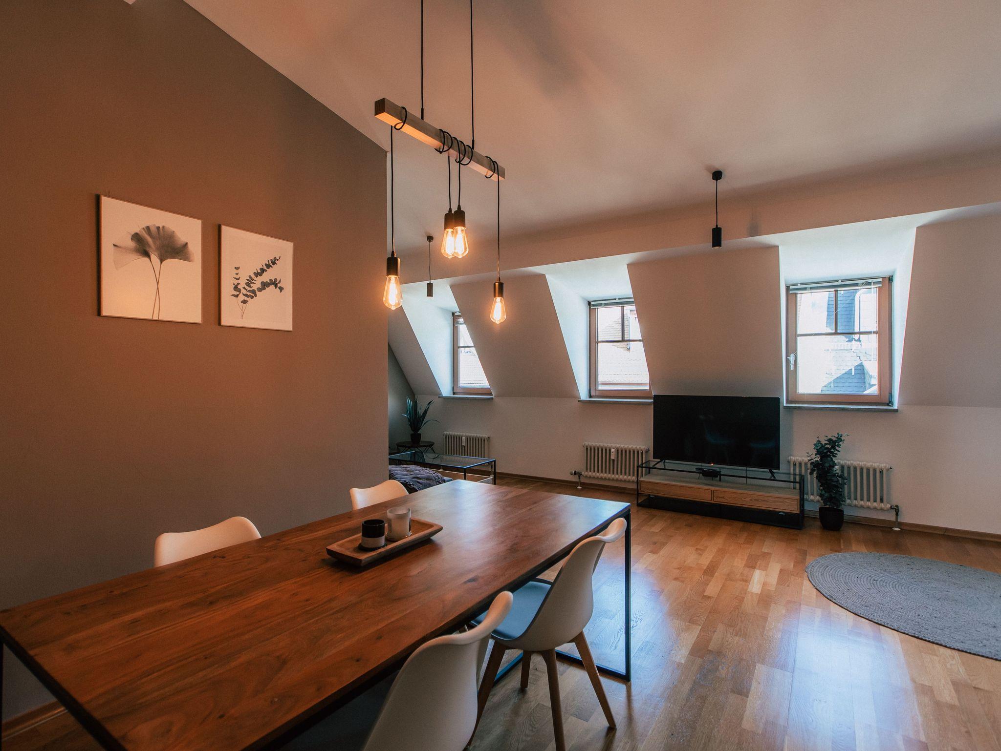 Über den Dächern der Stadt erwartet Dich mitten im pulsierenden Herz Leipzigs ein wohltuender Ruhepol in sanften Erdtönen, warmem Holz und stylischen Elementen! Direkt auf der prächtigen Einkaufsmeile versteckt sich im Dachgeschoss eines alten Jugendstilgebäude unser *Big Relaxing* Appartement, das geschmackvoll und mit viel Liebe eingerichtet wurde. Ein Wechselspiel zwischen coolem industriellem Design, mildem Licht und weichen Texturen ergibt eine geschmackvolle und beruhigende Atmosphäre im Großstadttrubel. Großzügig auf zwei Zimmer verteilt, gibt es hier auch zwei himmlisch erholsame Doppelbetten und eine heimelige Sofa- und Fernsehecke mit Smart TV zum Abtauchen und gemütlich machen unter der Dachschräge. Für Erfrischung sorgt das Bad mit Wanne und eine separate Toilette. Die kleine Küche ist umfassend ausgestattet und bietet alles, was es zum leckeren Frühstück und mehr braucht. Am edlen Esstisch im Zentrum des Wohnzimmers lässt sich perfekt die nächste Erkundungstour planen oder ein Glas Wein genießen zum Ausklang?