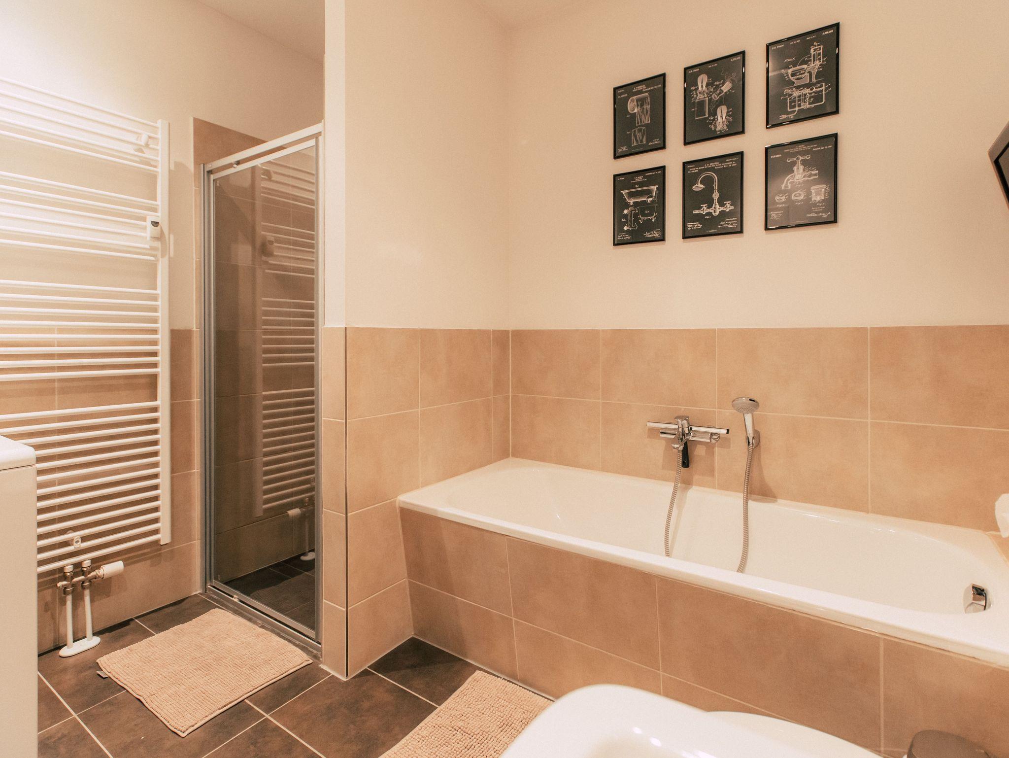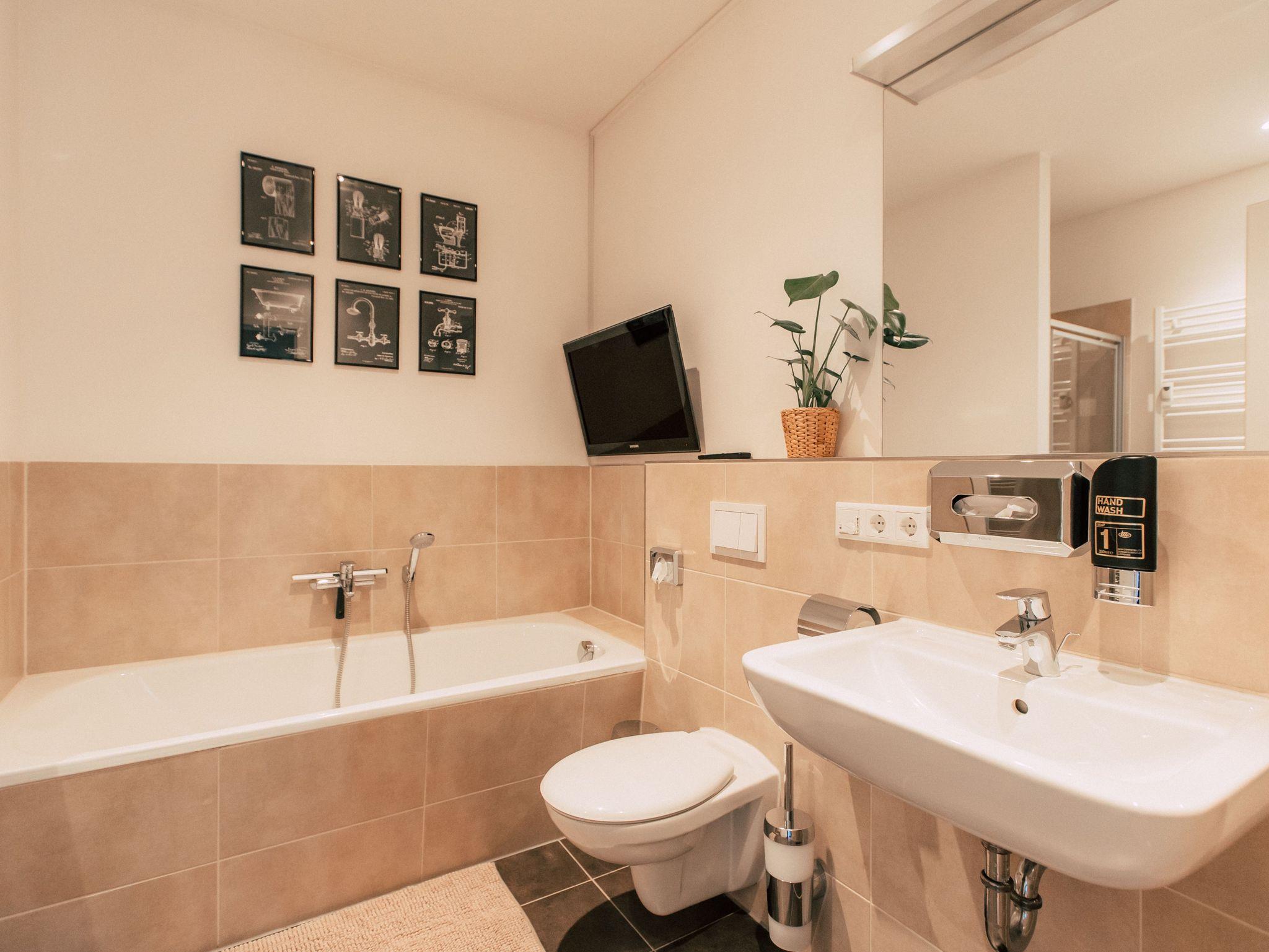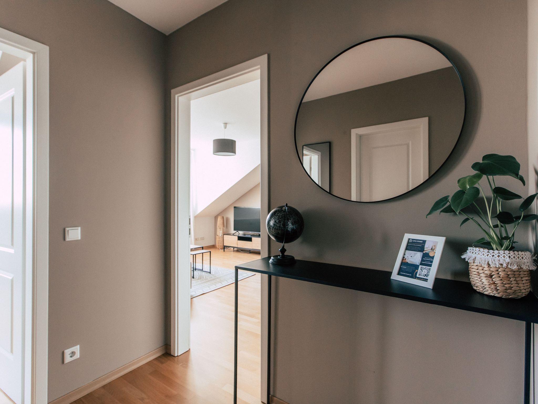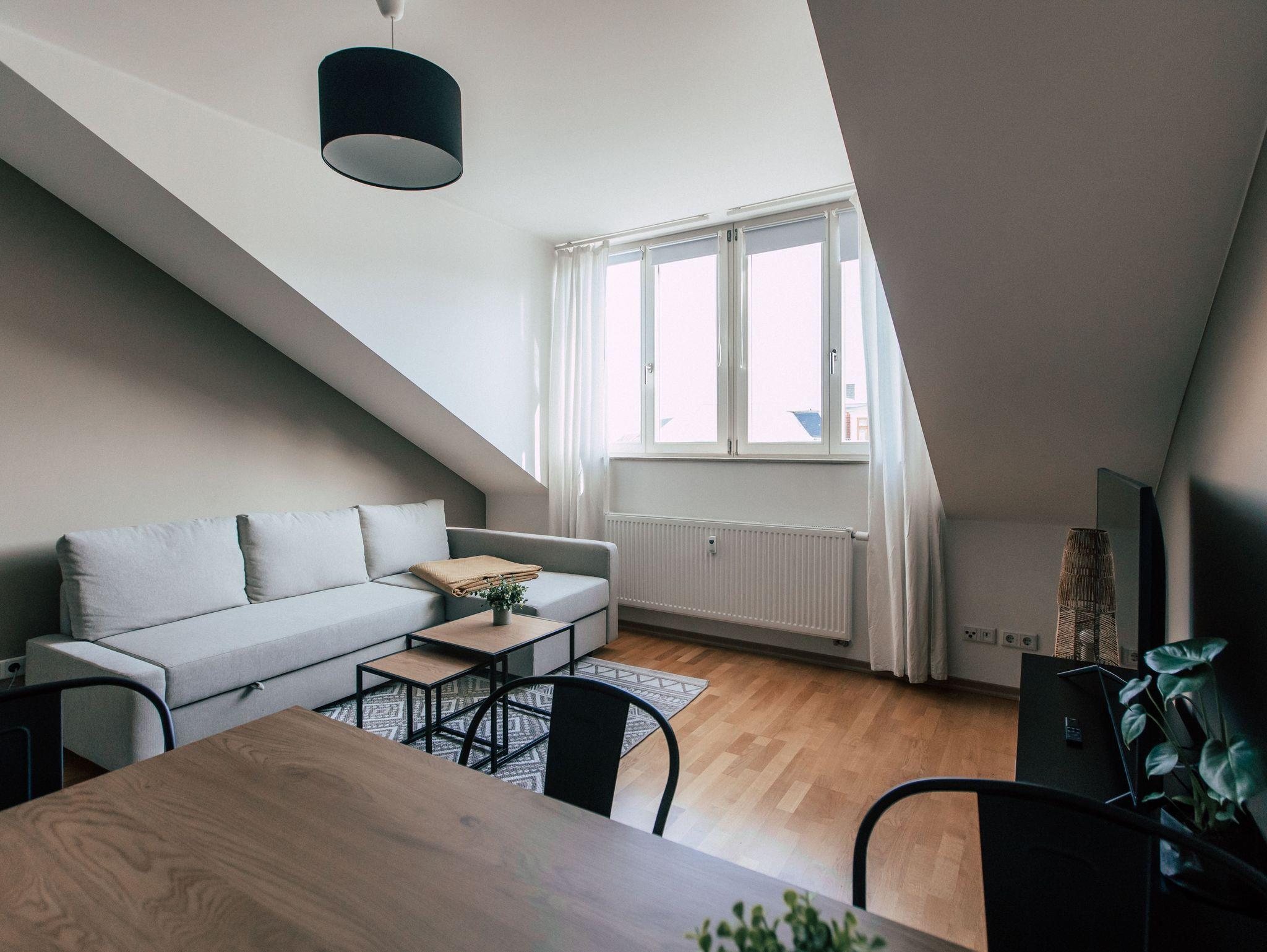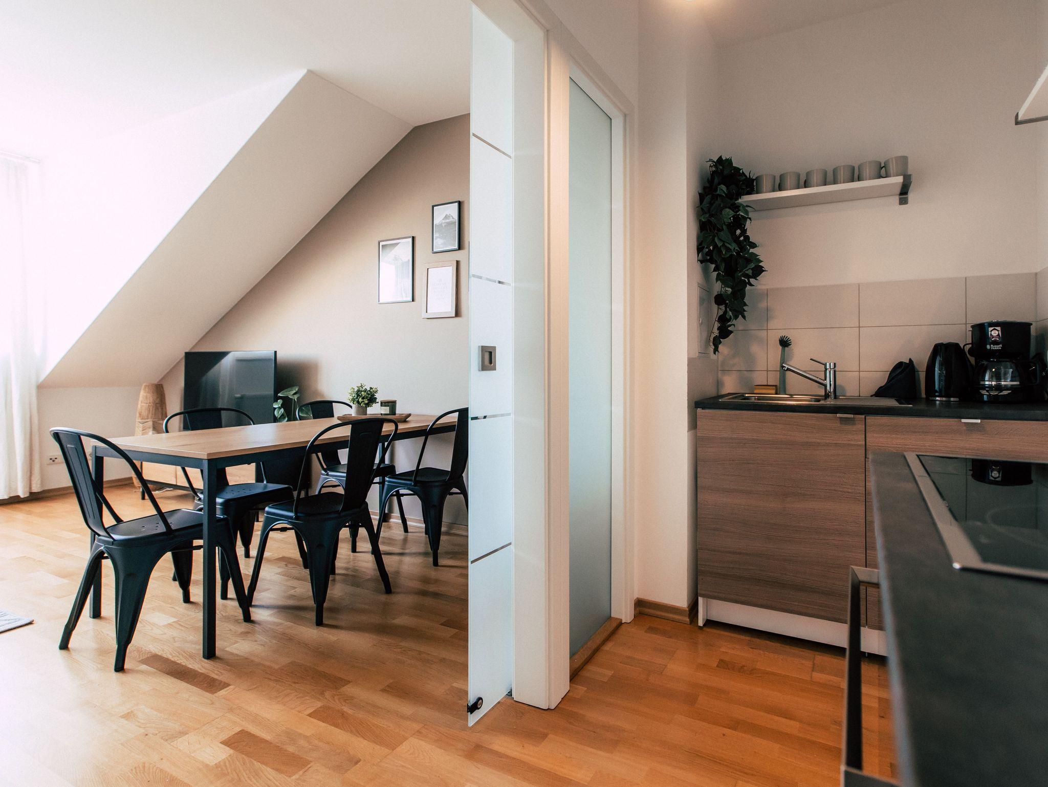 Im gemütlichen Dachgeschoss des klassischen Altbaus kannst du dich getrost dem Getöse der Stadt entziehen und trotz zentraler Lage Ruhe und Abgeschiedenheit genießen. Die charmante Wohnung versprüht allein durch ihren Schnitt viel Wohnlichkeit. Unterstrichen wird dies durch sorgfältig ausgewählte, geschmackvolle Accessoires in zurückhaltenden Farben. Die Ausstattung tut ihr übriges: Vom geschmackvollen Empfangsbereich über die umfassend ausgestattete, trennbare Wohnküche bis hin zum gemütlichen Wohnraum mit Couch und Fernsehecke und coolem Essbereich. Im ruhigen Schlafzimmer, das in cleanem Boho-Stil eine entspannte Atmosphäre verbreitet, gibt es einen weiteren Fernseher. Und da aller guten Dinge bekanntlich drei sind, erwartet dich das insgeheime i-Tüpfelchen dieses Appartements im Badezimmer: Neben praktischer Waschmaschine für längere Aufenthalte, ebenerdiger Dusche, gibt es über der einladenden Badewanne einen dritten Fernseher. Einfach mal Abtauchen aus dem Alltag?