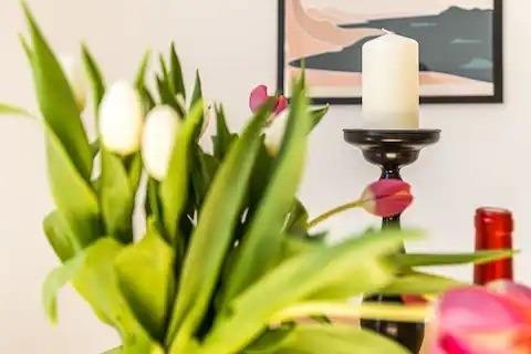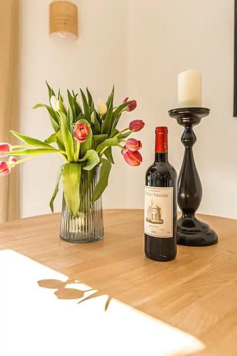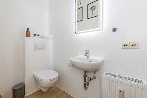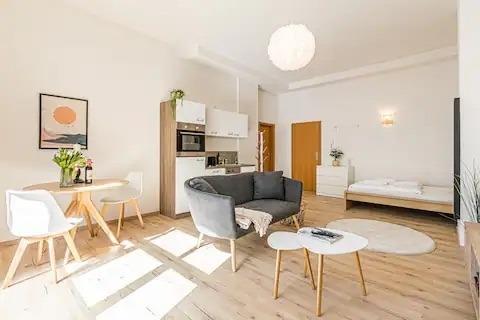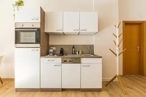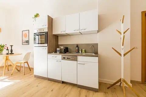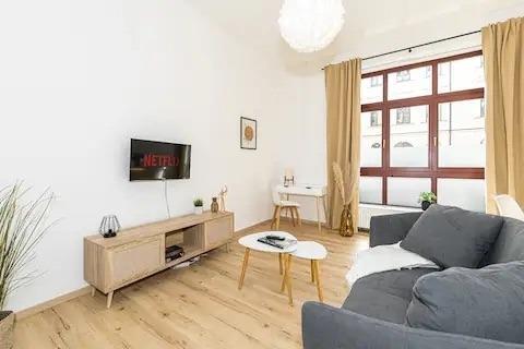 Die Wohnung ist geschmackvoll eingerichtet und verfügt über ein gemütliches Schlafzimmer mit einem bequemen Doppelbett, eine bequeme Couch und eine helle Küche mit einem Esstisch, die auch für das Homeoffice geeignet ist. Die moderne Küche ist komplett mit allem ausgestattet, was man braucht, um seine Mahlzeiten zuzubereiten. Das Bad ist neu und verfügt über eine Dusche.