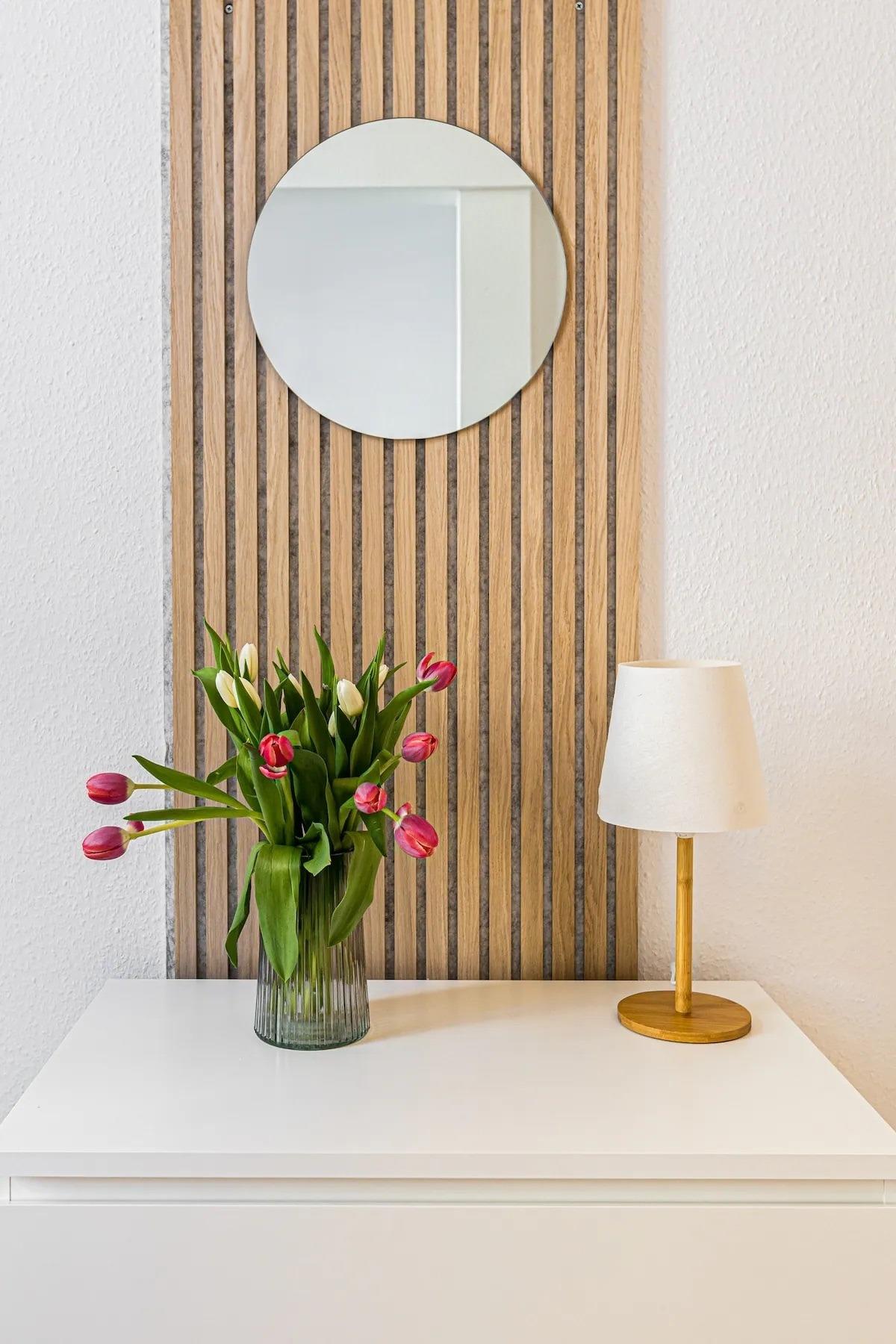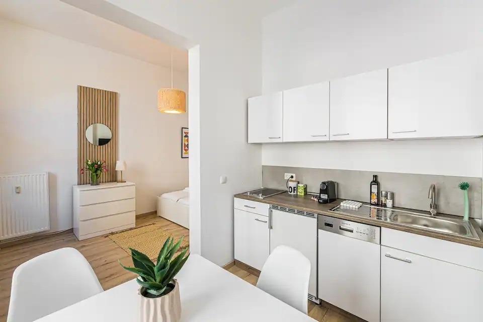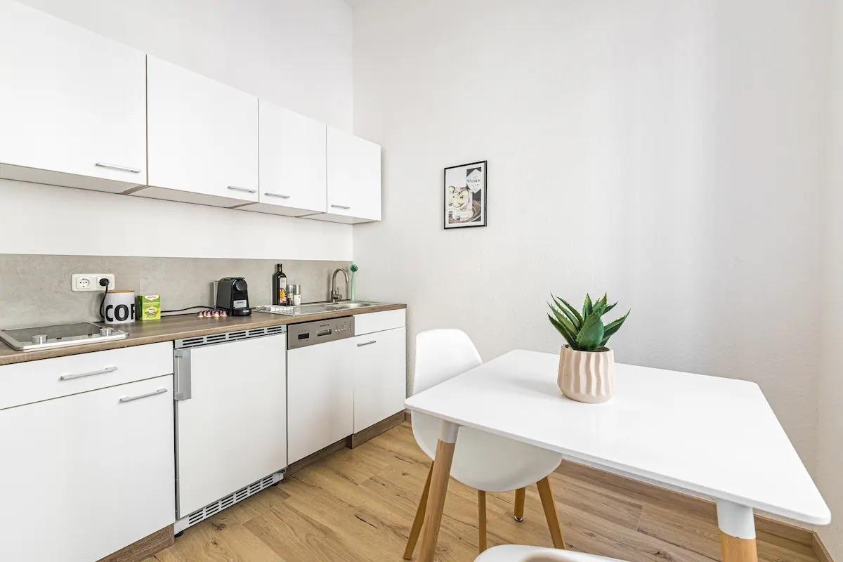 Das Apartment ist stilvoll eingerichtet und verfügt über ein gemütliches Schlafzimmer mit einem komfortablen Doppelbett und eine helle Küche mit Esstisch, die auch für ein Home-Office geeignet ist.