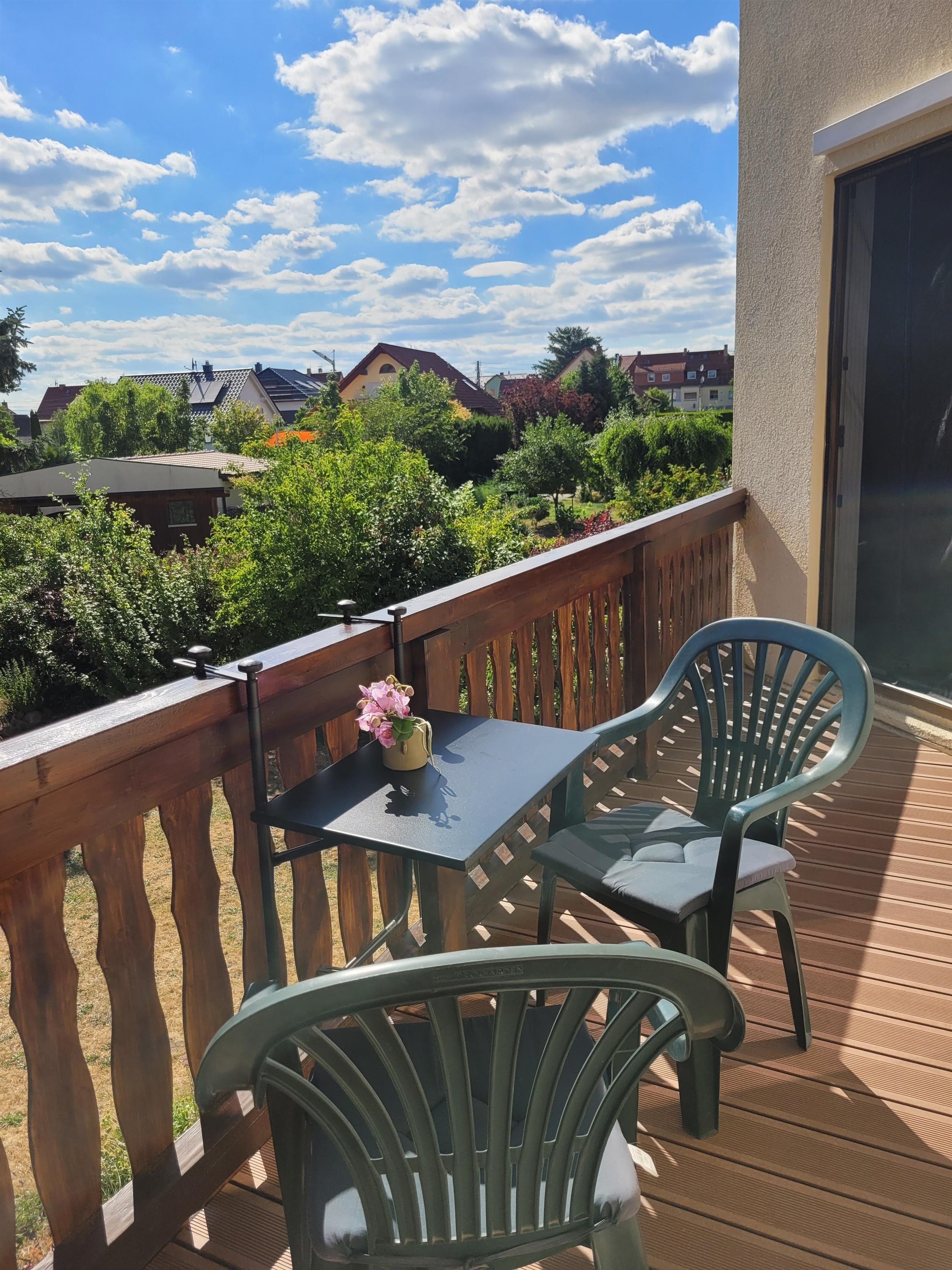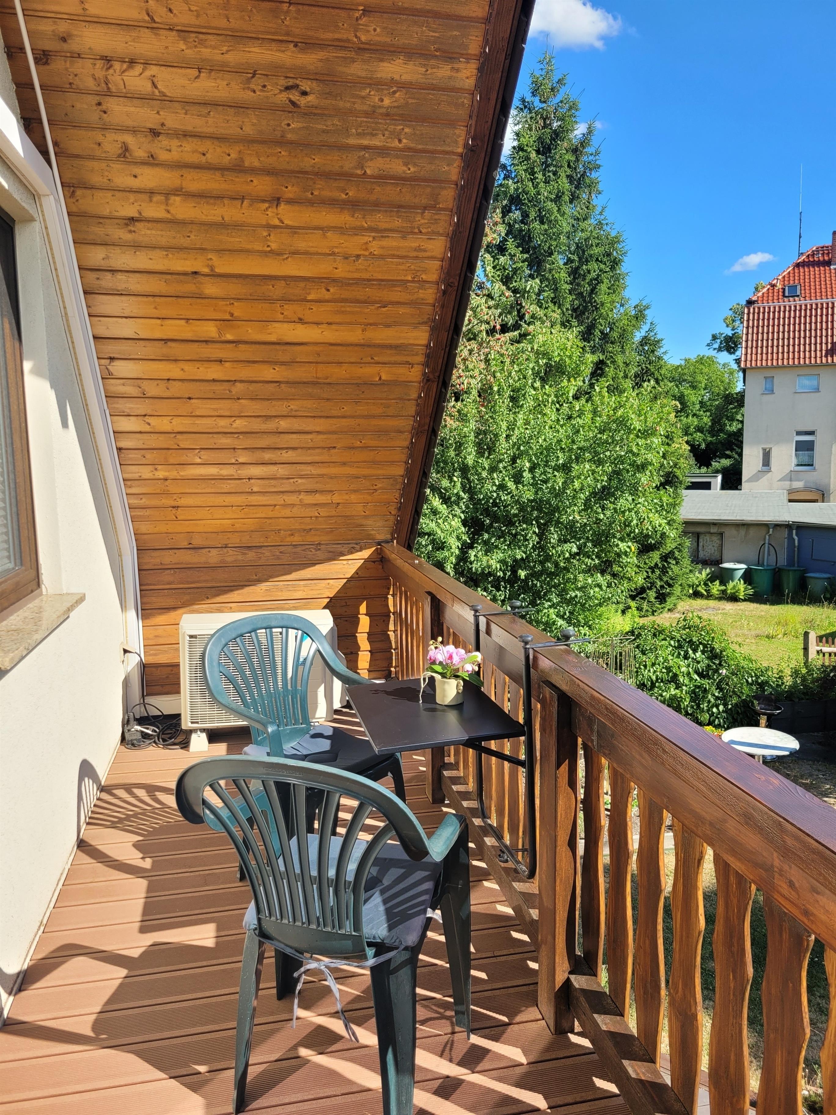 Beide Zimmer (Wohnküche und Schlafzimmer) sind mit einem Klimagerät ausgestattet und haben einen Zugang zum Balkon. Dieser ist 10 qm groß, hat einen herrlichen Blick auf den Garten und ist mit Balkonstühlen und einem kleinem Tisch ausgestattet. Rauchen ist nur auf dem Balkon gestattet.