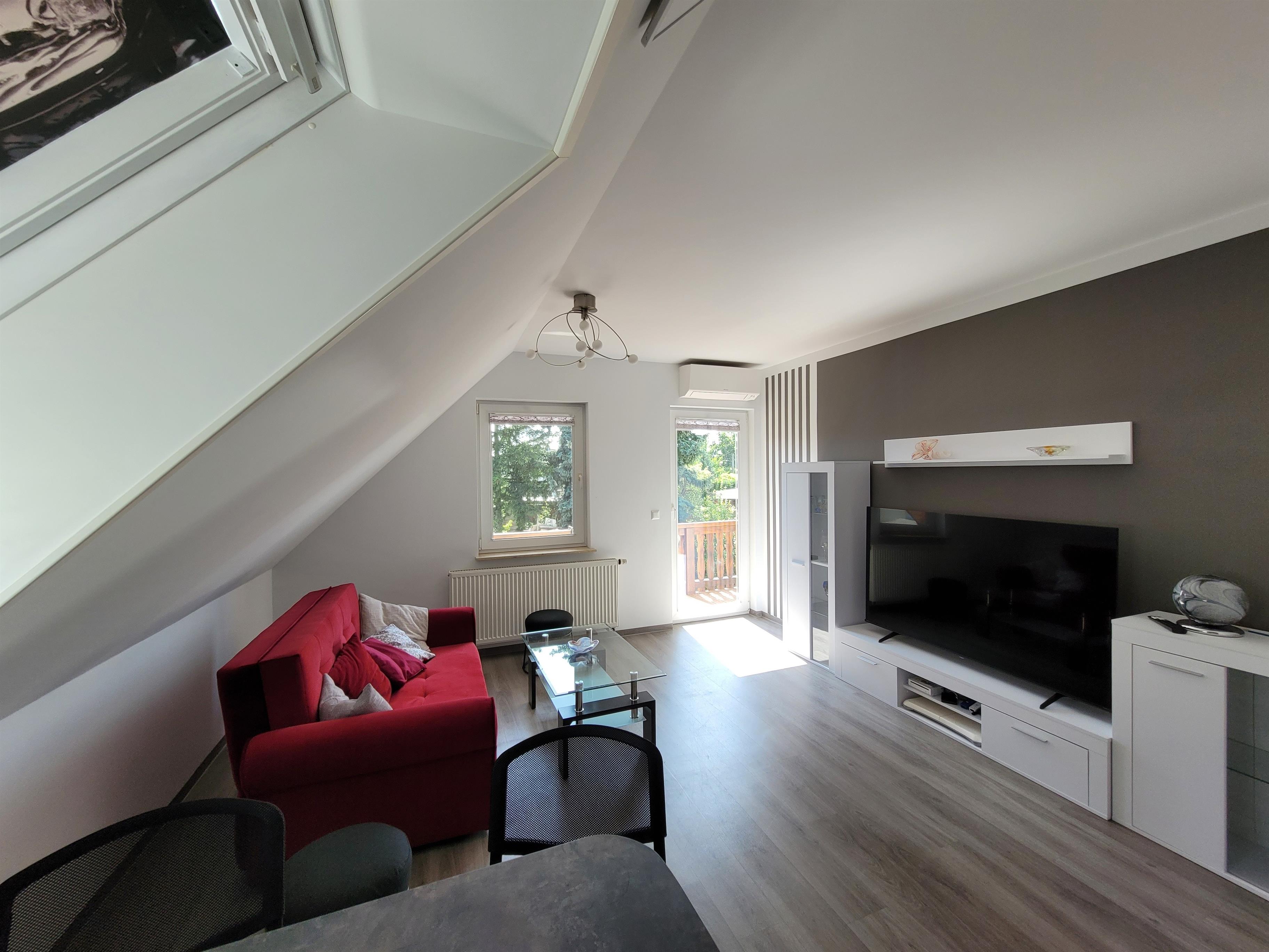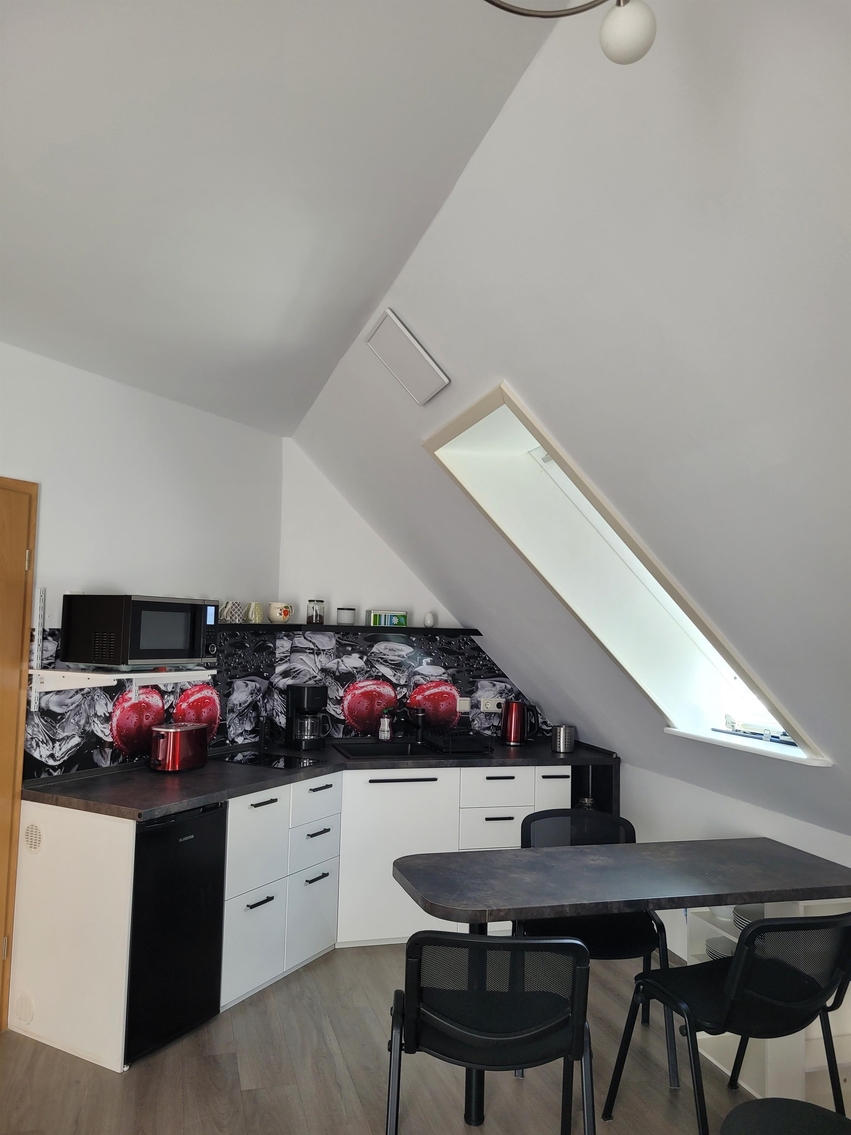 Im OG befinden sich die Wohnküche, das Schlafzimmer, ein Bad und ein Balkon. In der Wohnküche steht eine ausziehbare Couch (für maximal 2 zusätzliche Personen) ein großer Flachbild-TV, ein kleiner Esstisch und Stühle. Sie ist zudem mit einem Kombigerät Microwelle/Heißluft/Grill ausgestattet.