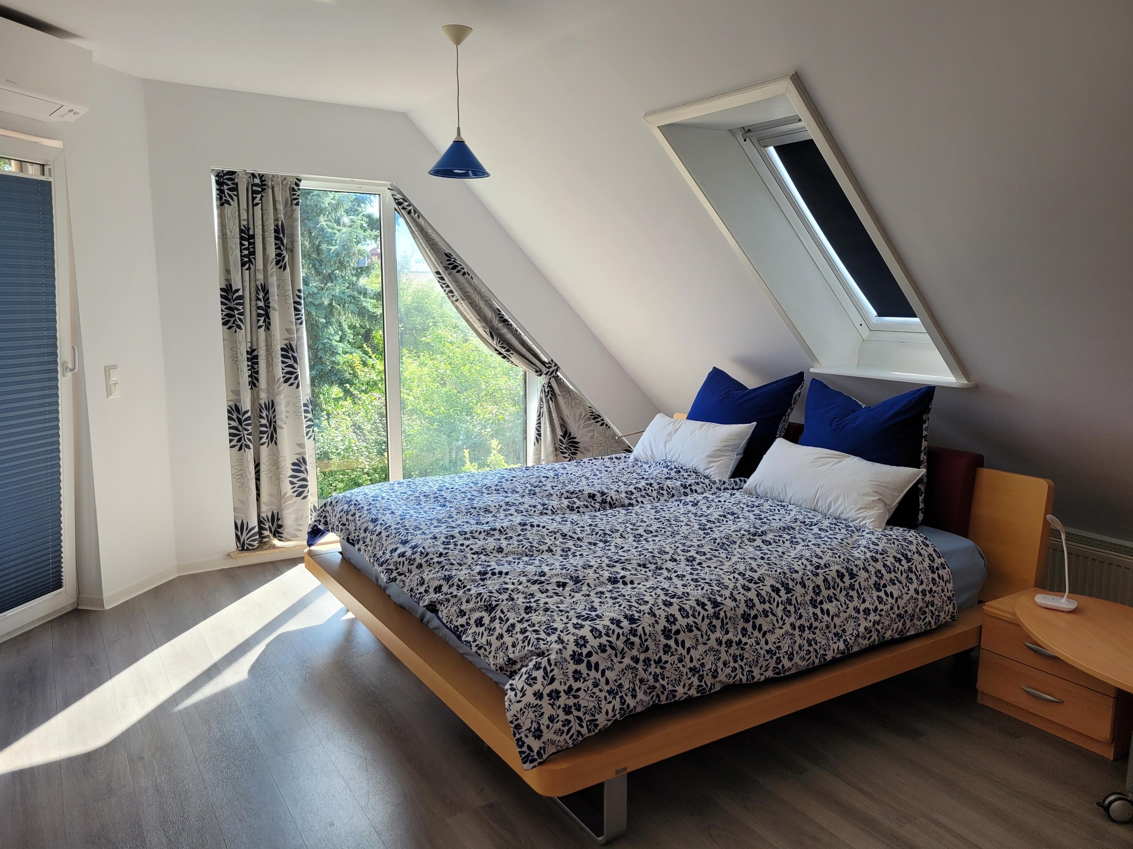Im Schlafzimmer steht ein großes Doppelbett (2,00m×2,00m), eine Lümmelcouch (für maximal 1 zusätzliche Person), Nachttische, ein Schreibtisch und Schränke.
