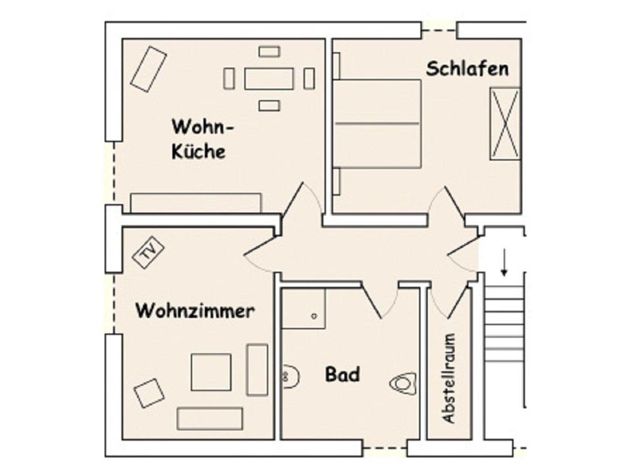 Wohnung (Dachgeschoß/ 2. Etage) mit Wohnküche, Wohnzimmer mit Sofabett, 1 Doppelschlafzimmer, SAT-TV, DVD-Player, Radio, Safe, Bügeleisen u. Bügelbrett, Haartrockner, alle Elektrogeräte, gemütliche Sitzecke im Hof