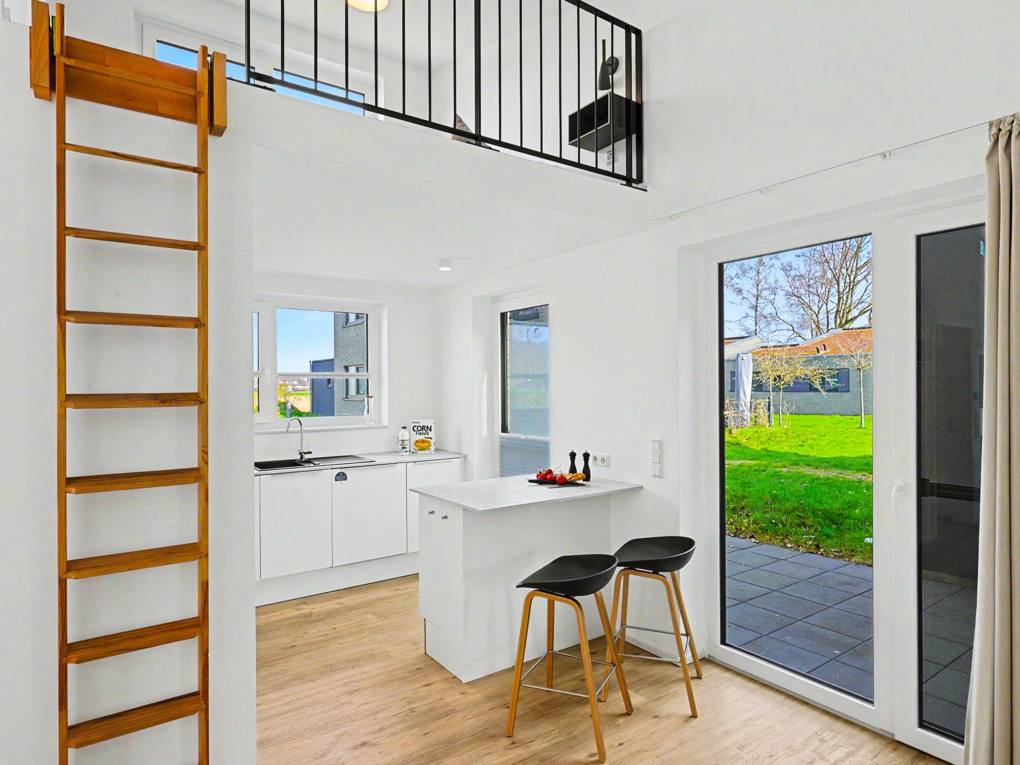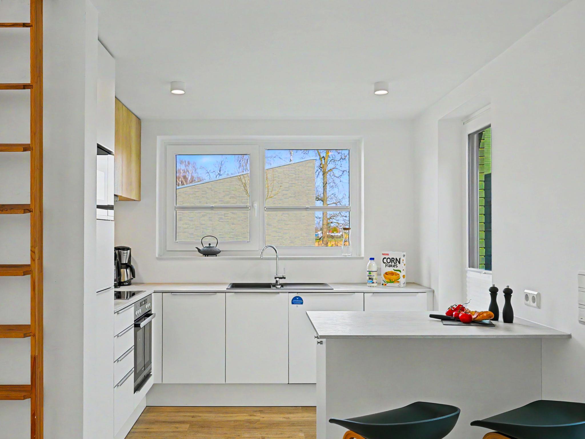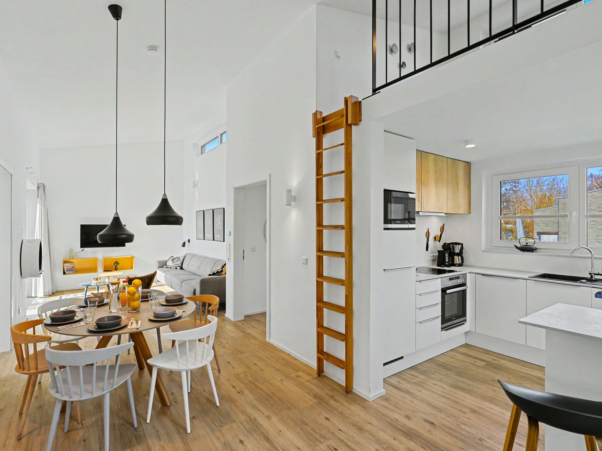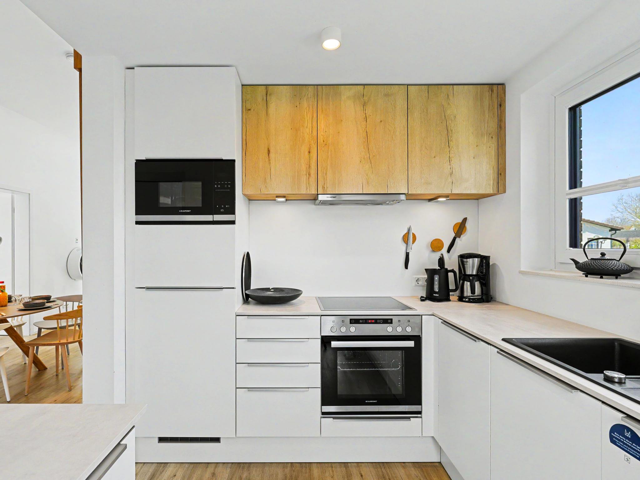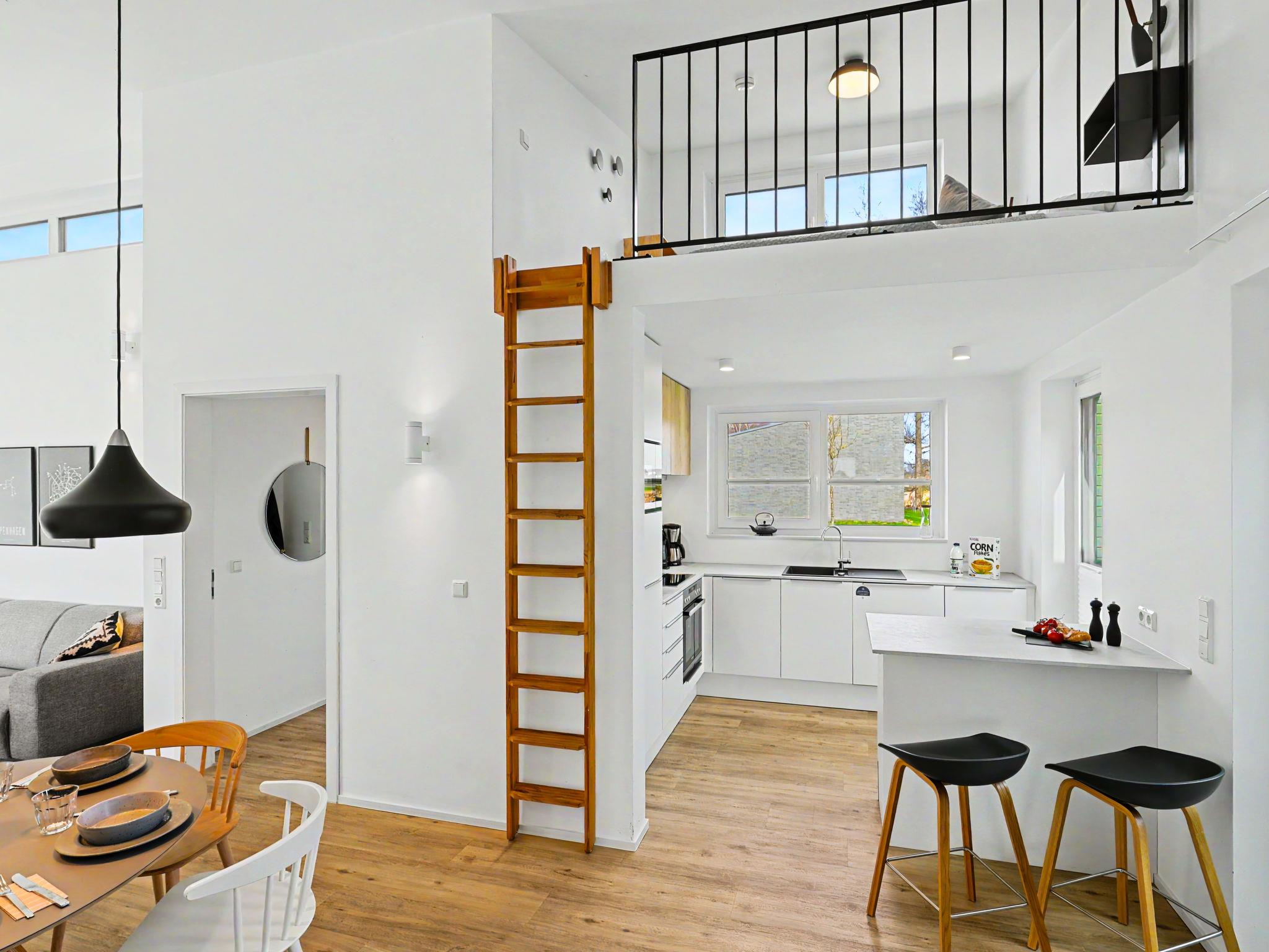 "Küstenzauber (282)", 3-room house 85 m2 on 2 levels. Tasteful and cosy furnishings: living/dining room with satellite TV (flat screen). Exit to the terrace. 2 rooms, each room with 1 double bed (2 x 90 cm, length 200 cm). Open kitchen (oven, dishwasher, 4 ceramic glass hob hotplates, toaster, kettle, microwave, electric coffee machine). Bath/WC, shower/WC. Upper floor: (ladder) open gallery with sloping ceilings with 2 sleeping facilities. Terrace. Terrace furniture, electric barbecue. Facilities: washing machine, dryer, sauna, children's high chair (extra), hair dryer. Internet (WiFi, free). Please note: non-smoking house. Smoke alarm.