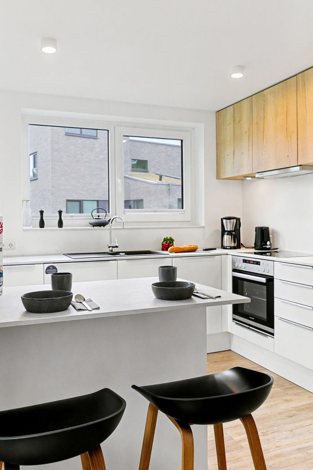 "Wellenklang", 3-room house 85 m2 on 2 levels. Tasteful and cosy furnishings: living/dining room with satellite TV (flat screen). Exit to the terrace. 2 rooms, each room with 1 double bed (2 x 90 cm, length 200 cm). Open kitchen (oven, dishwasher, 4 ceramic glass hob hotplates, toaster, kettle, microwave, electric coffee machine). Bath/WC, shower/WC. Upper floor: (ladder) open gallery with sloping ceilings with 2 sleeping facilities. Terrace. Terrace furniture, electric barbecue. Facilities: washing machine, dryer, sauna, children's high chair (extra), hair dryer. Internet (WiFi, free). Please note: non-smoking house. Smoke alarm.