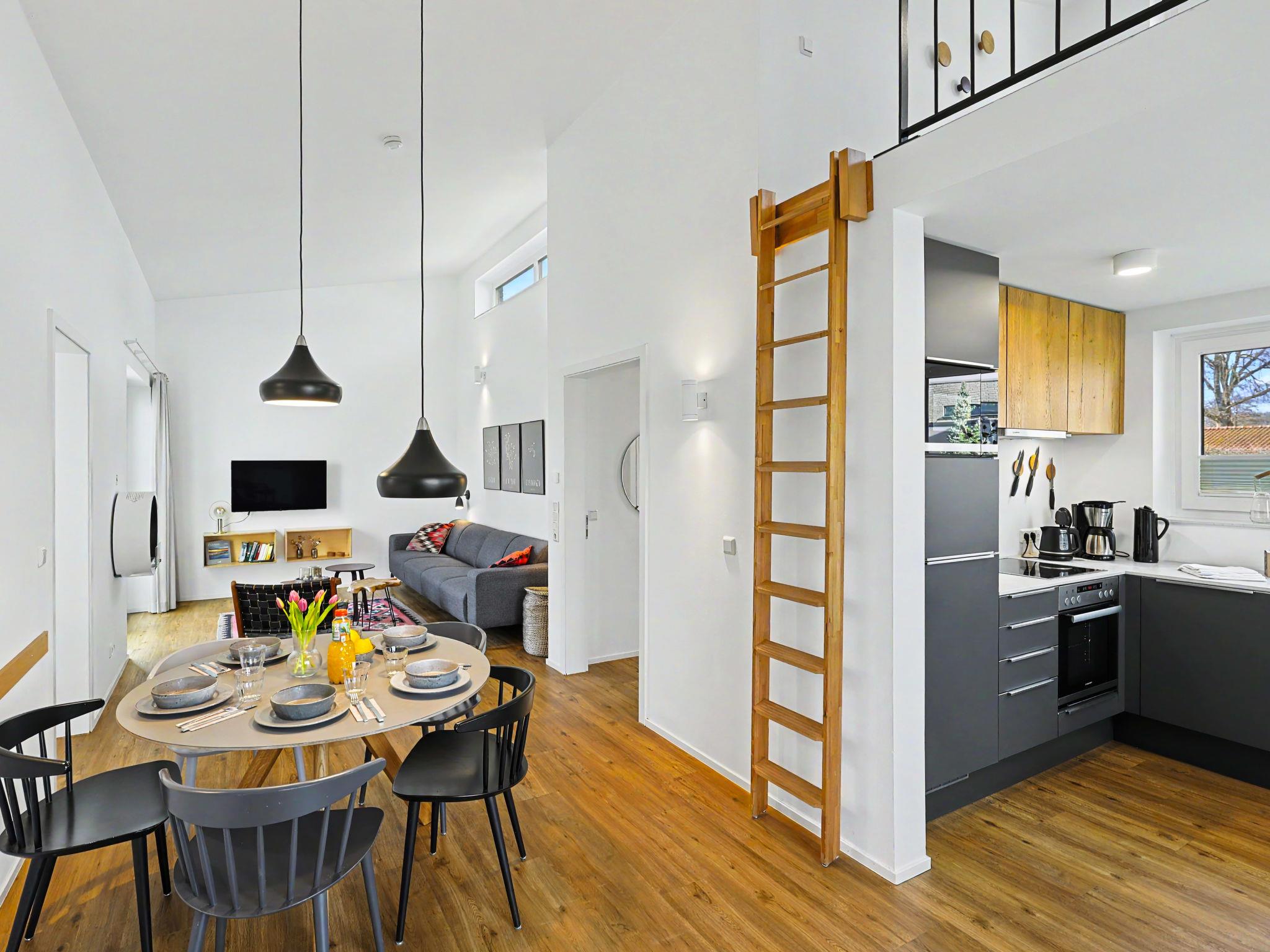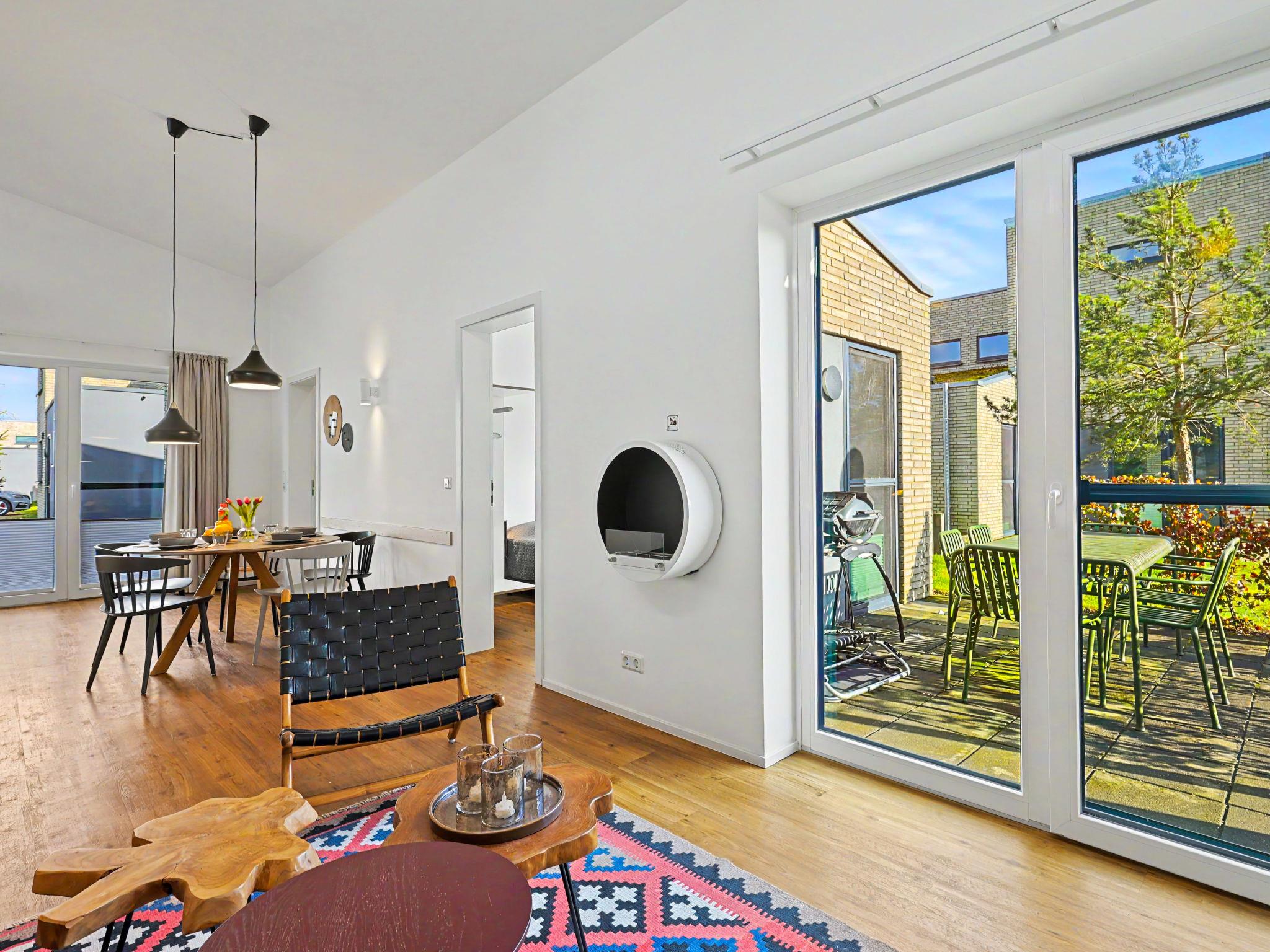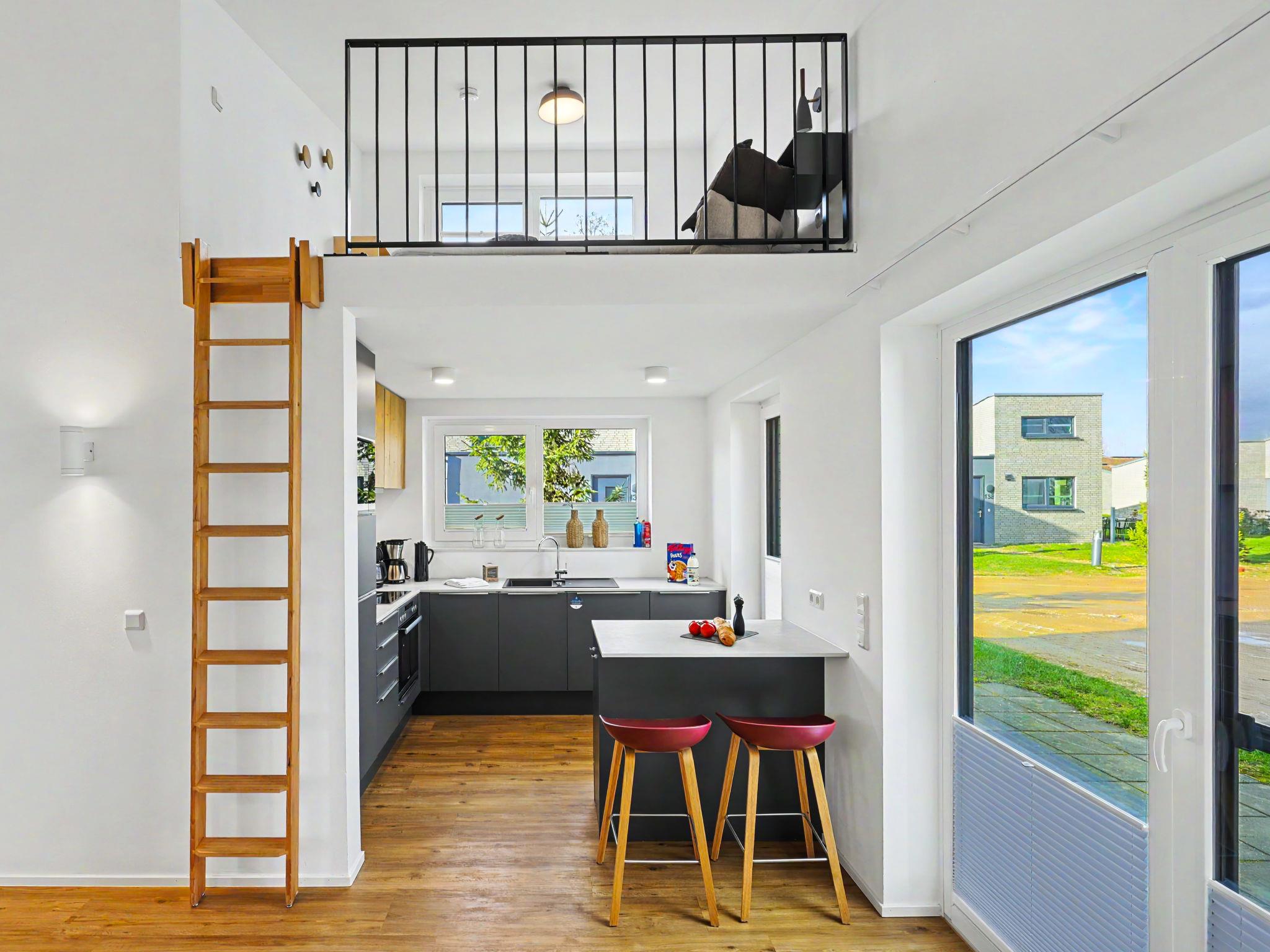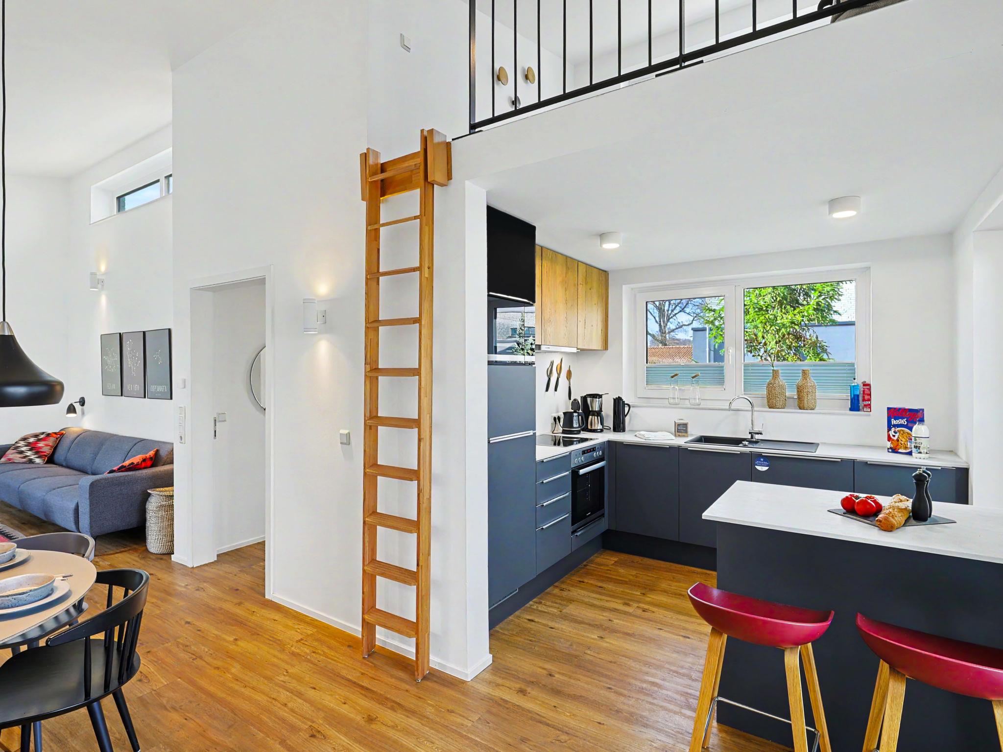 "Seezeit", 3-room house 85 m2 on 2 levels. Tasteful and cosy furnishings: living/dining room with satellite TV (flat screen). Exit to the terrace. 2 rooms, each room with 1 double bed (2 x 90 cm, length 200 cm). Open kitchen (oven, dishwasher, 4 ceramic glass hob hotplates, toaster, kettle, microwave, electric coffee machine). Bath/WC, shower/WC. Upper floor: (ladder) open gallery with sloping ceilings with 2 sleeping facilities. Terrace. Terrace furniture, electric barbecue. Facilities: washing machine, dryer, sauna, children's high chair (extra), hair dryer. Internet (WiFi, free). Please note: non-smoking house. Smoke alarm.