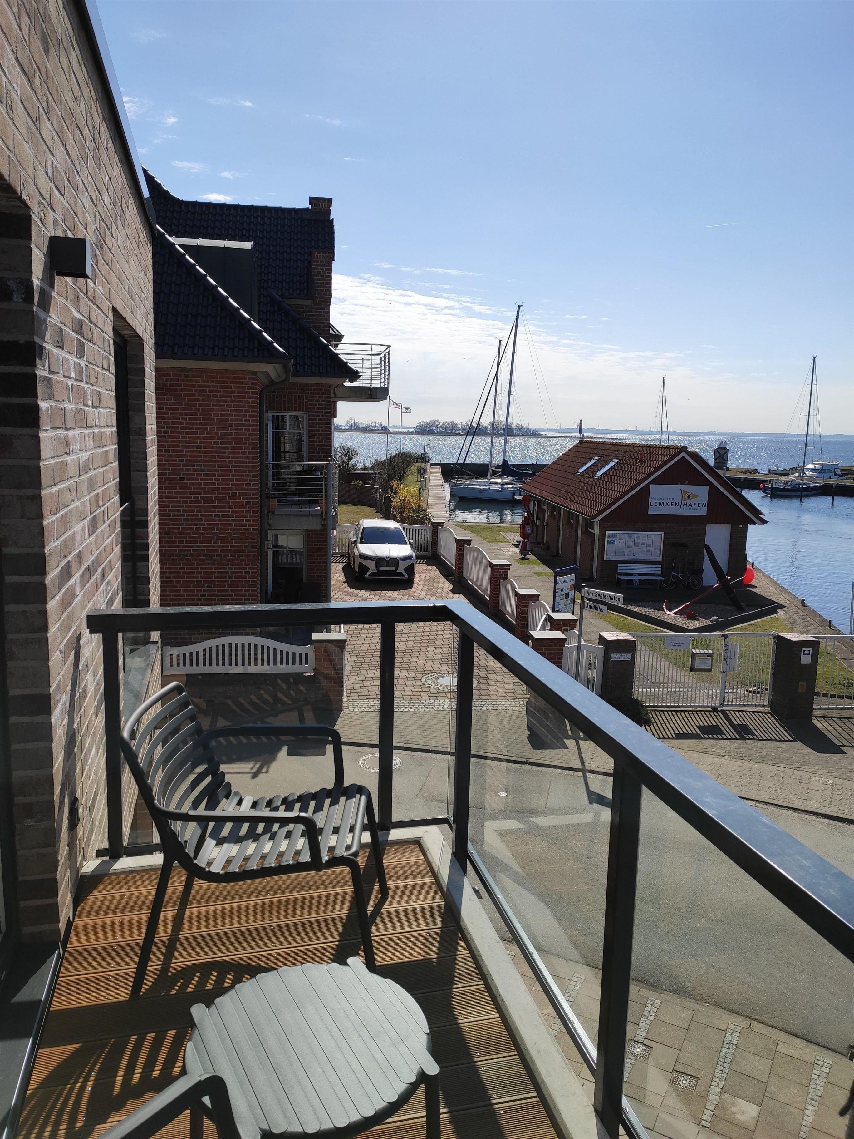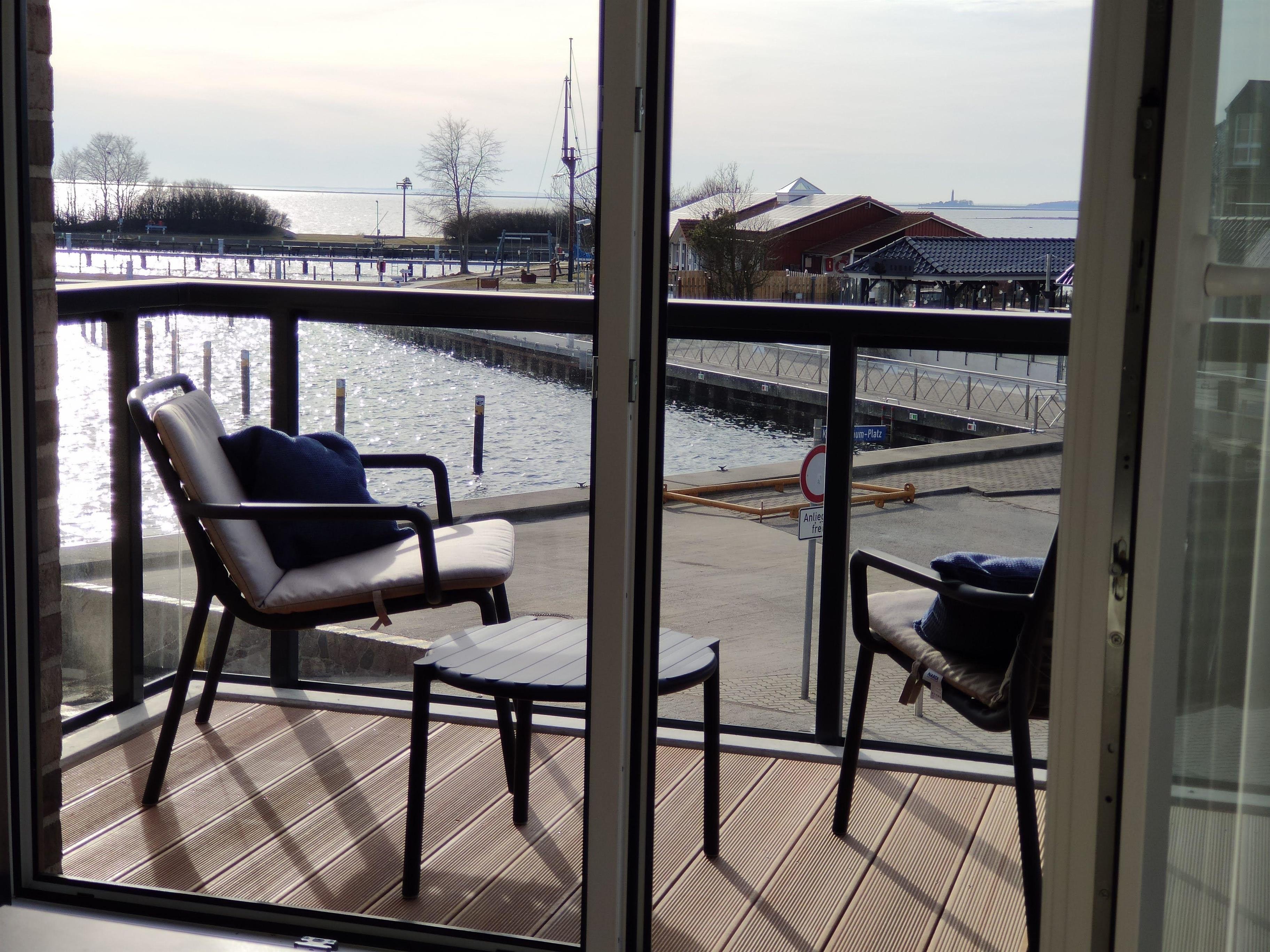 Der Balkon (4,3 qm) , belegt mit hochwertigen Bangkirai-Terrassen-Dielen, bietet einen traumhaften Blick auf den Hafen und die Orther Bucht. Das Geländer mit Glasfüllung schützt vor Wind an kühleren Tagen, ohne den Blick vom Liegestuhl auf die Ostsee zu versperren.