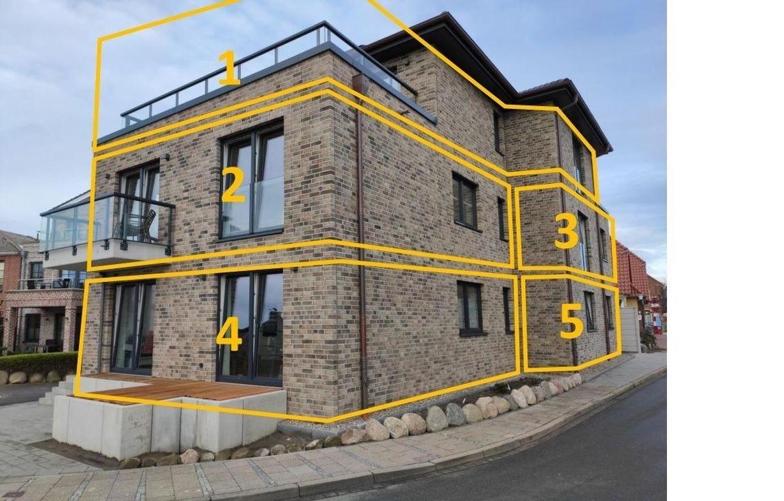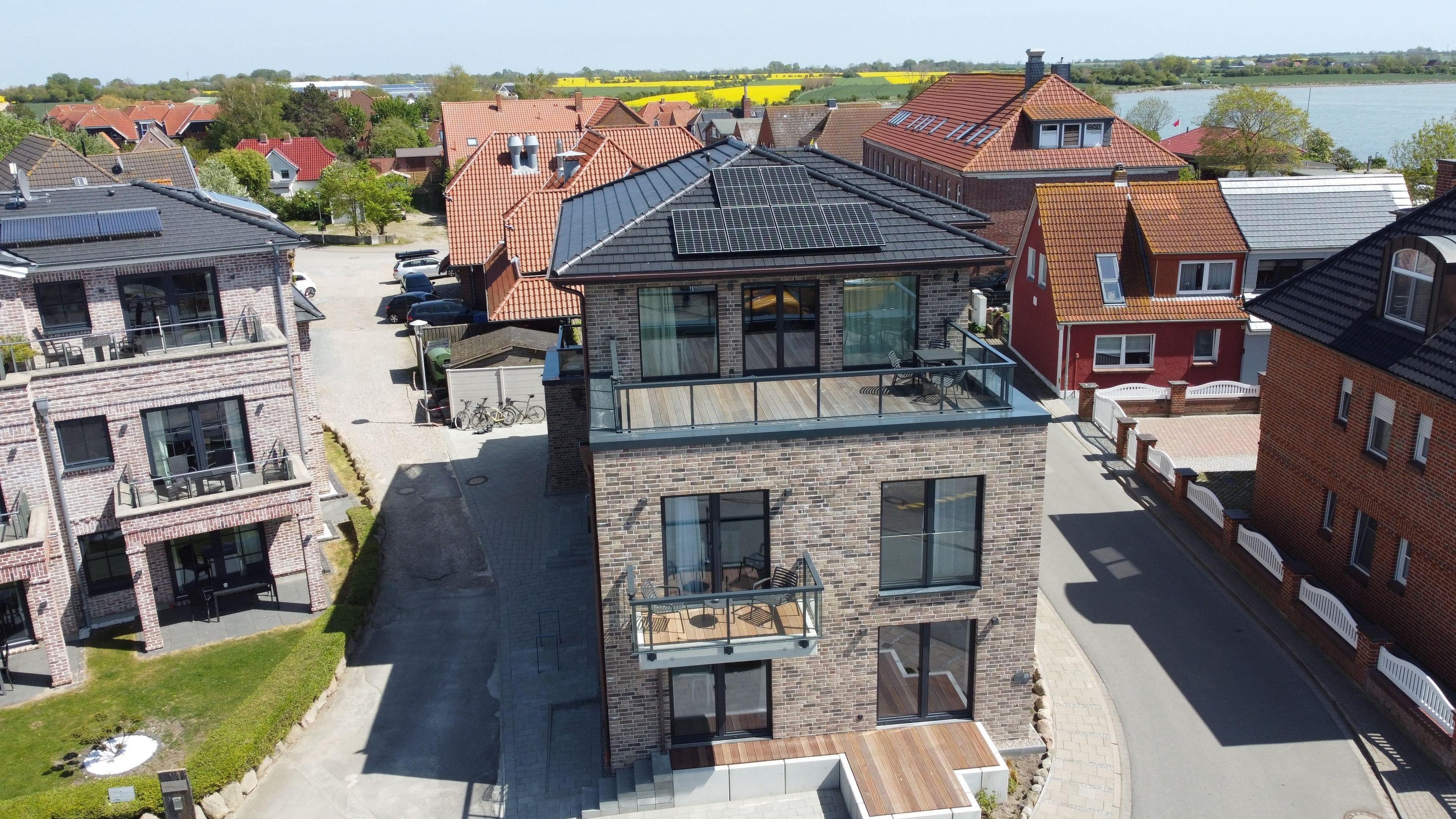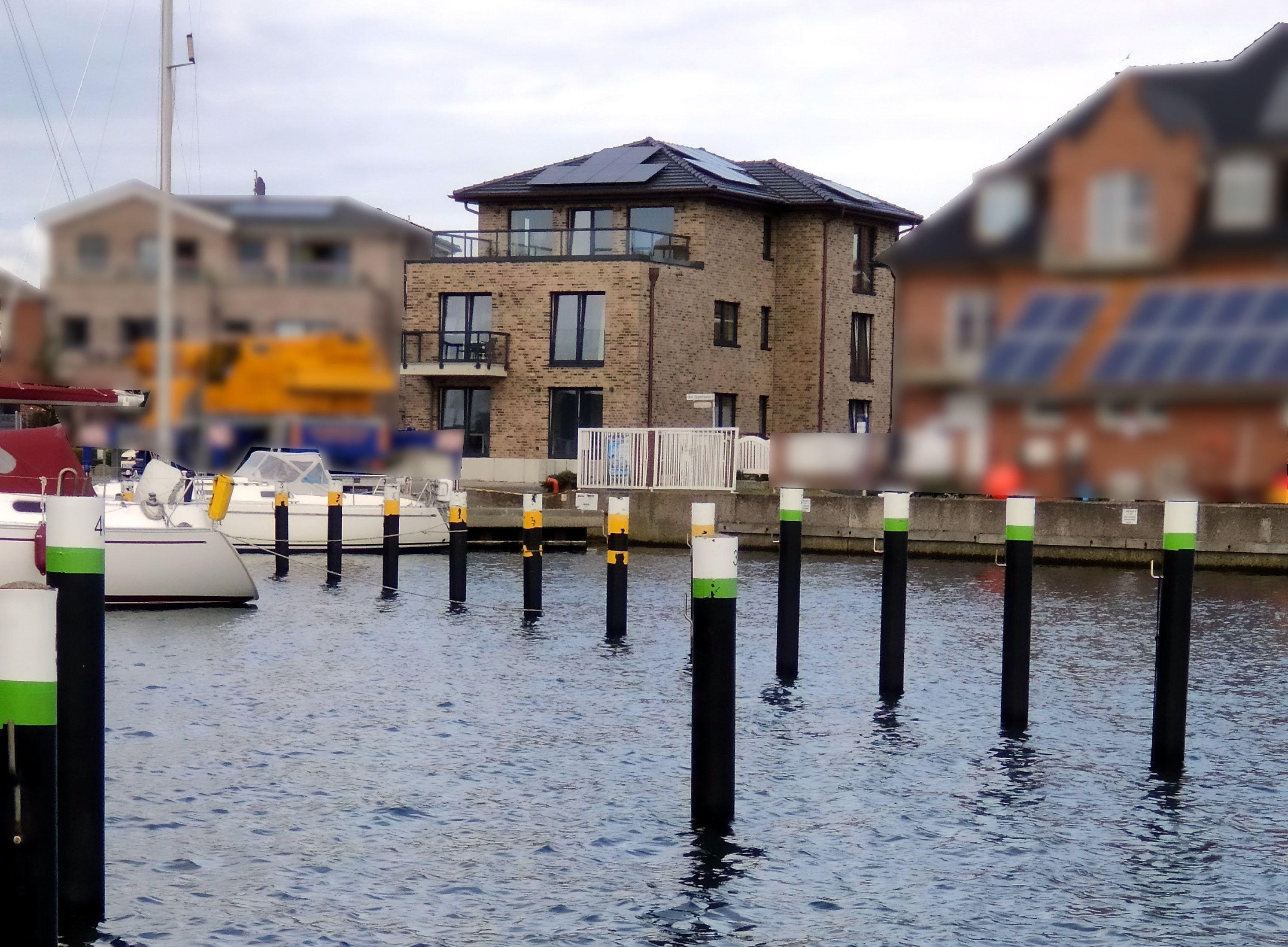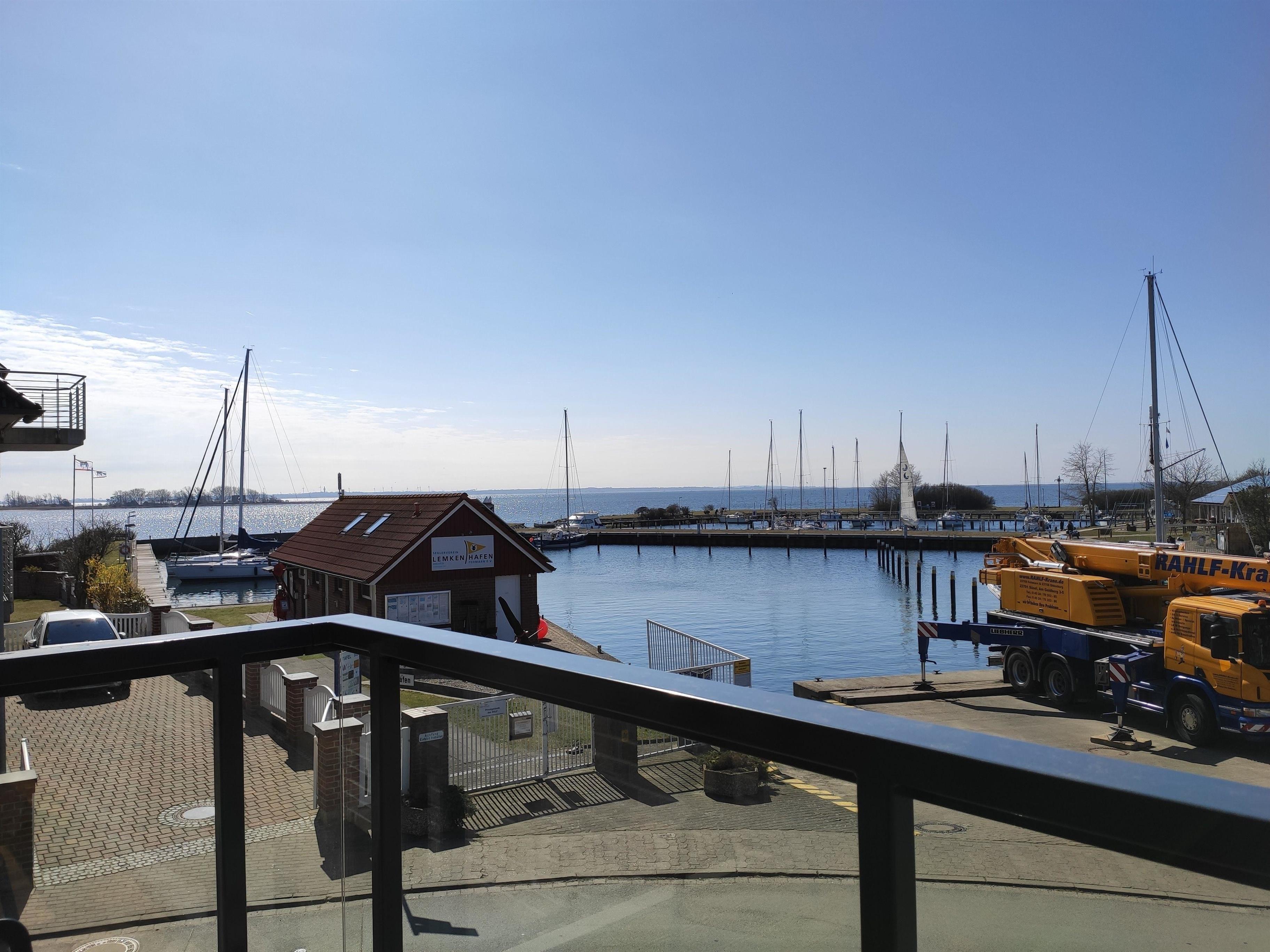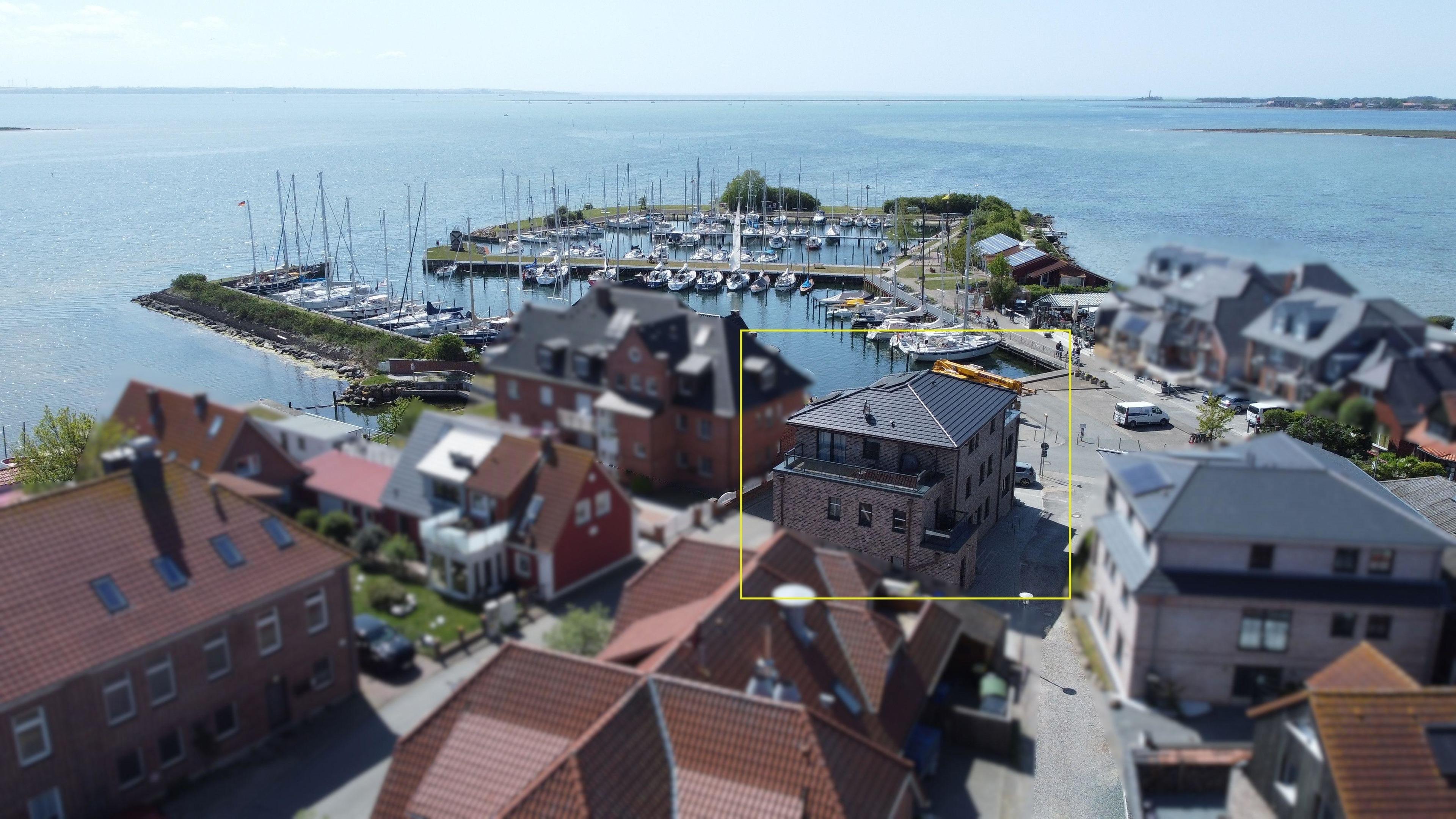 Die Wohnung liegt im Obergeschoss eines neu gebauten Hauses direkt am Hafen des Ortes Lemkenhafen auf Fehmarn.