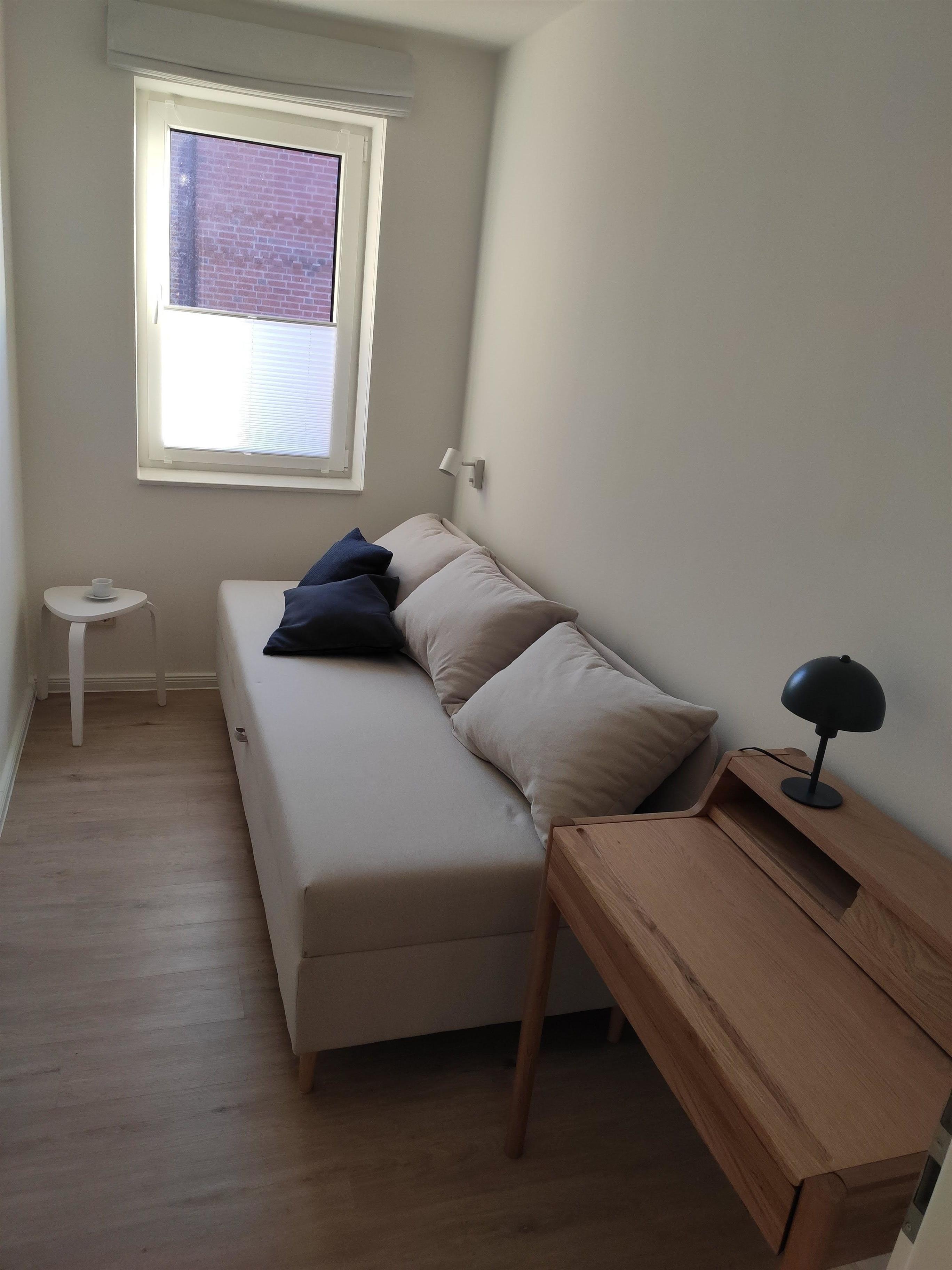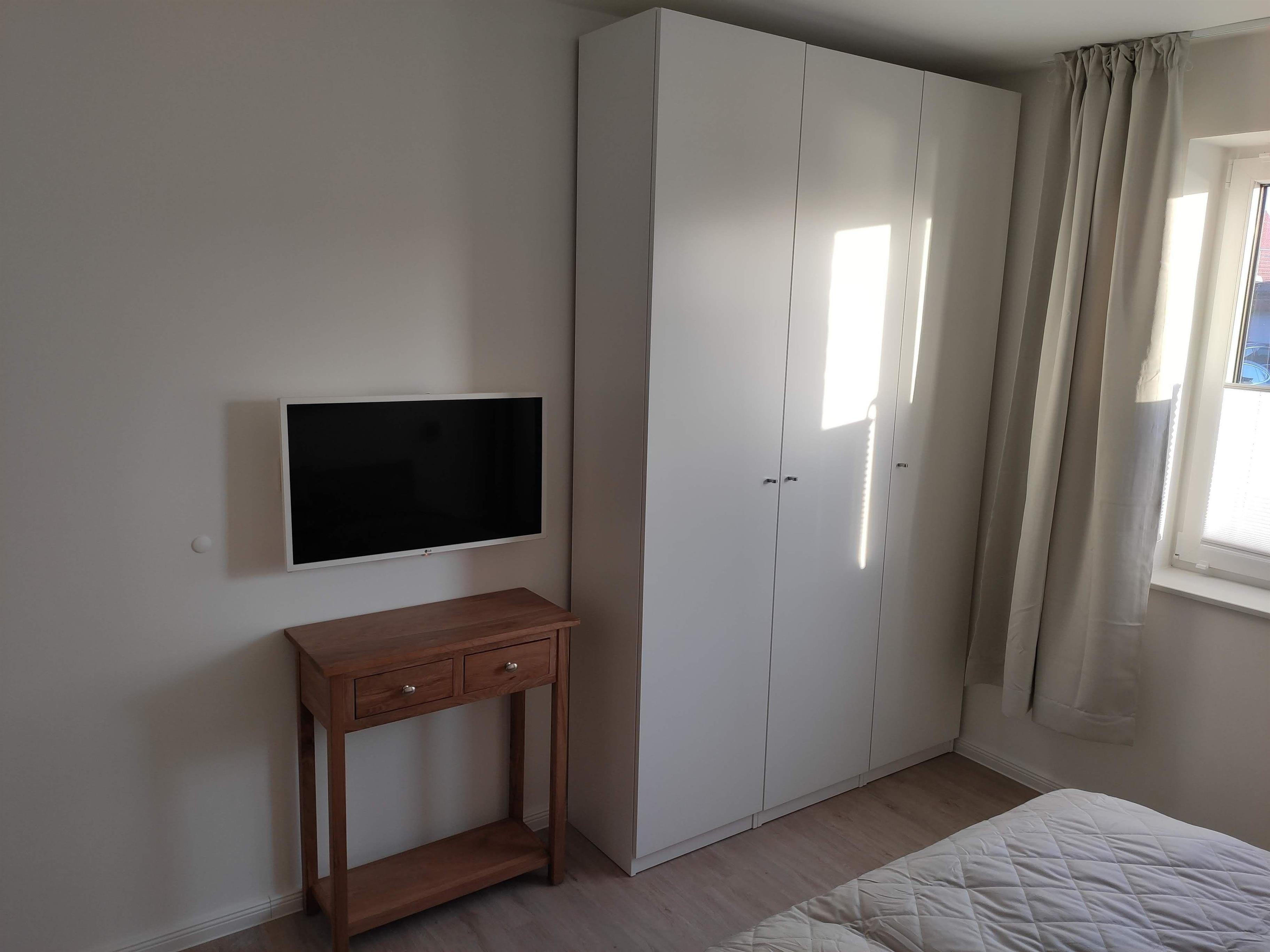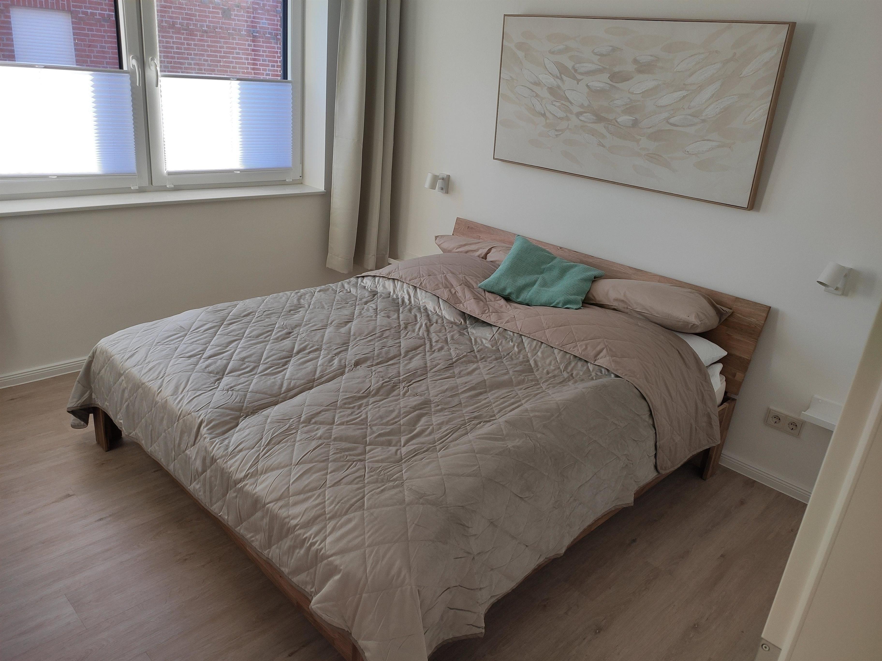 Das Schlafzimmer ist mit einem Doppelbett (2 Matratzen 90 x 200) ausgestattet. Durch die Fenster genießen Sie den Blick auf die Ostsee mit Fehmarnsundbrücke und seitlich auf den Hafen. Das 32 Zoll Smart-TV erlaubt den Empfang von Satelliten-TV und die Nutzung gängiger Streaming-Dienste über das Internet.