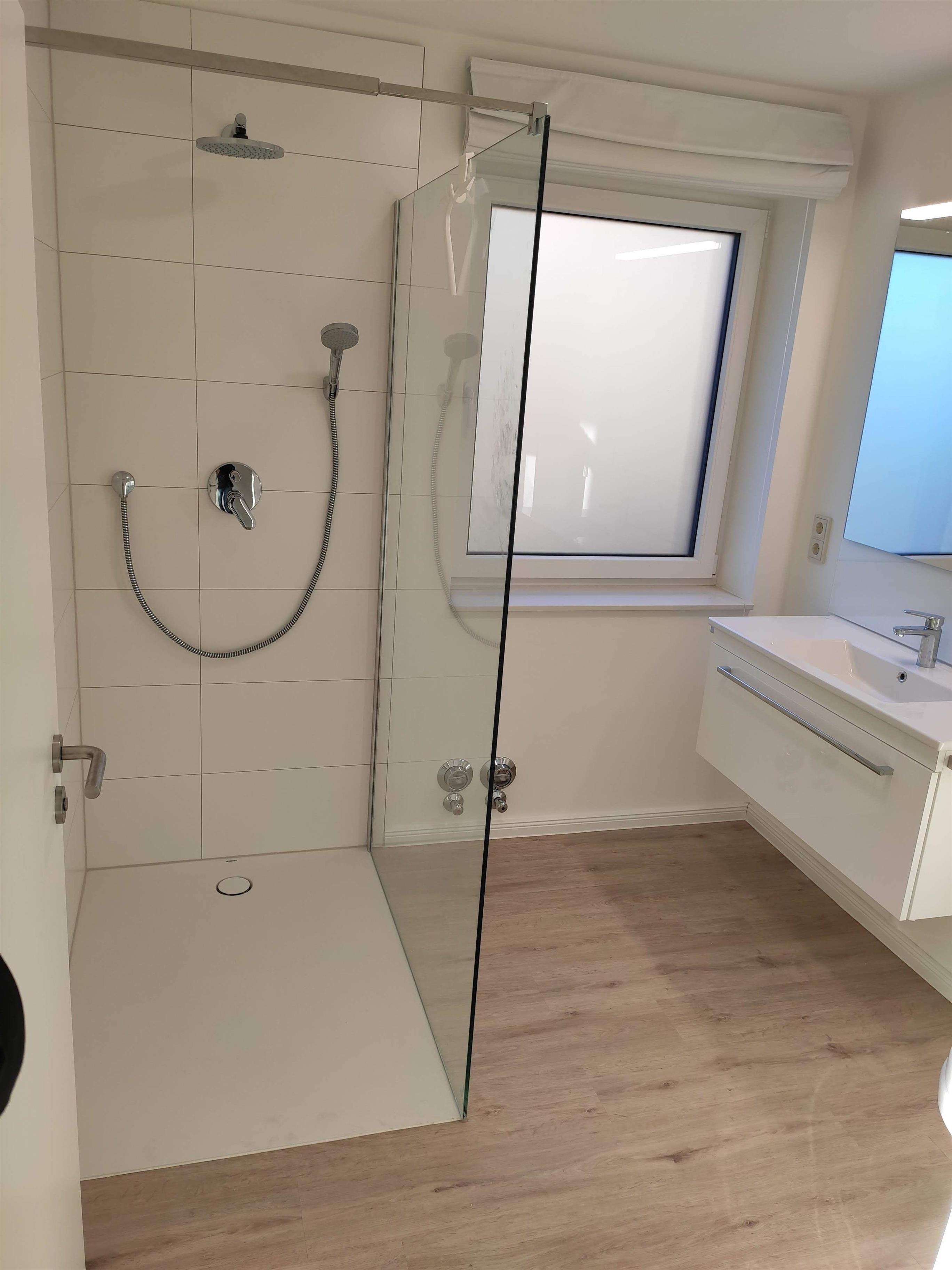 Das Bad verfügt neben Waschtisch und Wand-WC über eine Walk-In-Dusche mit Rain-Shower (Kopfbrause).