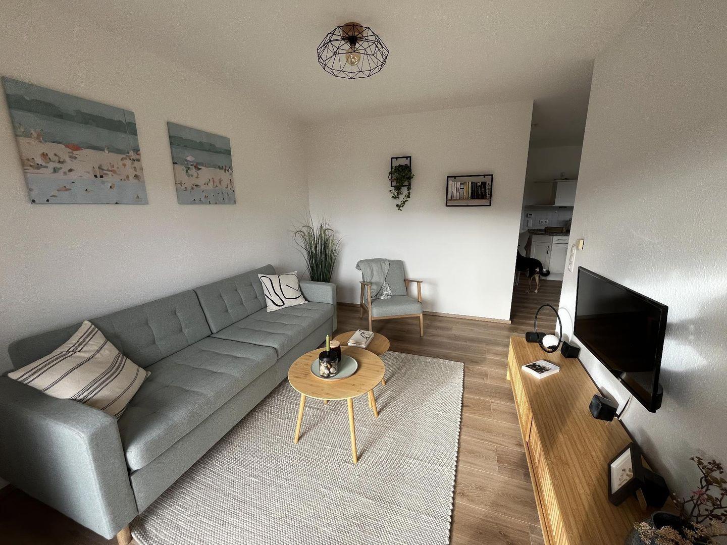 Das Wohnzimmer verfügt über ein Ausziehsofa (1,40m x 2,00m) ist hell und freundlich eingerichtet, von dort geht man auf die Südterrasse mit Gartenmöbeln und eigenem Strandkorb.