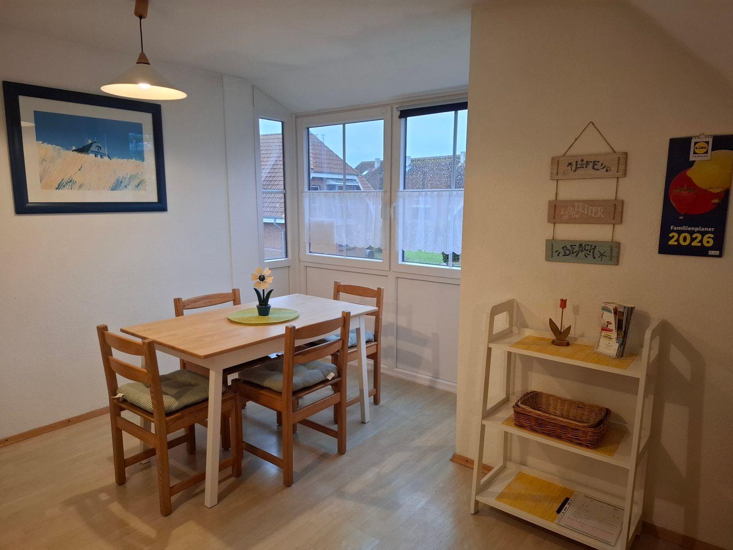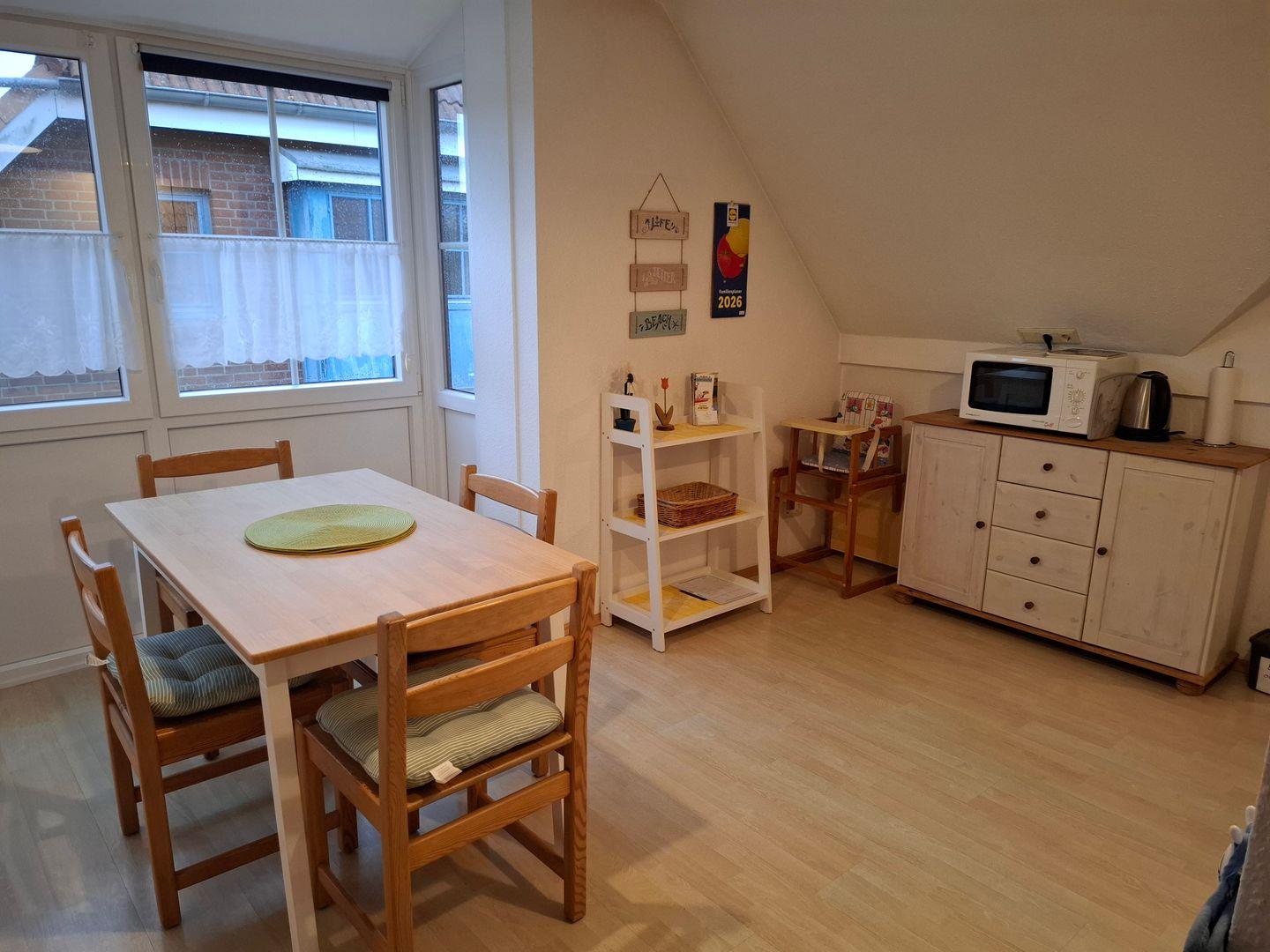 Die helle und gemütliche Wohnung mit knapp 50 m² Wohnfläche befindet sich im 1. Obergeschoss eines Ferienhauses mit 4 Wohneinheiten und ist mit allem Erforderlichen für max. 3 Personen ausgestattet. Eine Küchenzeile mit diversen Geräten ist selbstverständlich vorhanden. Außerdem haben Sie eine Mikrowelle mit Grillfunktion, Geschirrspüler, Kaffeemaschine, Toaster, Wasserkocher, Eierkocher und sogar ein Waffeleisen zur Verfügung. Die Wohnung ist liebevoll mit maritimen Gedanken und Retroakzenten eingerichtet. Das Bad wurde in 2023 komplett renoviert. Für Ihren kleinsten Nachwuchs stehen ein Reisekinderbett, Hochstuhl und Toilettenaufsatz bereit.