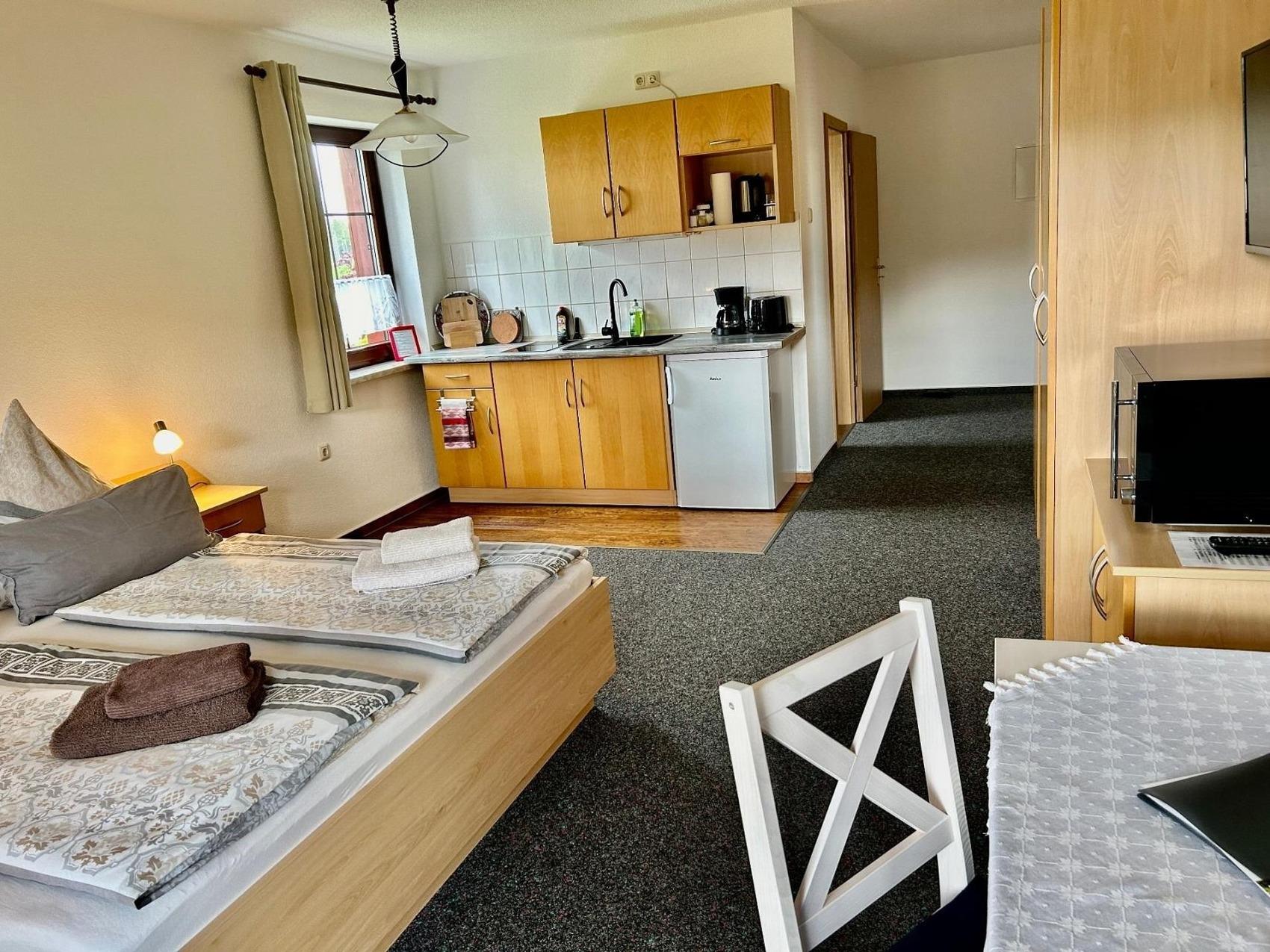 Ein-Raum-FeWo mit Küchenzeile, Essecke, Tageslicht-Bad und Balkon mit schöner Aussicht.