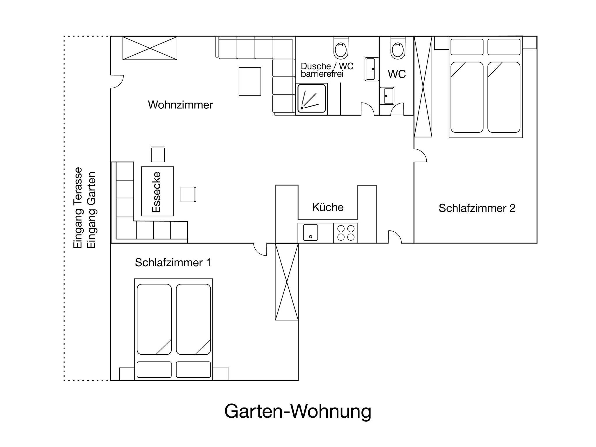 In unserer Gartenwohnung bleiben keine Wünsche offen: Sie verfügt über ein Wohnzimmer mit Couch, Essecke und einem großen Panoramafenster, 2 getrennte Schlafzimmer mit Doppelbetten, komplett ausgestattete Küche, barrierefreie Dusche/WC, zusätzliche Toilette extra und einen eigenen Garten mit Terrasse. Selbstverständlich können Sie zusätzlich den riesigen Gemeinschaftsgarten nutzen.