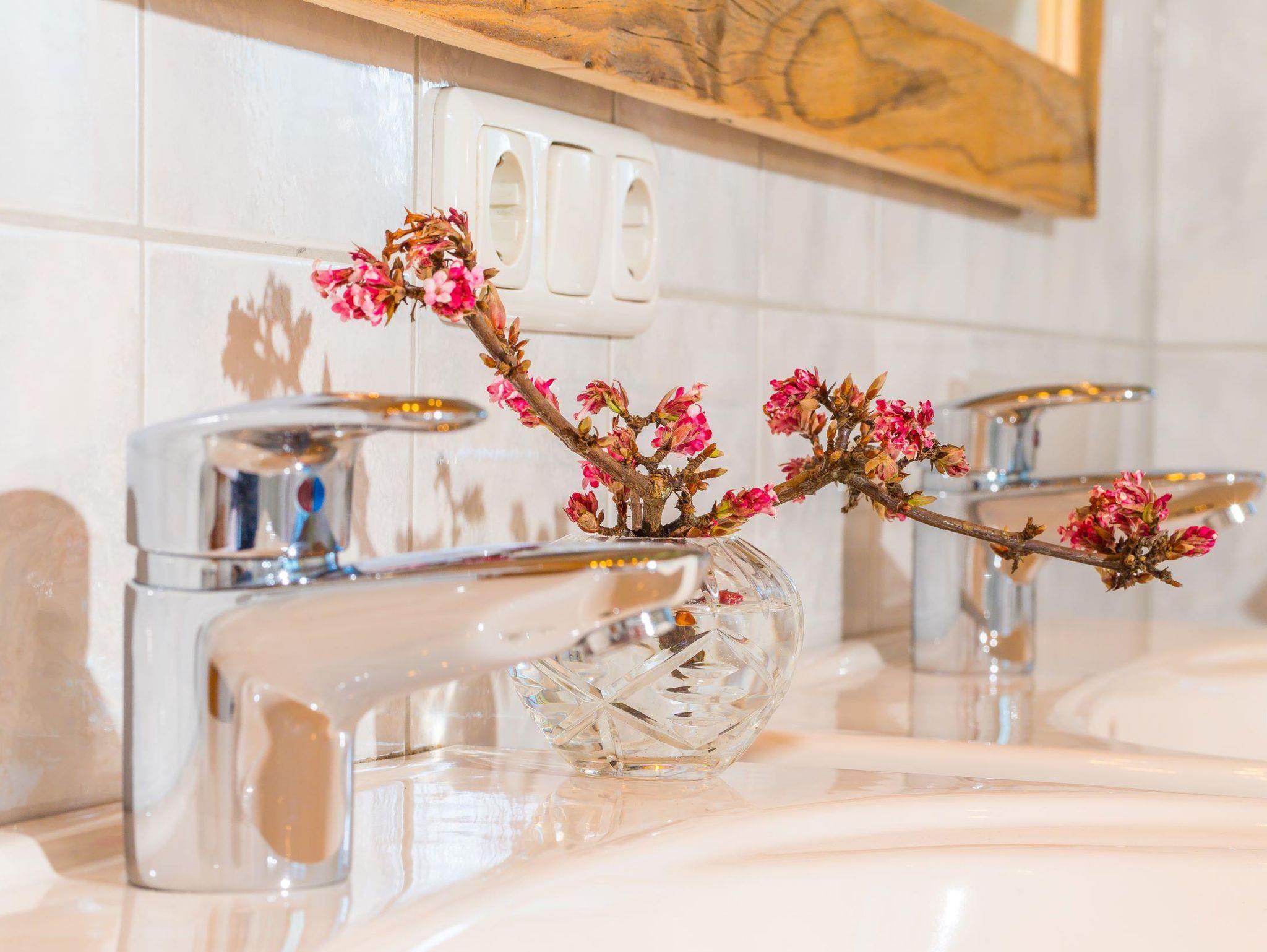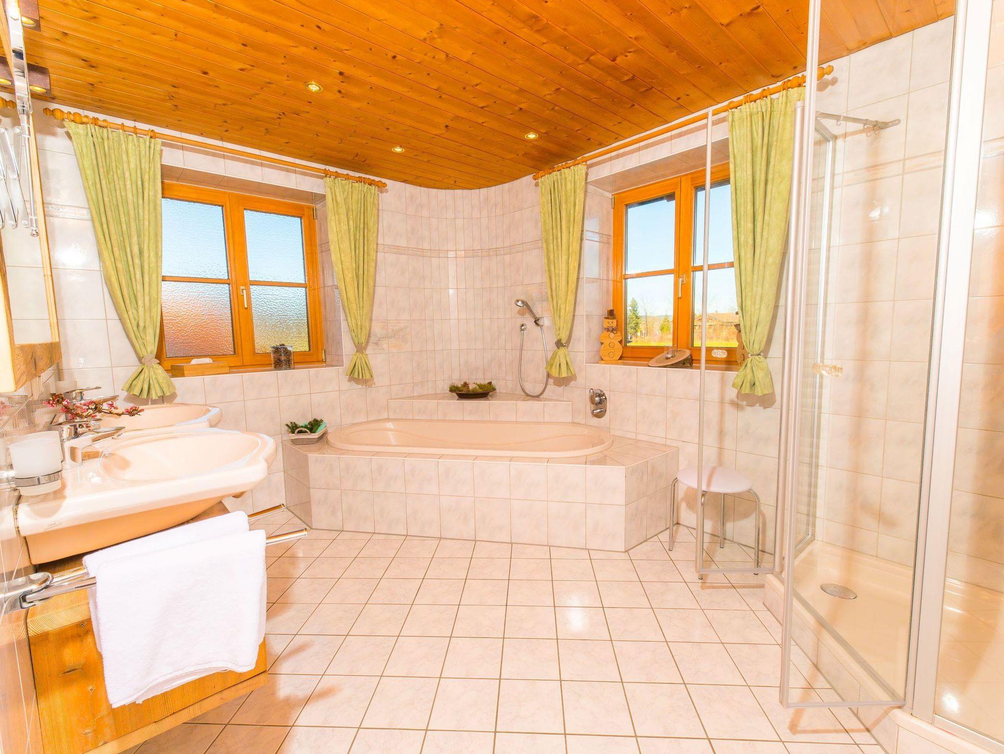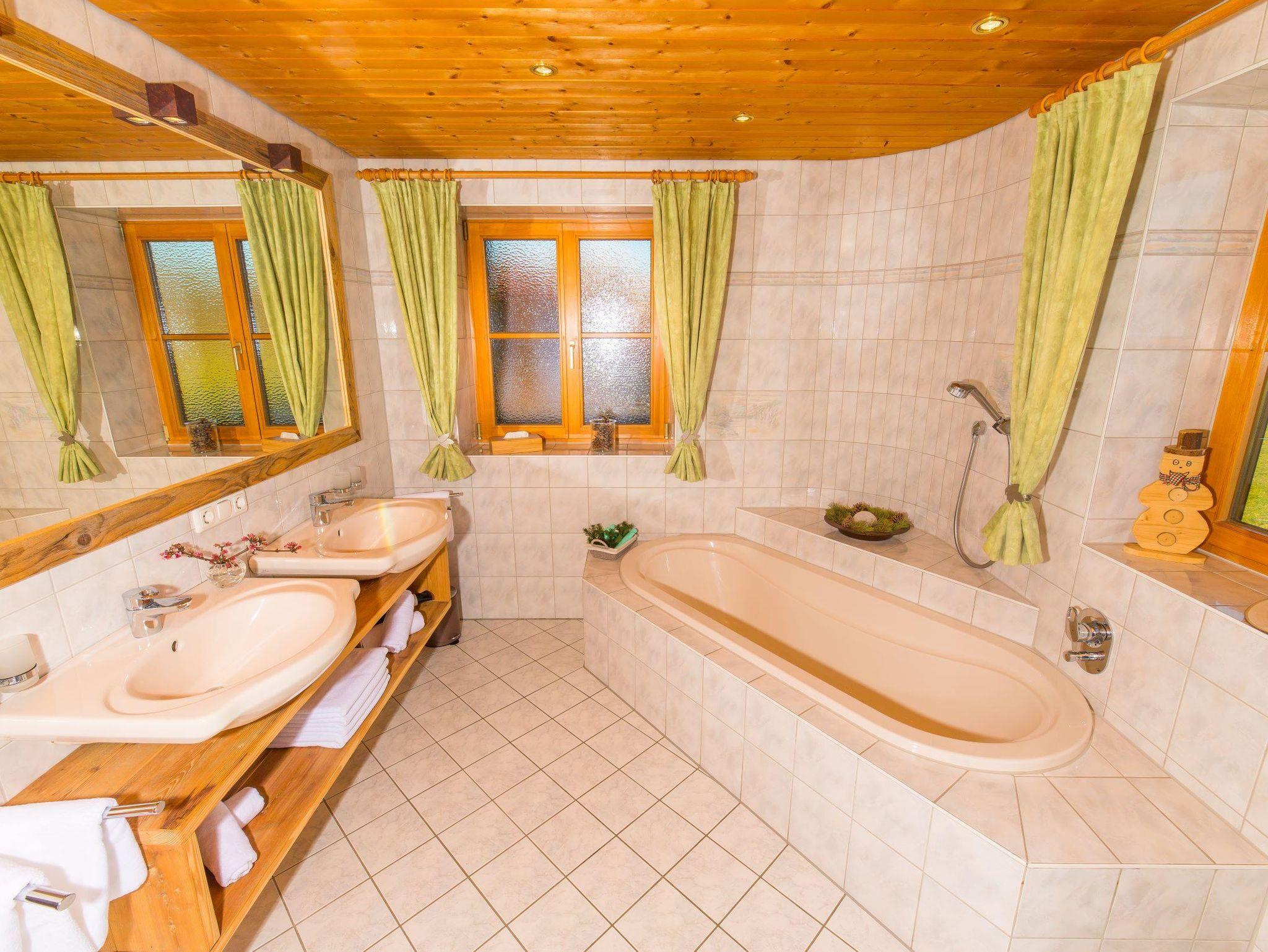 Badezimmer mit Wanne, 2 Waschbecken, Dusche sowie abgetrennter Toilette.