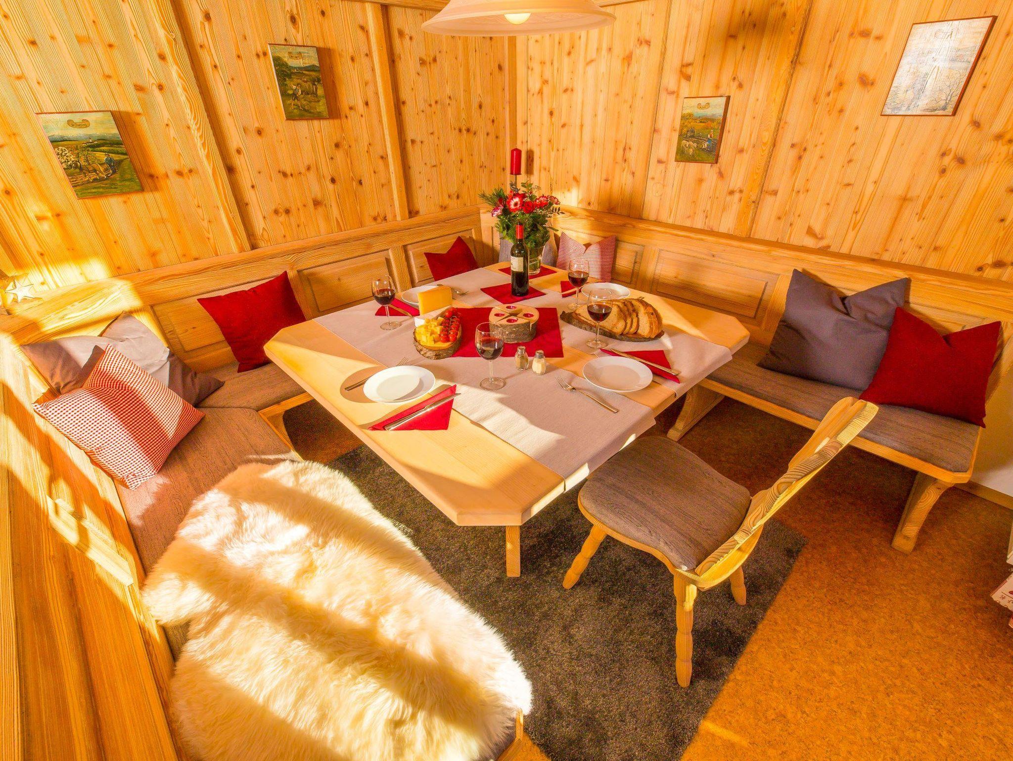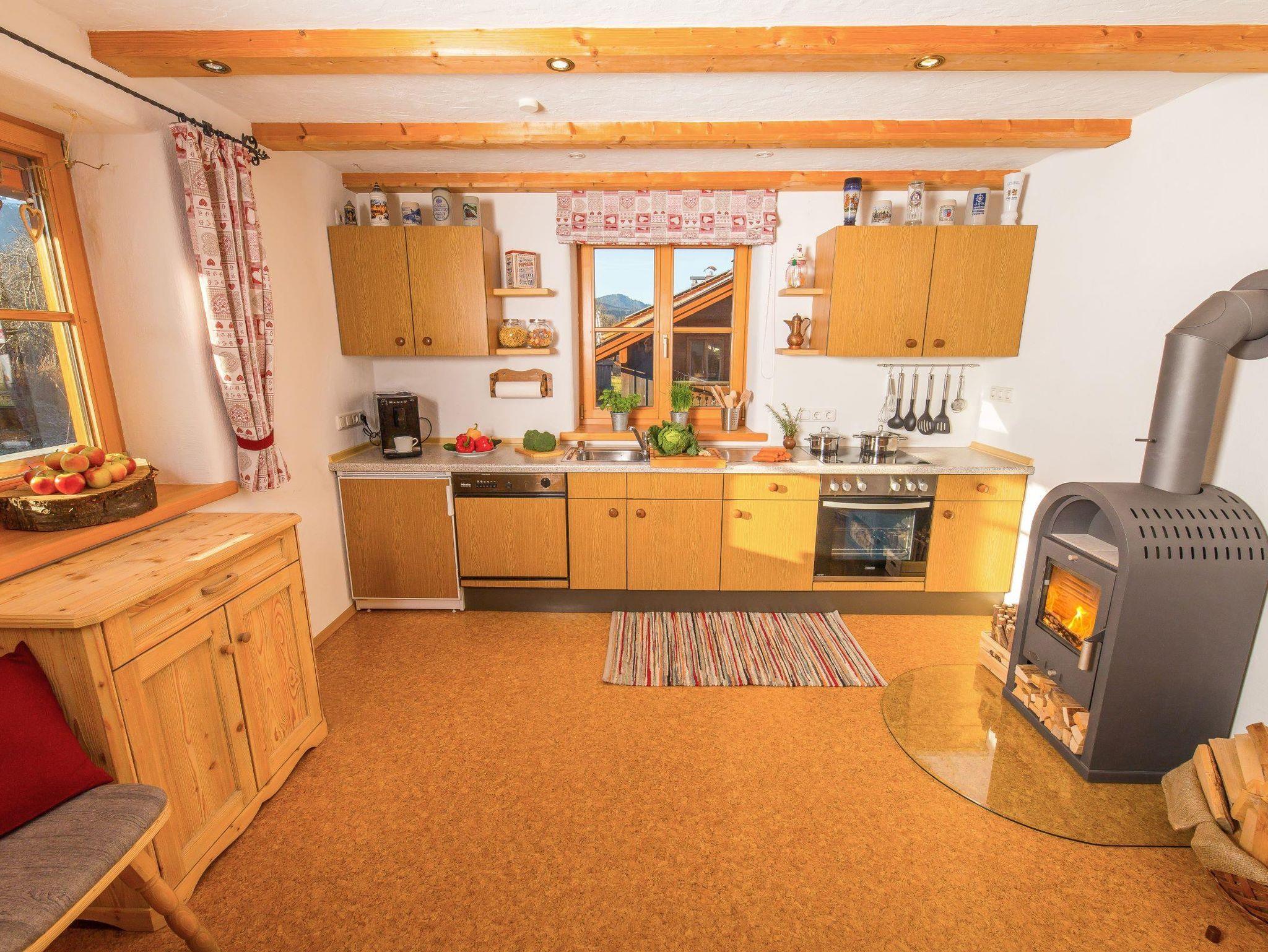 Komplett ausgestattete Wohnküche, Kamin mit kostenl. Feuerholz, urige Eckbank mit großem Tisch.