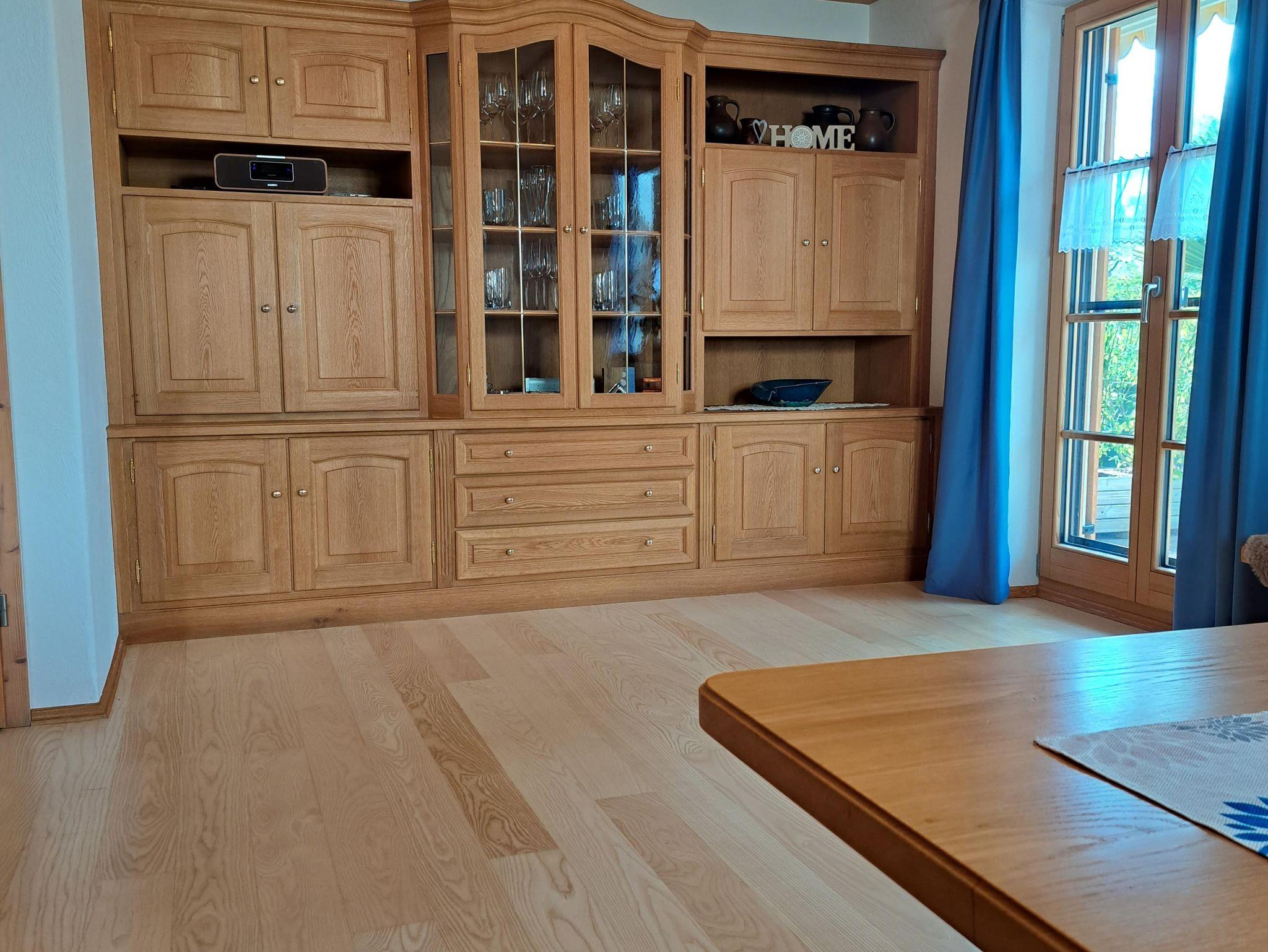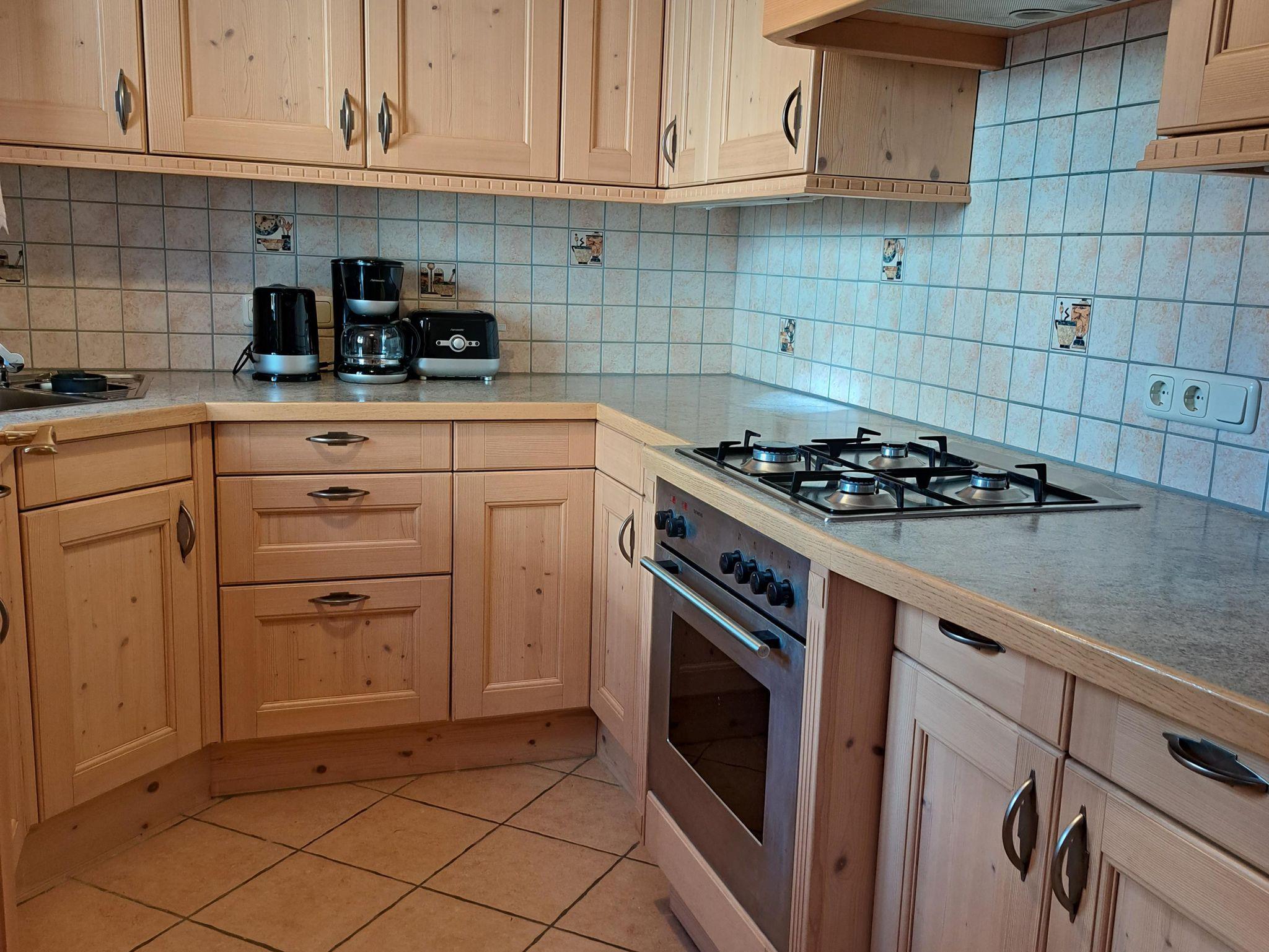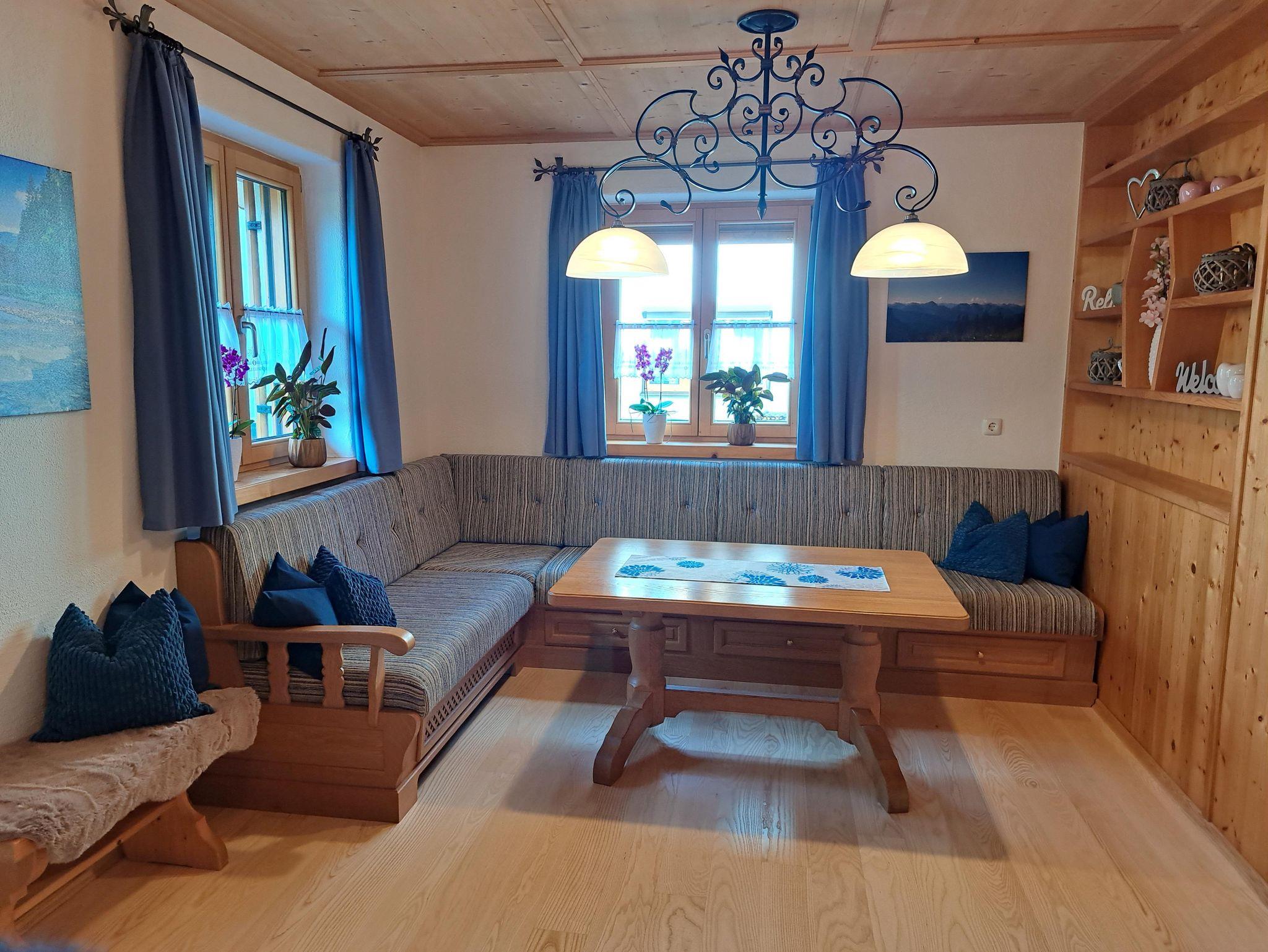 Die Ferienwohnung ist in zwei Ebenen aufgeteilt. Im EG finden Sie das Gäste-WC und die Garderobe. Die separate vollausgestattete Küche beinhaltet einen Kühlschrank und Gefrierschrank, einen Gasherd und -backofen, sowie eine Kaffeemaschine, Wasserkocher, Toaster und Spülmaschine. Das Ess- und Wohnzimmer ist mit einer Trennwand abgeteilt und mit einem Kachelofen ausgestattet, sowie Smart-TV, DVD, Radio und CD. Im 1. OG befindet sich ein Doppelzimmer und ein Mehrbettzimmer mit drei einzelnen Betten. Im Badezimmer gibt es neben dem Waschbecken ein WC, eine Dusche und eine Badewanne. Das Badezimmer hat zudem eine Fußbodenheizung. Bettwäsche u. Handtücher werden bereitgestellt. Kinderhochstuhl ist vorhanden. Auf Anfrage kann ein Kleinkinderreisebett im DZ aufgestellt werden. Kostenloses WLAN.