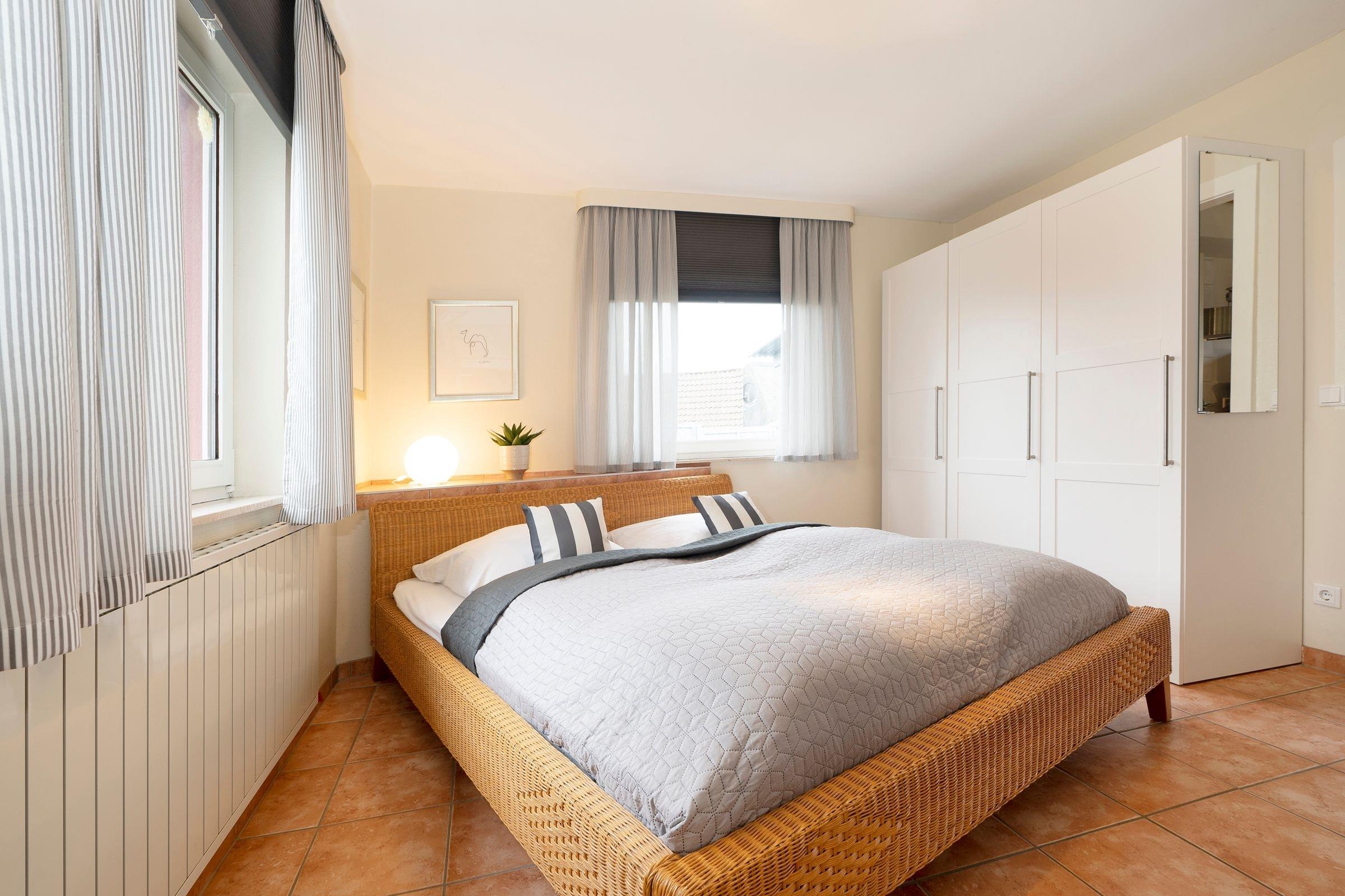 Schlafzimmer: 1 Doppelbett (2x 85x200 cm), Kleiderschrank, Verdunkelungsplissees