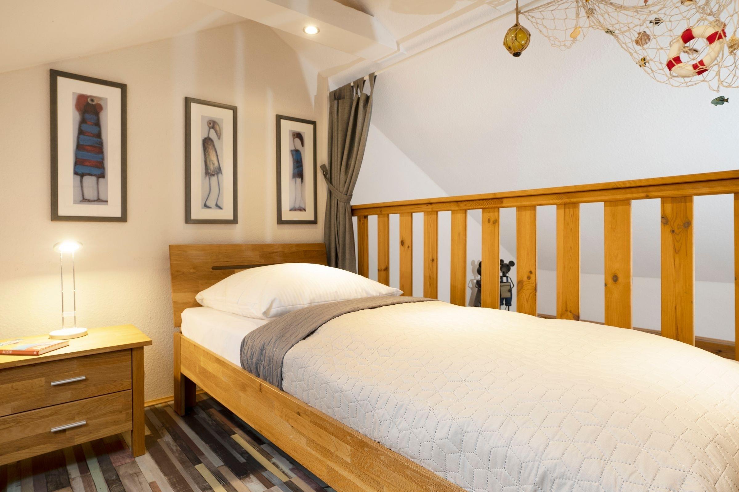Erdgeschoss: Die offene Wohnküche begrüßt Sie mit Fernsehbereich und bequemer Eckcouch, sowie gemütlichem Essplatz für bis zu 4 Personen. Die gute Küchenausstattung ermöglicht problemlos die Zubereitung leckerer Ferienmahlzeiten. Ebenfalls im unteren Bereich der Wohnung befindet sich das schöne Badezimmer, welches mit warmen Farben und hochwertiger Ausstattung begeistert. Vom Wohnbereich ab geht es in das Schlafzimmer mit komfortablem Doppelbett (2x90x200cm) und geräumigem Kleiderschrank für Ihre Ferienkleidung. Obergeschoss: Von dort aus führt schließlich eine Treppe (mit Treppenschutzgitter für die kleinen Gäste) in den offenen Galeriebereich mit zwei Einzelbetten (je 90x200cm), Nachtschränkchen und Dachschrägenfenster. Lassen Sie den Tag auf der Terrasse mit eigenem Strandkorb entspannt ausklingen. Ein Domizil mit wahrer Wohlfühlgarantie!