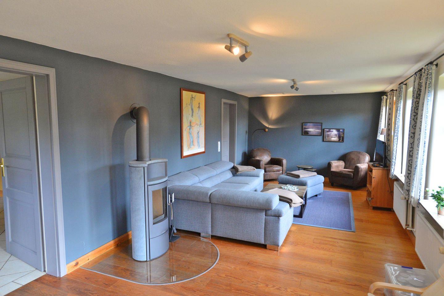 - großes Wohnzimmer mit Kamin und angrenzendem Wintergarten