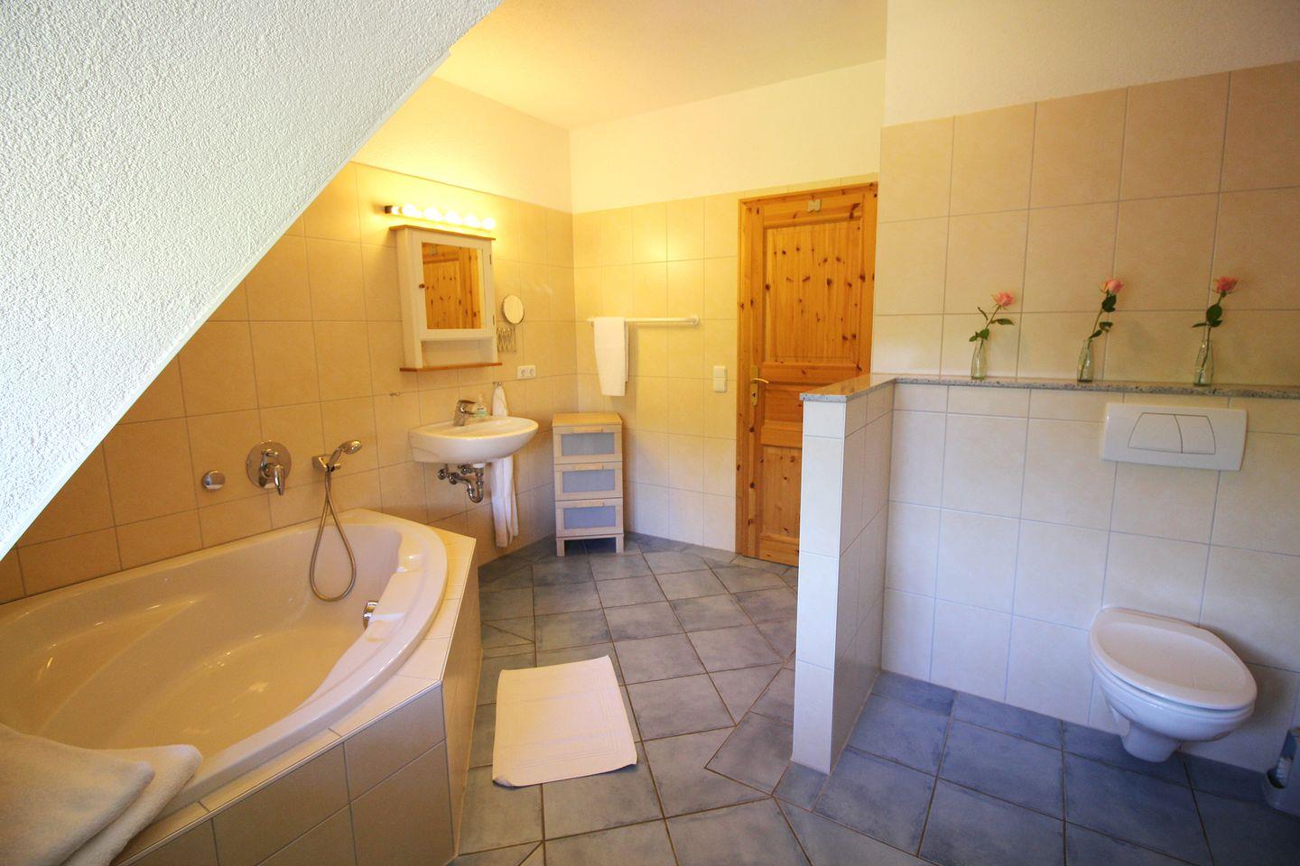- 1 großes Badezimmer mit Dusche, Badewanne, WC und Sauna