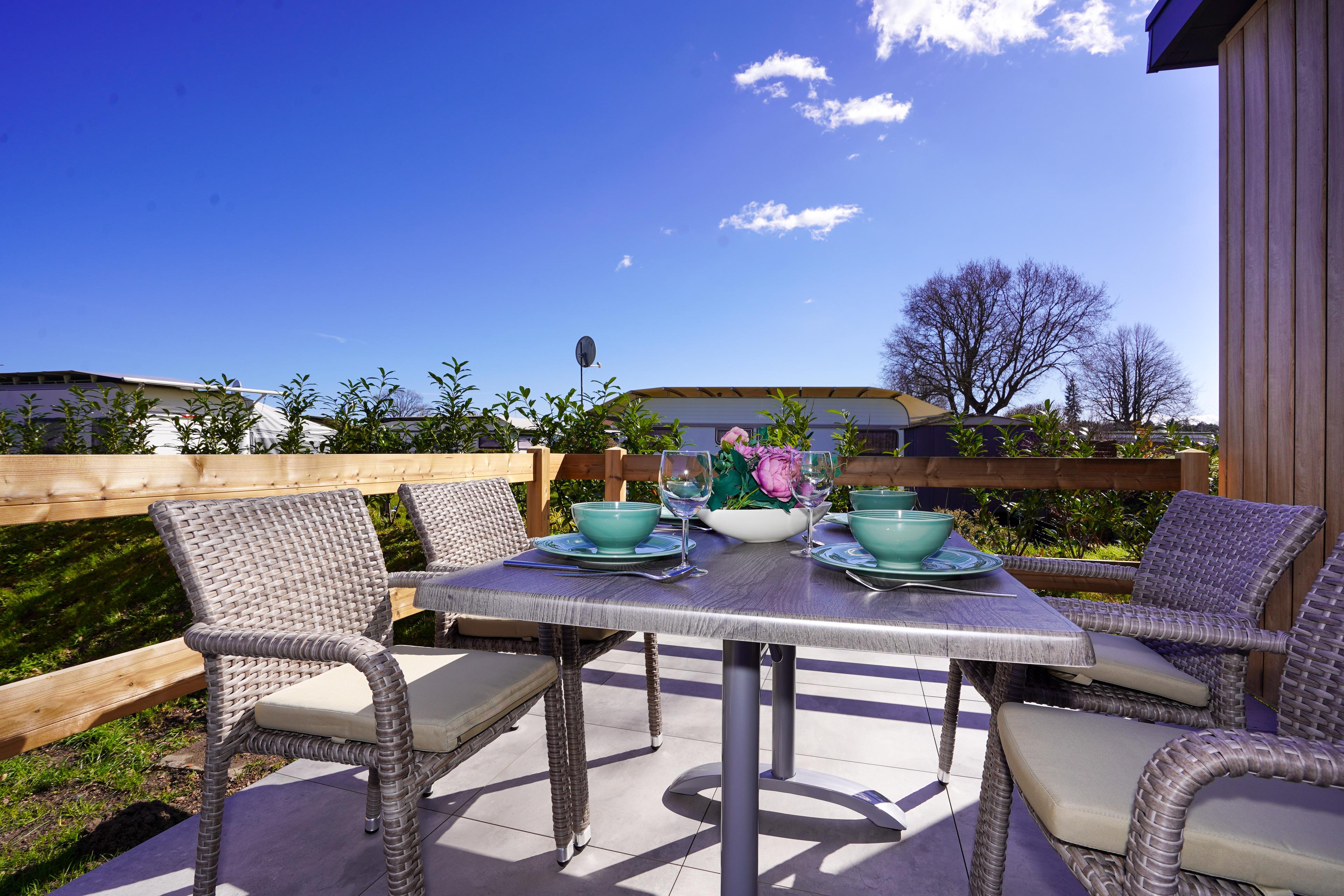 Genießen Sie die frische Luft auf Ihrer eigenen Terrasse, ausgestattet mit bequemen, hochwertigen Hotelgartenmöbeln. Hier haben Sie die Möglichkeit, ein köstliches Frühstück im Freien zu genießen, abends beim Grillen entspannende Stunden zu verbringen oder einfach die Sonne zu genießen.