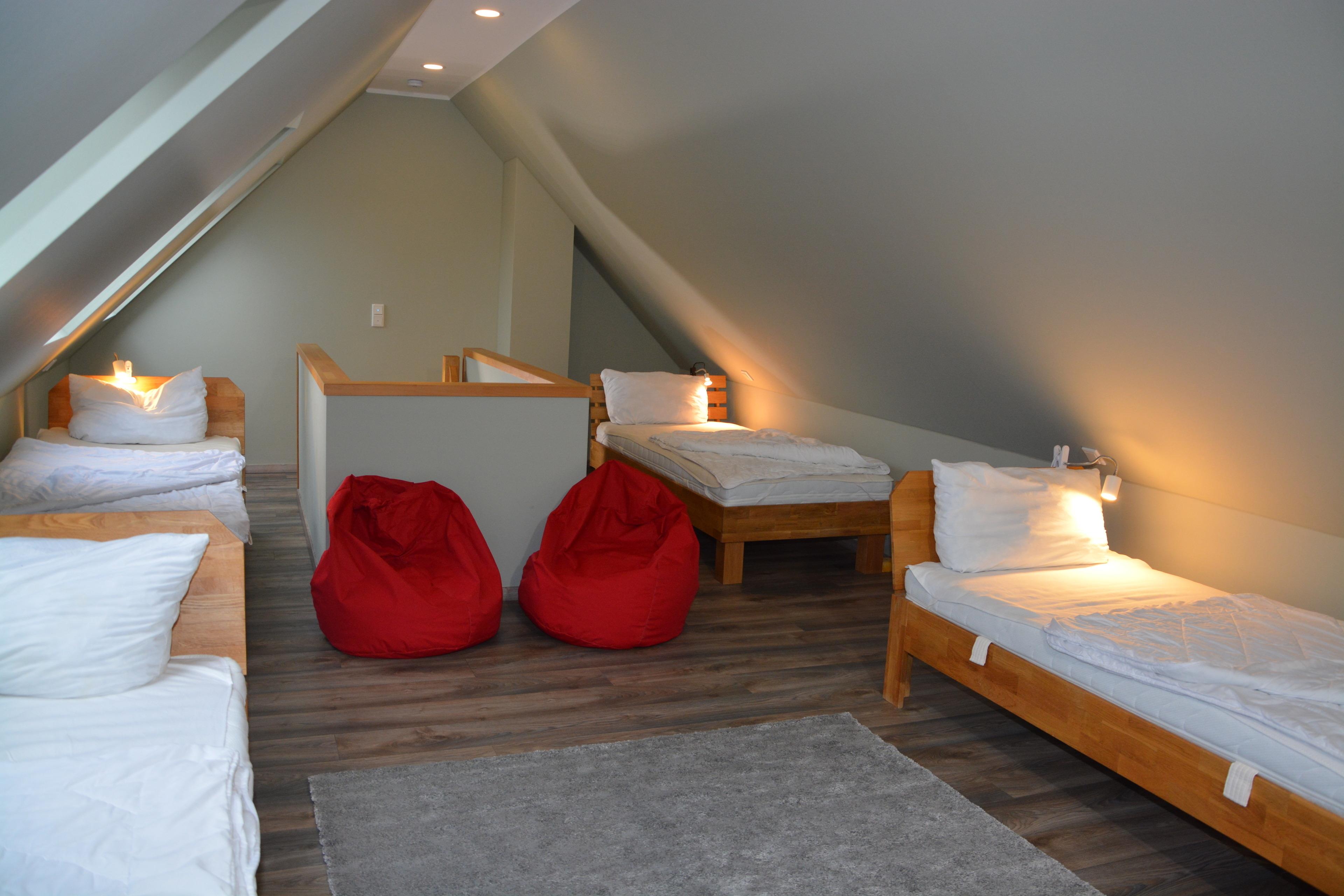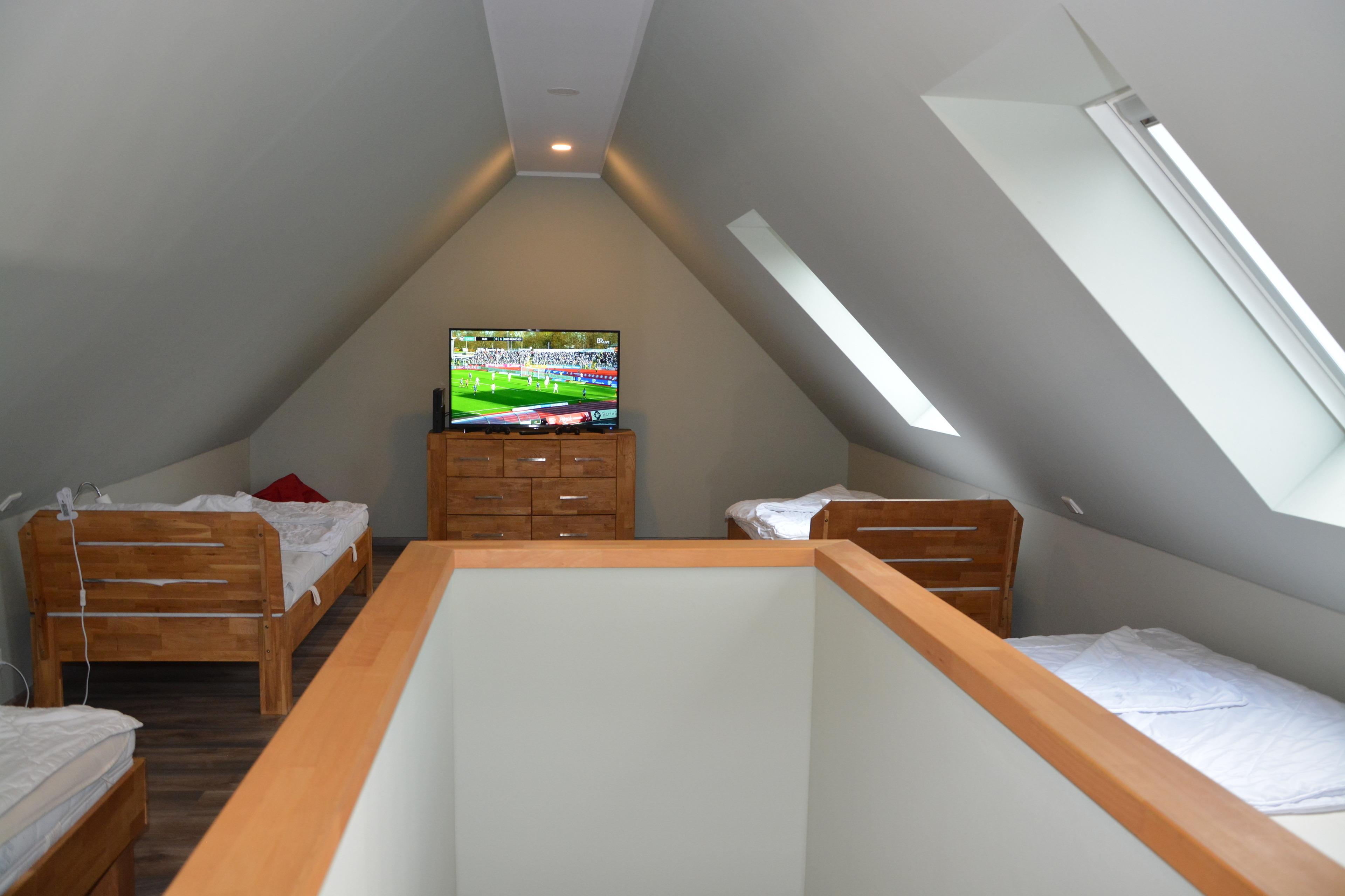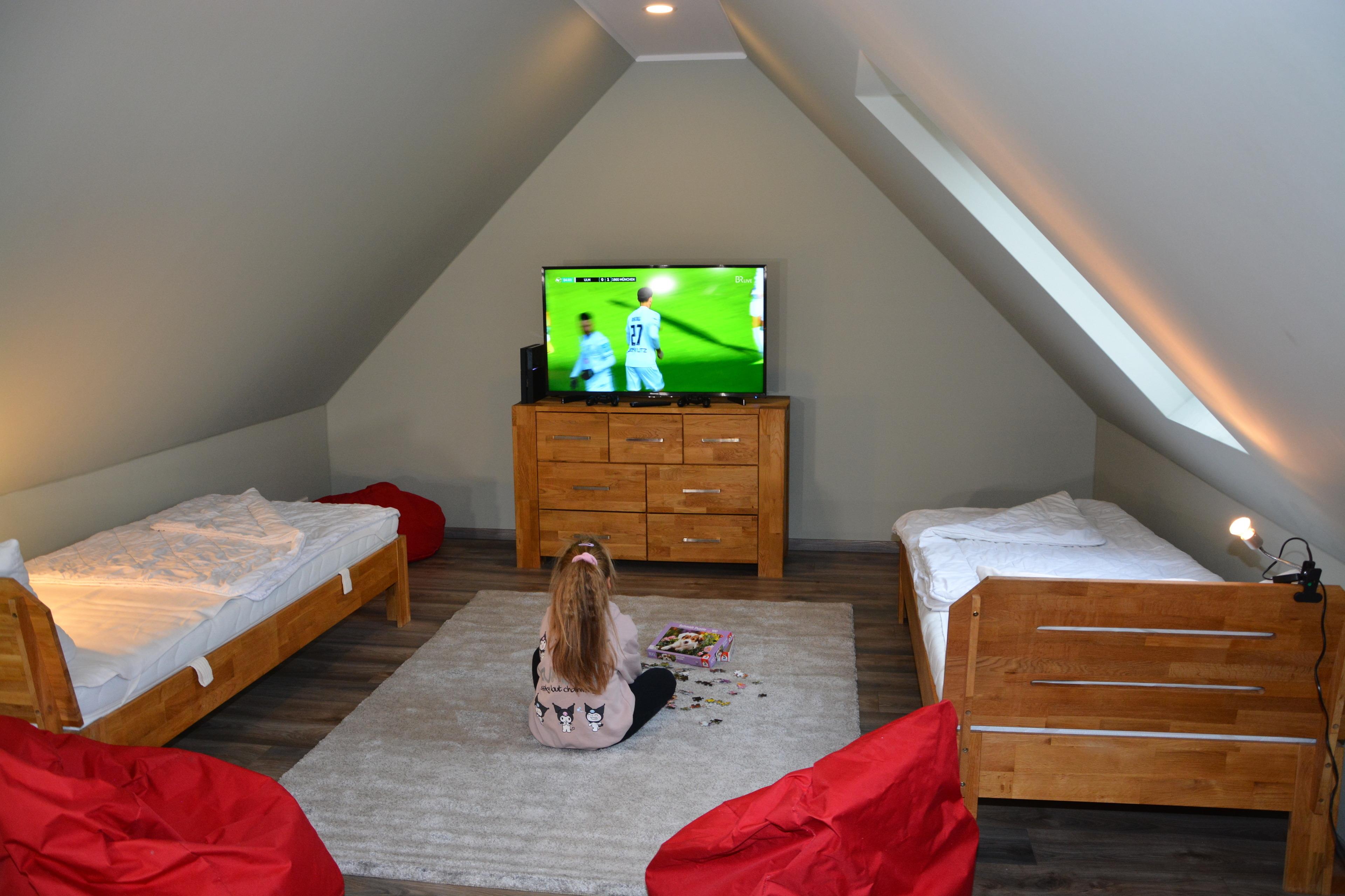 Ein lichtdurchfluteter Wohnbereich mit direktem Zugang zur Terrasse und Garten sowie Grillplatz. Für ein stilvolles Ambiente sorgen der ebenfalls geräumige & lichtdurchflutete Wohn- & Essbereich mit einer offenen Küche. Eine, individuell einstellbare Fußbodenheizung und ein Kamin sorgen für angenehme Wärme an nicht so heißen Tagen. Entspannen können Sie auch im gemütlichen Wohnbereich mit Couch vor einem Flachbildschirm. Eine voll ausgestattete Küche gibt jedem Hobbykoch die Möglichkeit kulinarische Köstlichkeiten selbst zu kreieren. Die dazu notwendige hochwertige Ausstattung mit Umluftherd, Backofen, Spülmaschine, Kühlschrank mit Gefrierfach, 4-Zonen-Cerankochfeld ausreichend Geschirr, Gläser, Besteck, Kochtöpfe sowie viele weitere nützliche Küchenutensilien sind ausreichend vorhanden. Esstisch & Sitzmöglichkeiten für 8- 12 Personen können Sie beim gemütlichen Beisammensein die Köstlichkeiten der Küche oder bei einem Glas Wein und einem Gesellschaftsspiel genießen. Ebenfalls auf der unteren Etage befindet sich ein Schlafzimmer mit Doppelbett und ein Bad mit Wellnessdusche, Waschbecken und WC. Im OG befinden sich 3 Schlafzimmer. Zwei Schlafzimmer mit einem Doppelbett und einen Kleiderschrank.Ein Schlafzimmer mit 2 Einzelbetten und Kleiderschrank.Ein Bad mit Dusche und einer Whirlpool- Badewanne. Zusätzliches WC mit Waschmaschine. Außerdem befindet sich hier die Sauna. Über eine Treppe erreichen Sie den Schlafboden im DG. Dieser ist mit 3 Einzelbetten, großen TV und einer PlayStation 4 ausgestattet. Ideal für die Jugendlichen und Kinder. Das Nichtraucher-Haus mit Sauna ist für 1-12 Personen geeignet, zusätzlich ist die Möglichkeit der Aufbettung mit je einem Babyreisebett gegeben. PKW-Stellplätze sind am Haus vorhanden.