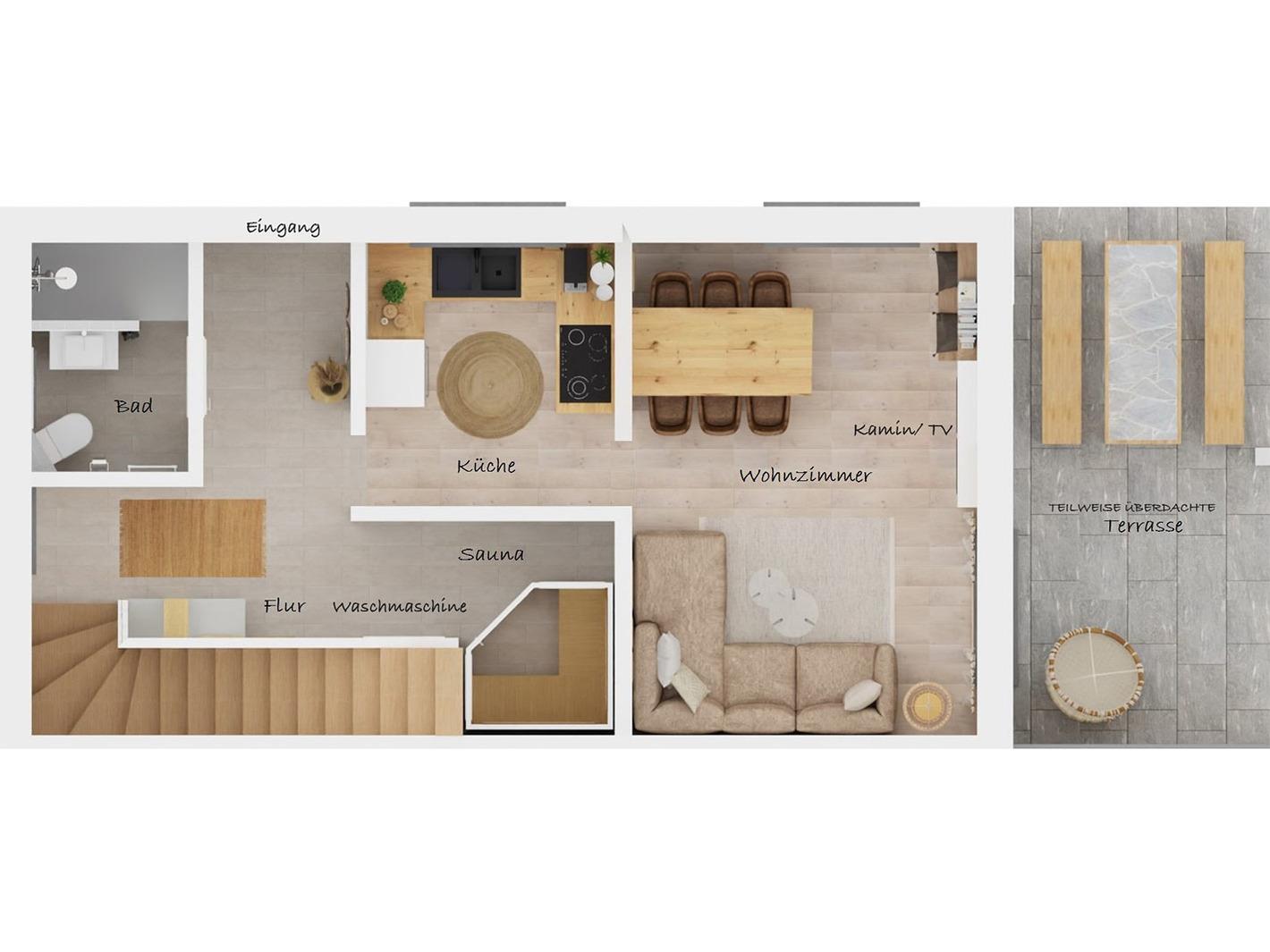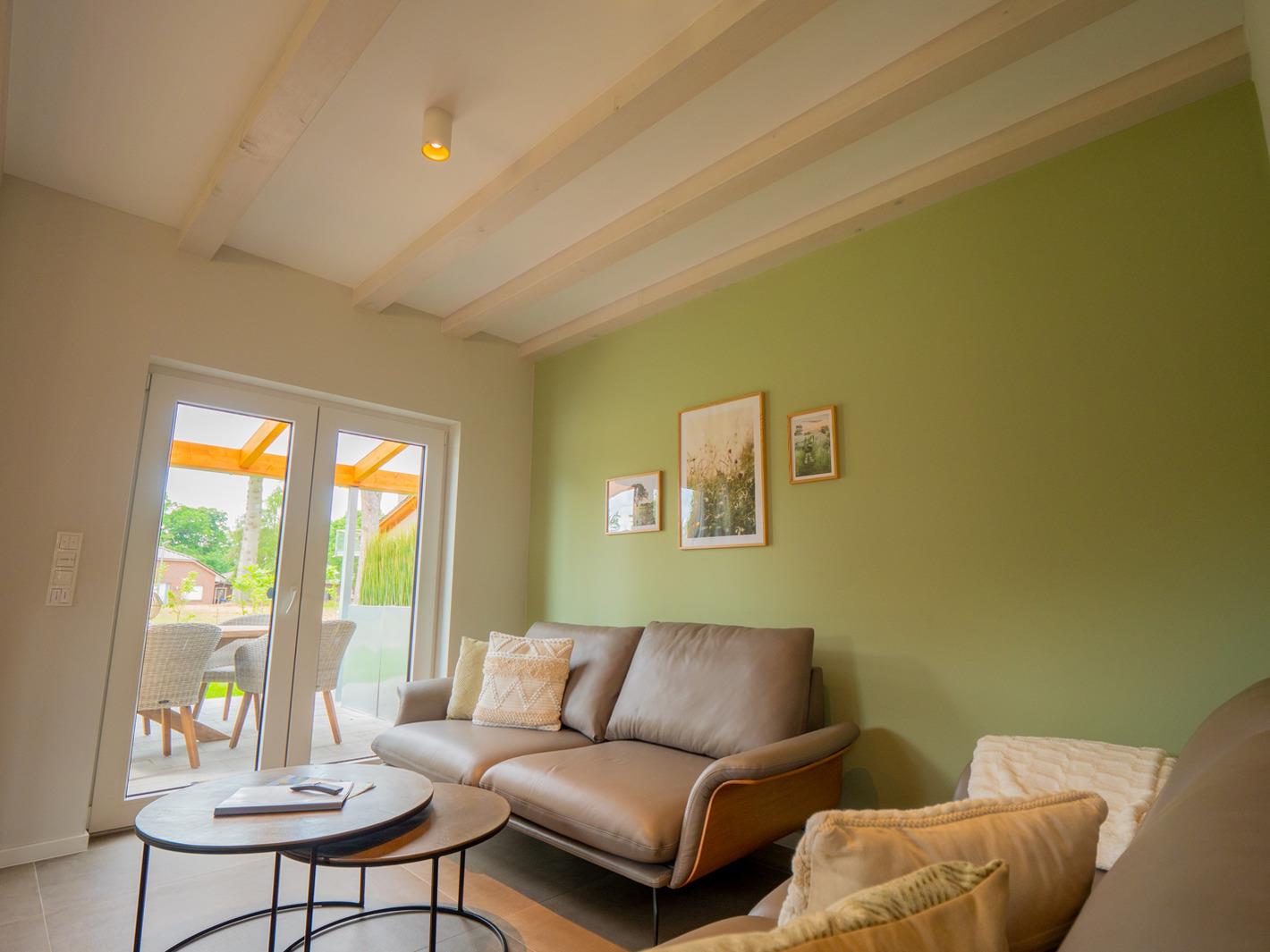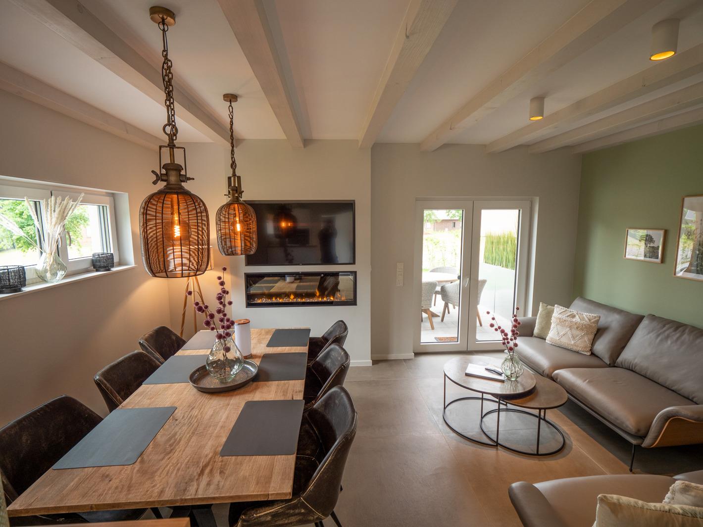 Der exklusiv eingerichtete Wohnbereich mit Zugang zur Terrasse vermittelt eine tolle Wohlfühl-Atmosphäre, welche durch den hochwertigen Elektro-Wärme-Kamin noch verstärkt wird.