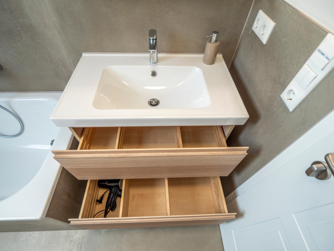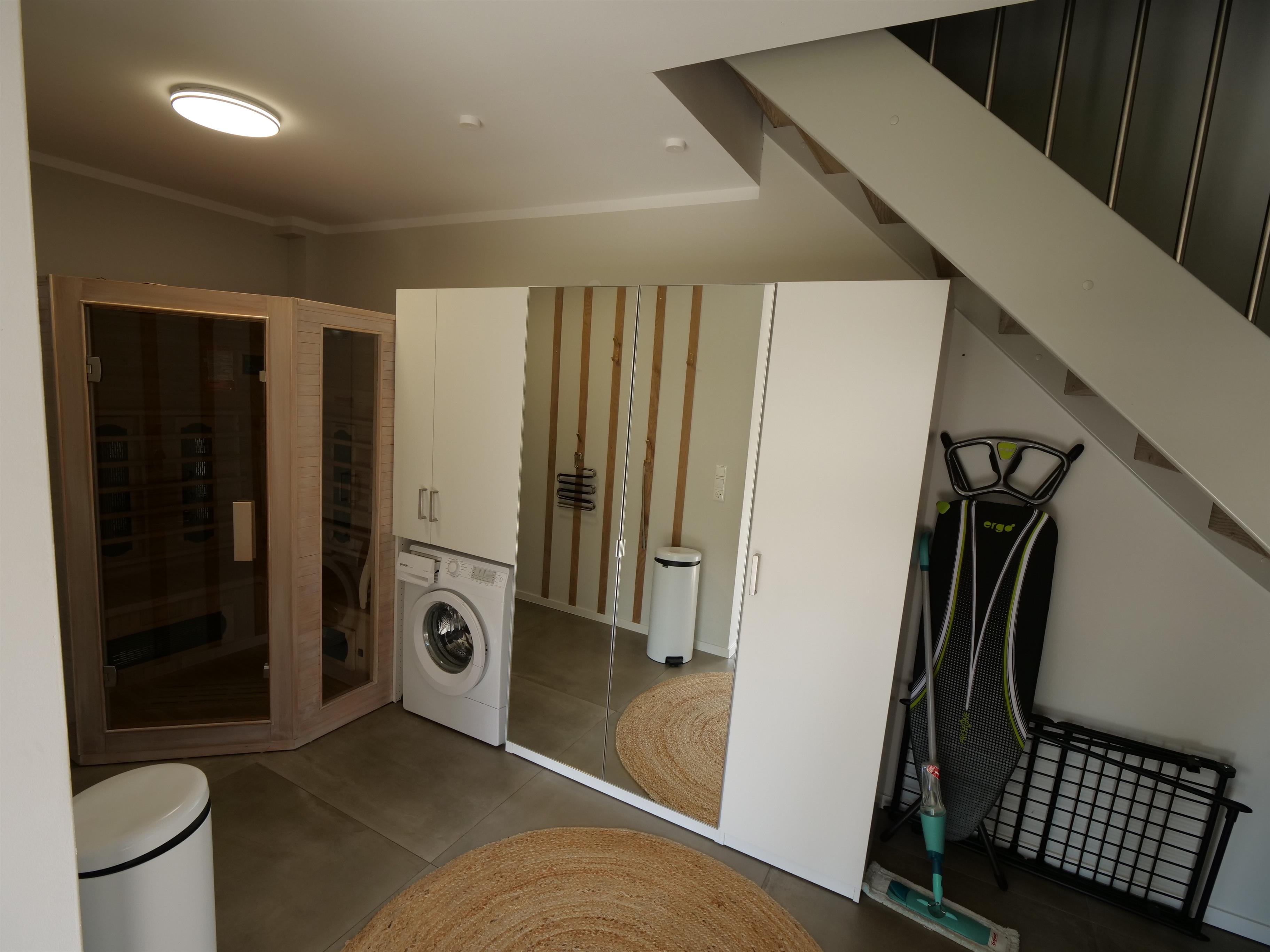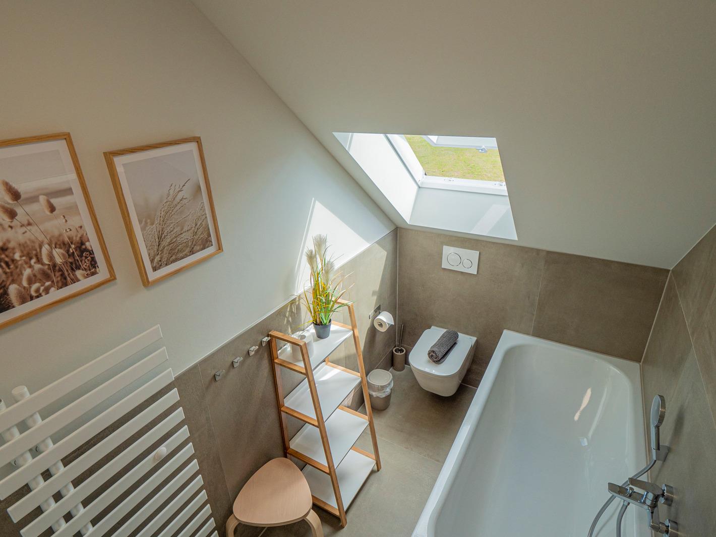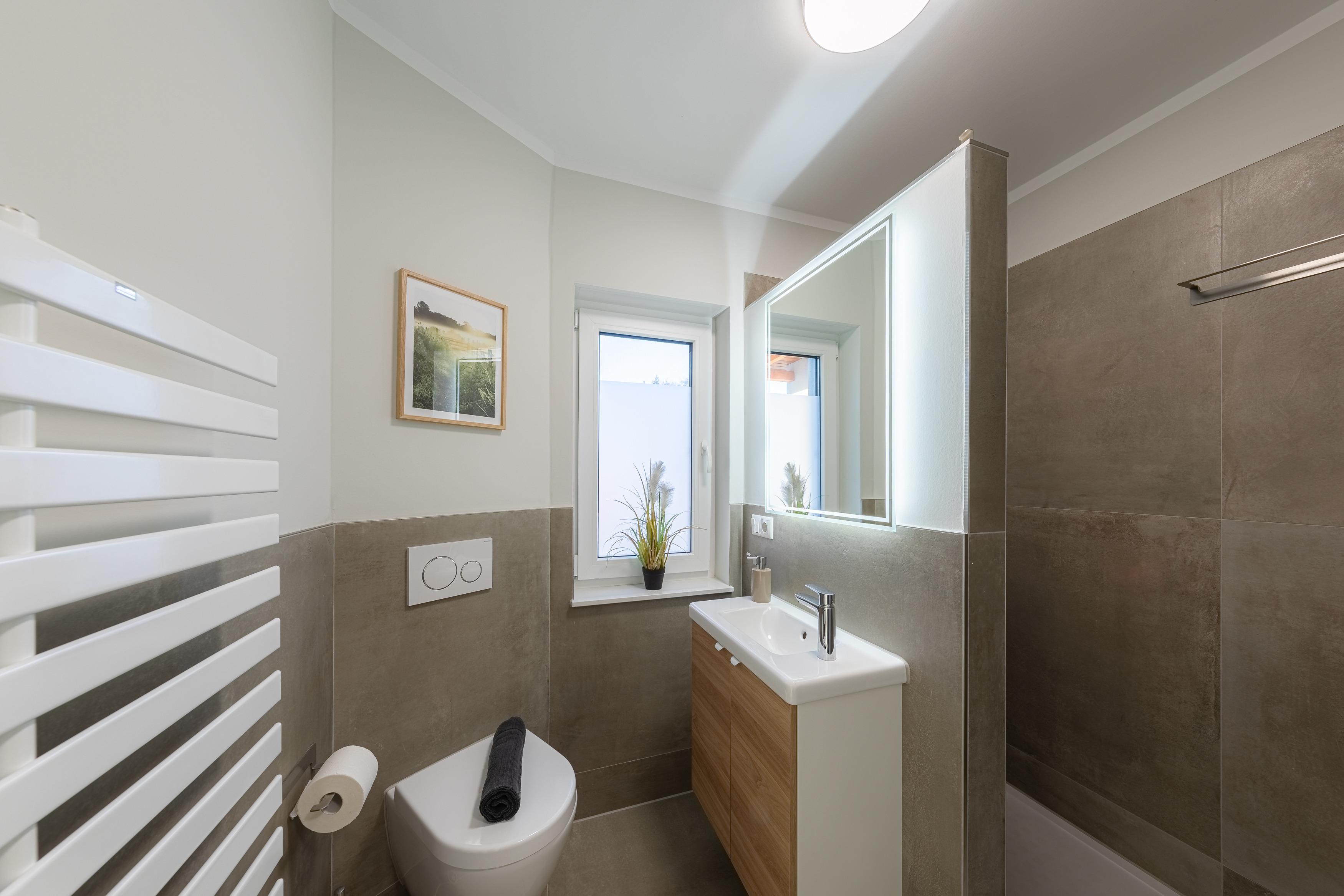 Ihnen stehen insgesamt 2 Badezimmer zur Verfügung. Das hochwertig ausgestattete Badezimmer im Erdgeschoss bietet Ihnen eine bodengleiche bequeme Dusche, Waschtisch, Handtuchwärmer & WC. Nebenan finden Sie eine Infrarot Sauna, die gerade in der kühlen Jahreszeit für entspannte Momente sorgt. Das Badezimmer Nr. 2 befindet sich im Dachgeschoß und verfügt über eine Badewanne mit Dusche, ein Waschbecken und WC.