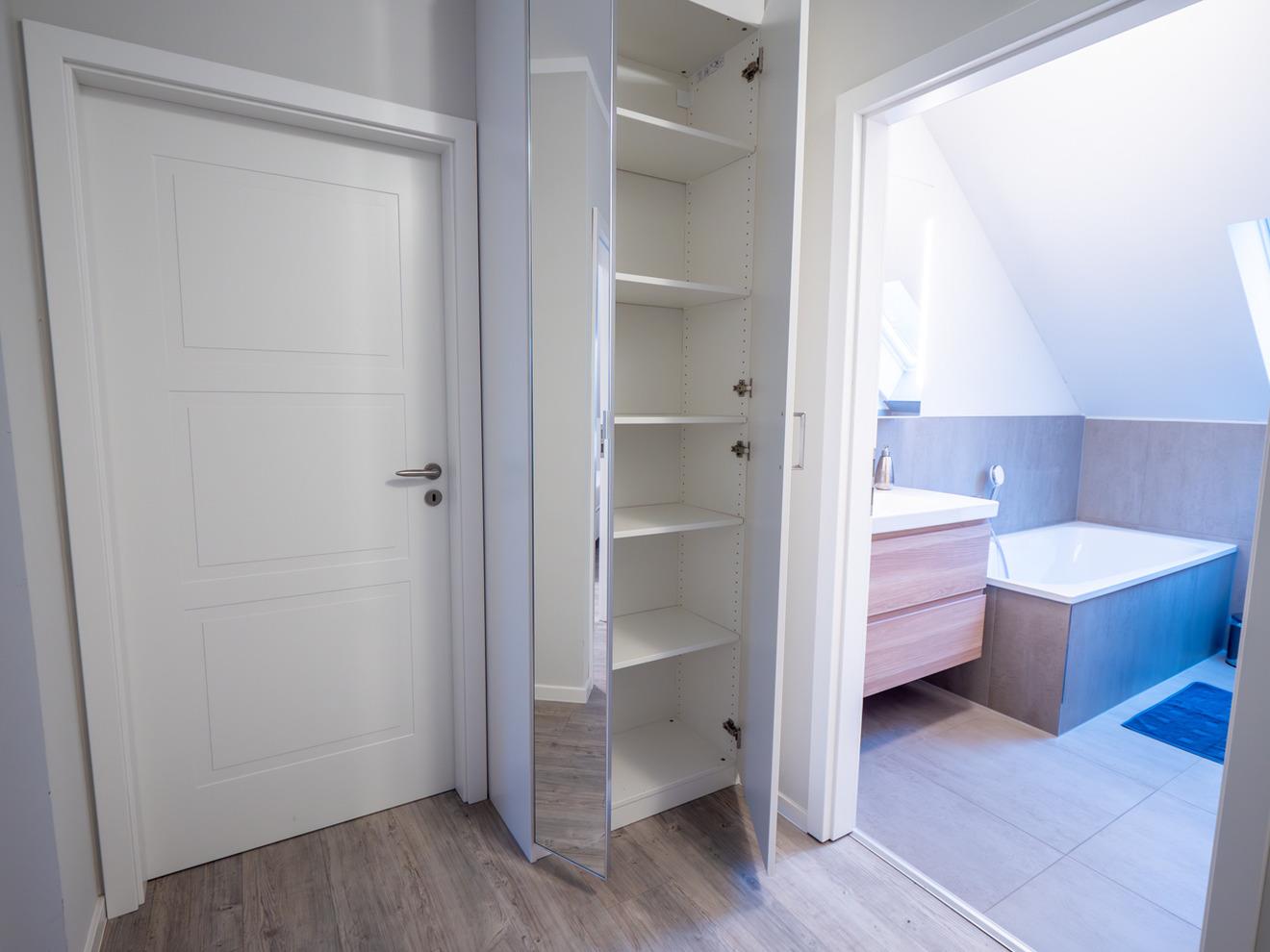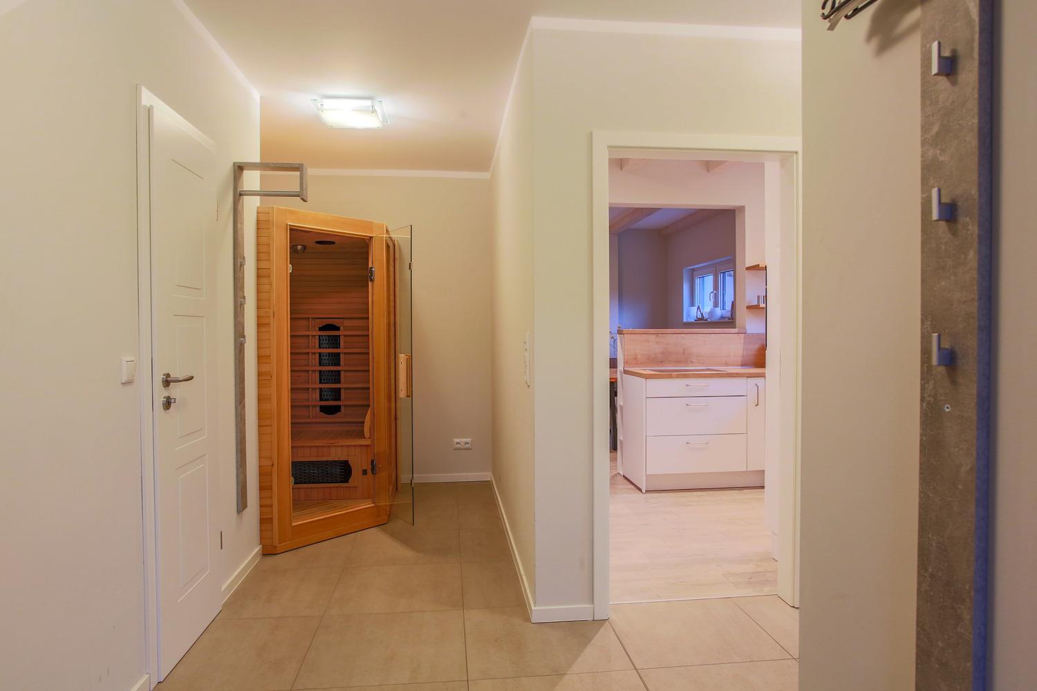 Ihnen stehen insgesamt 2 Badezimmer zur Verfügung. Das hochwertig ausgestattete Badezimmer im Erdgeschoss bietet Ihnen eine bodengleiche bequeme Dusche, Waschtisch, Handtuchwärmer & WC. Nebenan finden Sie eine Infrarot Sauna, die gerade in der kühlen Jahreszeit für entspannte Momente sorgt. Das Badezimmer Nr. 2 befindet sich im Dachgeschoß und verfügt über eine Badewanne mit Dusche, ein Waschbecken und WC.
