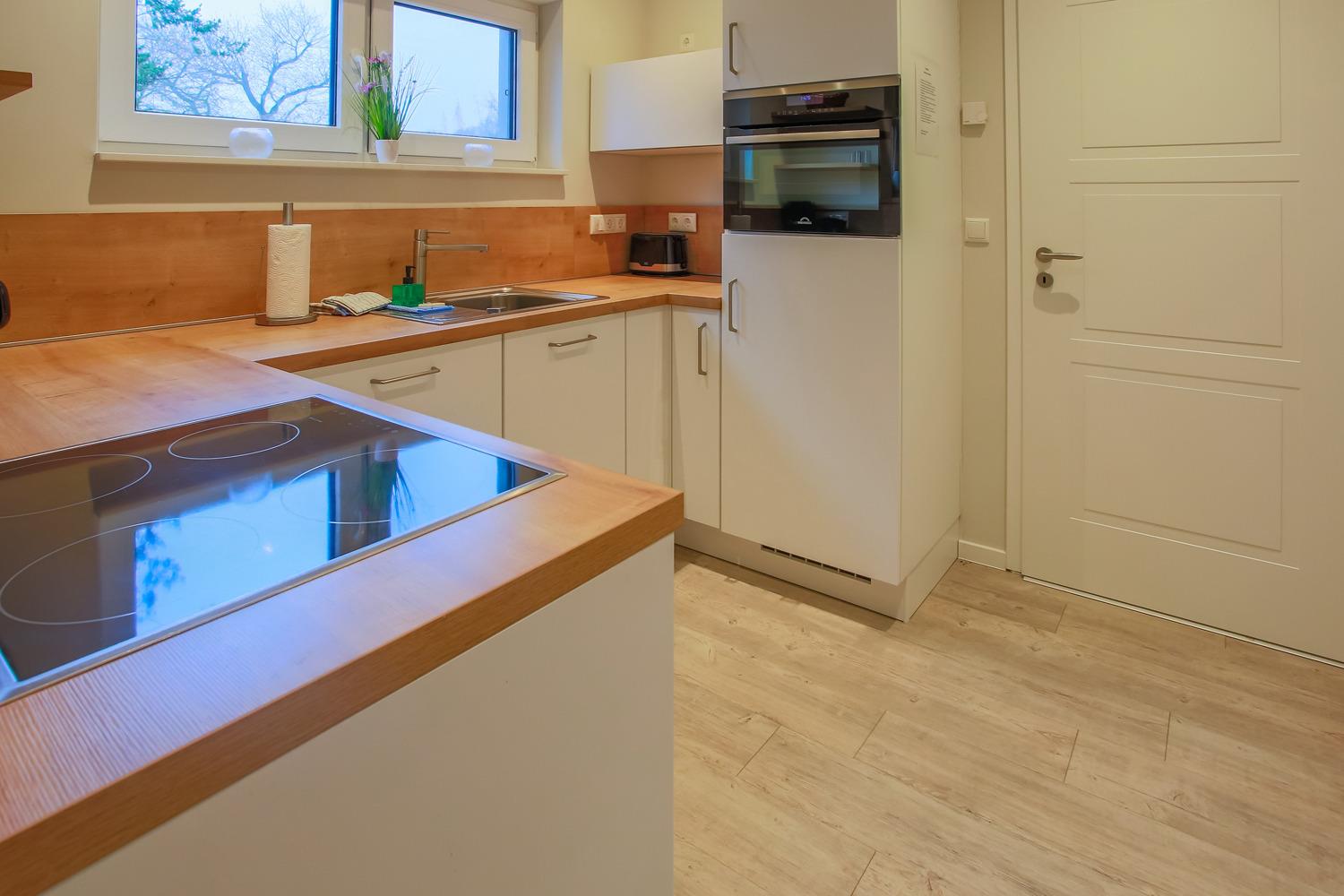 Die offene Küche ist hochwertig ausgestattet mit Induktionsherd, Mikrowelle, Spülmaschine, Kühl-/Gefrierschrank, ausreichend Geschirr und Kochtöpfen sowie vielen nützlichen Kochutensilien.