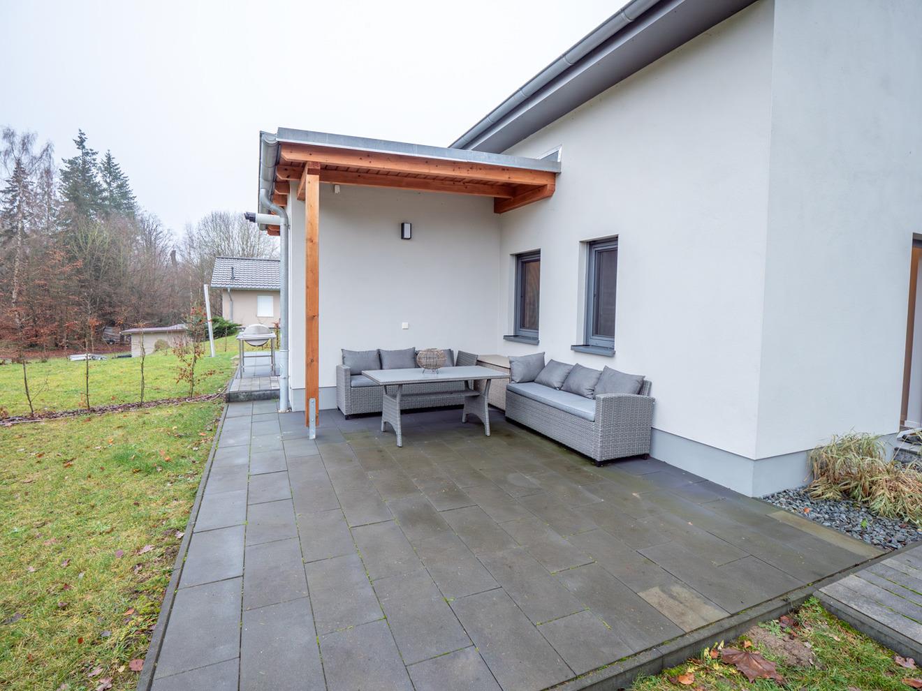 Der exklusiv eingerichtete Wohnbereich mit Zugang zur Terrasse vermittelt eine tolle Wohlfühl-Atmosphäre, welche durch den hochwertigen Elektro-Wärme-Kamin noch verstärkt wird.