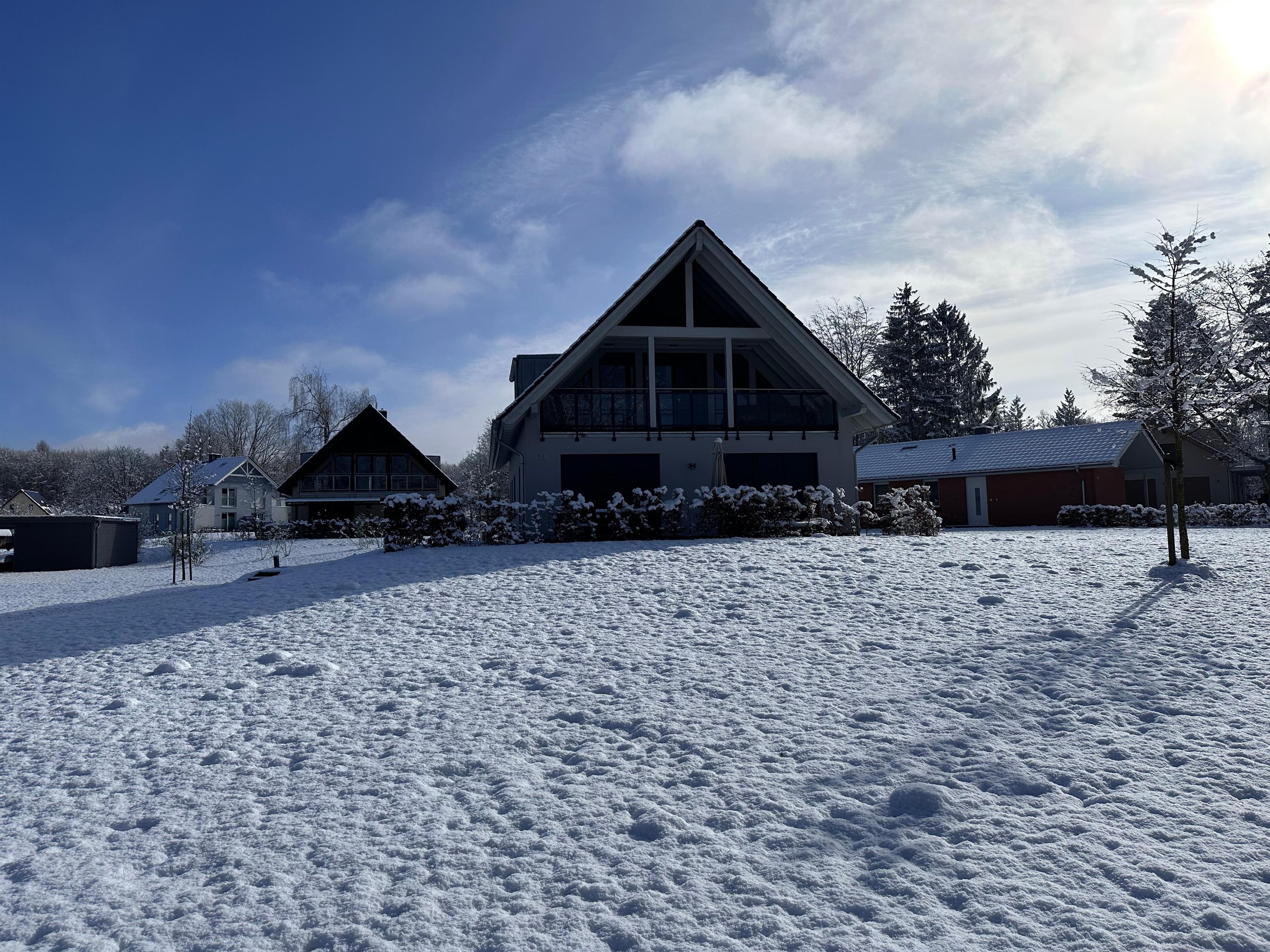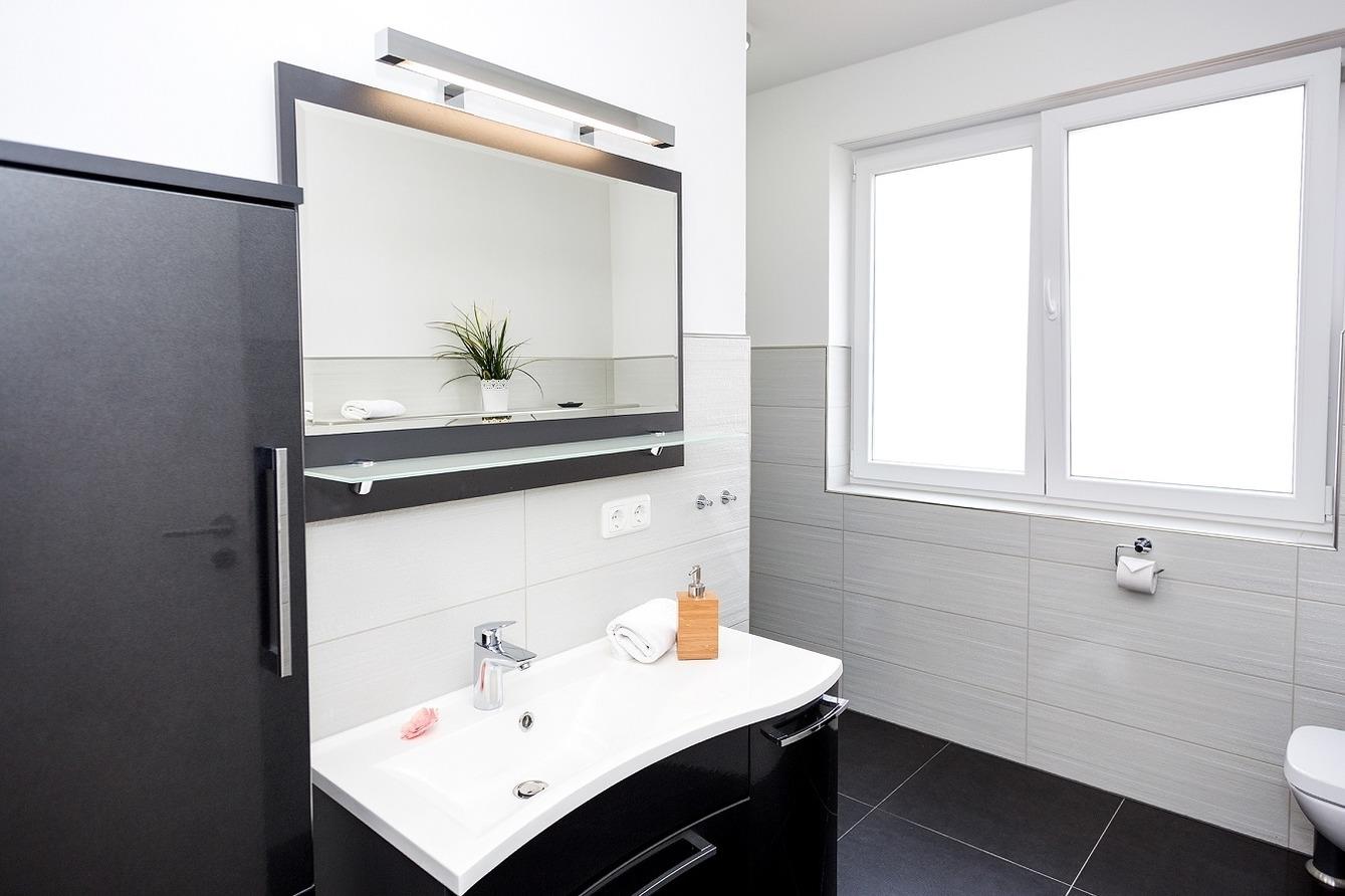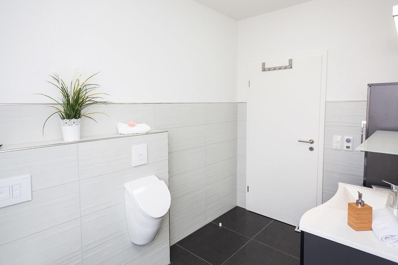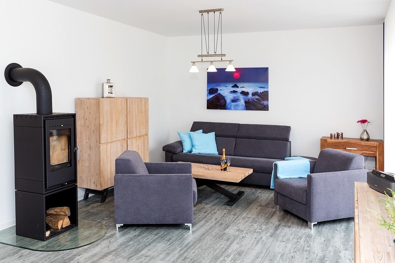 Der modern eingerichtete Wohnbereich mit Zugang zur Terrasse & anschließendem Garten bietet Ihnen eine Wohlfühl-Atmosphäre, welche durch den Kaminofen noch unterstrichen wird. Hier können Sie auf der gemütlichen Couch vor einem Flachbildschirm entspannen. Die in diesen Raum integrierte Küche lässt nicht nur das Herz eines Hobbykochs höher schlagen. Die hochwertige Ausstattung mit einem Umluftherd, Mikrowelle, Spülmaschine, Kühl-/Gefrierschrank, 4-Zonen-Cerankochfeld, ausreichend Geschirr, Gläser, Besteck, Kochtöpfe sowie vielen nützlichen Kochutensilien lässt keine Wünsche offen. Ein Esstisch mit Sitzmöglichkeiten für 6 Personen lädt zum gemütlichen Zusammensitzen ein. Vom Wohn- & Essbereich betreten Sie die Terrasse, die mit hochwertigen Gartenmöbeln ausgestattet ist. Die Ferienwohnung bietet Ihnen 1 luxuriöses Badezimmer. Das hochwertig ausgestattete Wellness-Bad bietet eine bodengleiche Raindance-Dusche, Design-Waschtisch. Zusätzliches Bad mit Waschbecken, Urinal und WC. Beide Schlafzimmer sind mit einem bequemen Doppelbett und Kleiderschrank mit viel Stauraum für Ihre Urlaubsgarderobe ausgestattet.