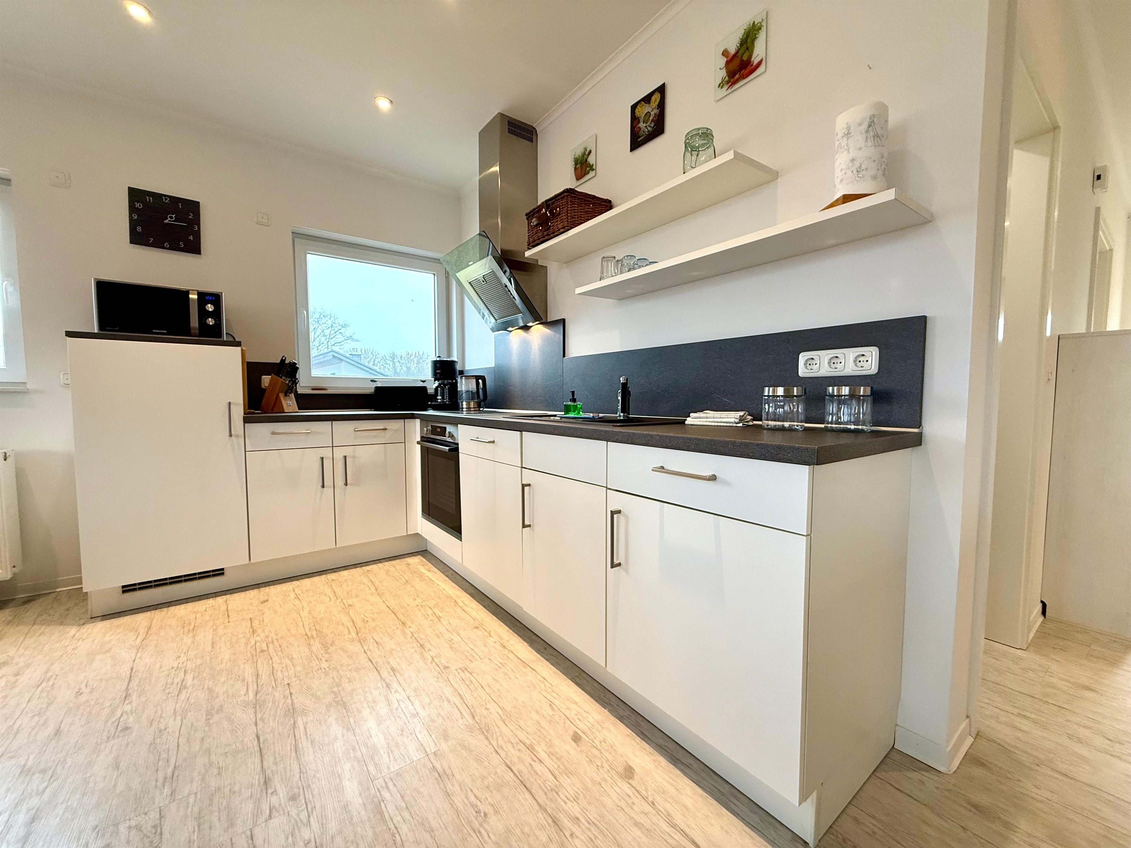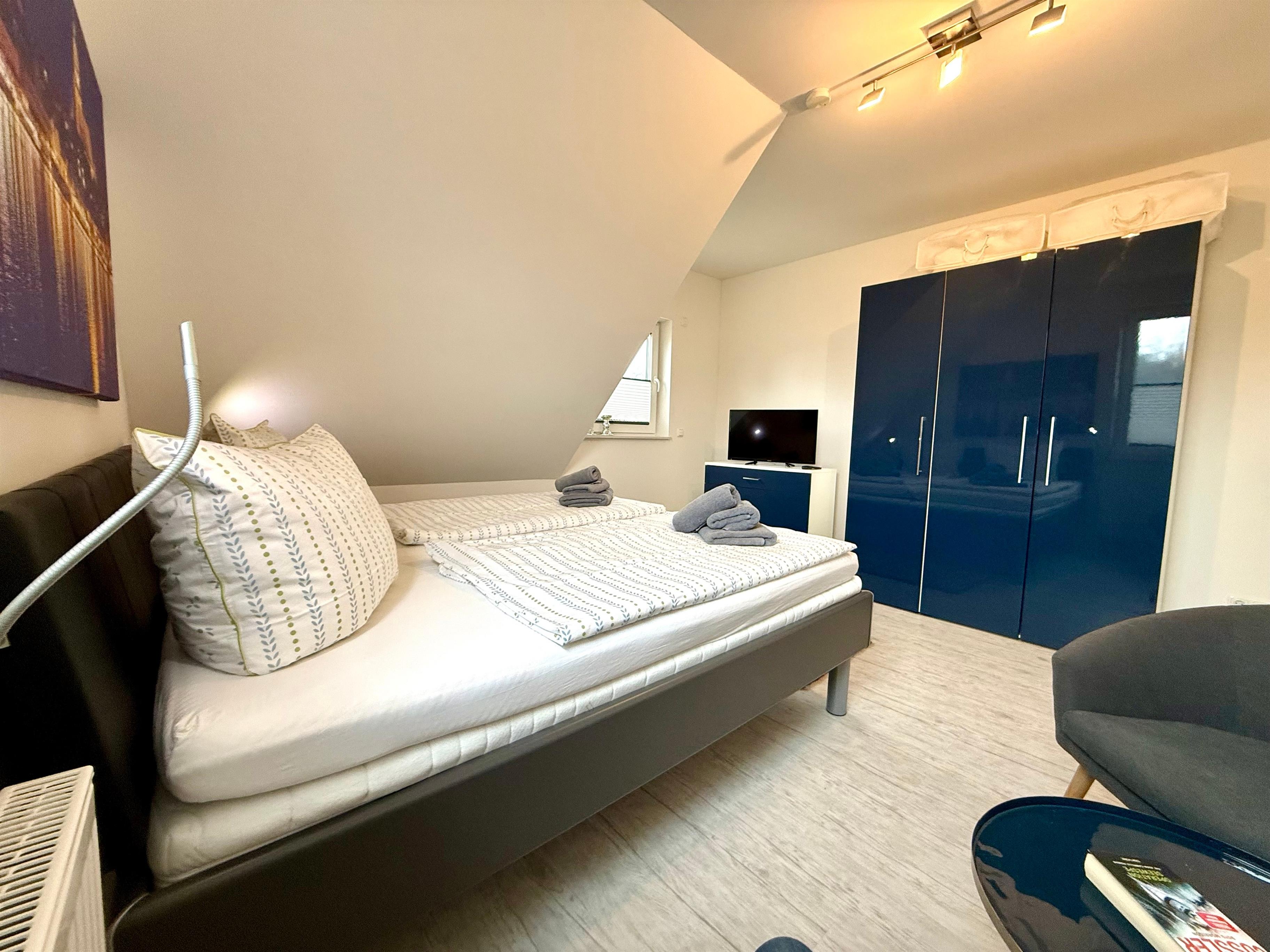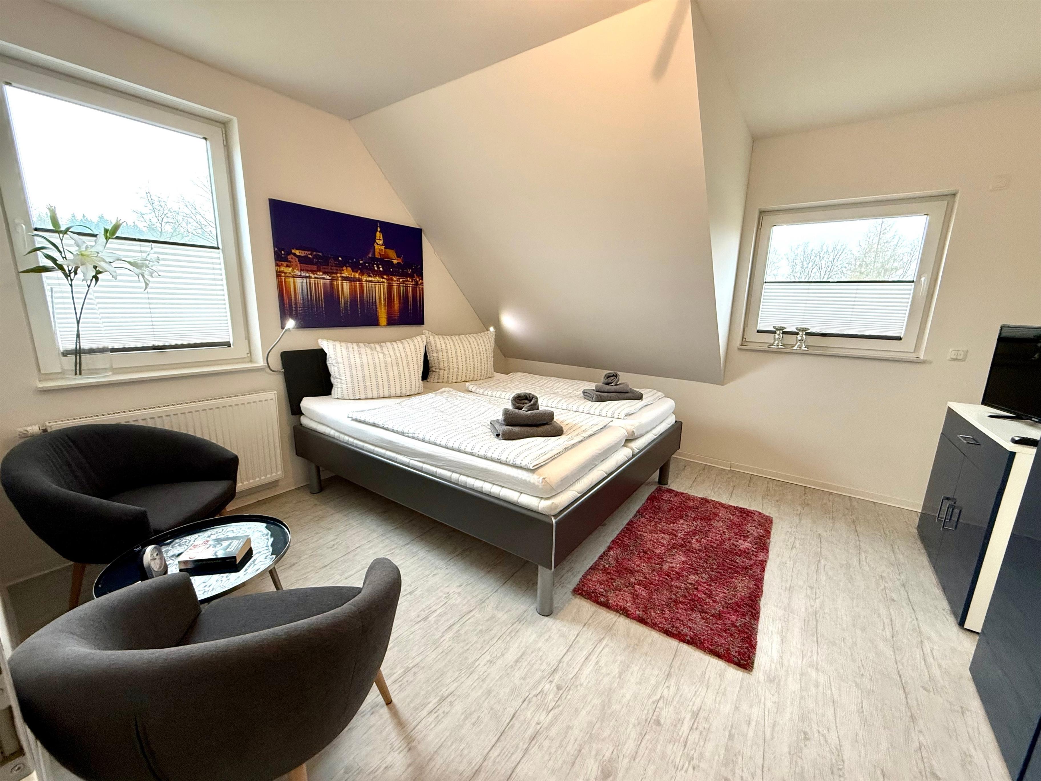 Das Herzstück der Wohnung ist das geräumige, lichtdurchflutete Wohnzimmer mit gemütlichem Kamin – perfekt für entspannte Abende. Die offene, modern ausgestattete Küche lädt zum gemeinsamen Kochen ein. Das Schlafzimmer mit hochwertigem Boxspringbett bietet Platz für 2 Personen und verspricht erholsamen Schlaf. Im Wohnzimmer steht eine komfortable Schlafcouch bereit, auf der 2 weitere Personen bequem übernachten können. Das stilvolle Badezimmer verfügt über eine Dusche und eine Badewanne für entspannende Momente.