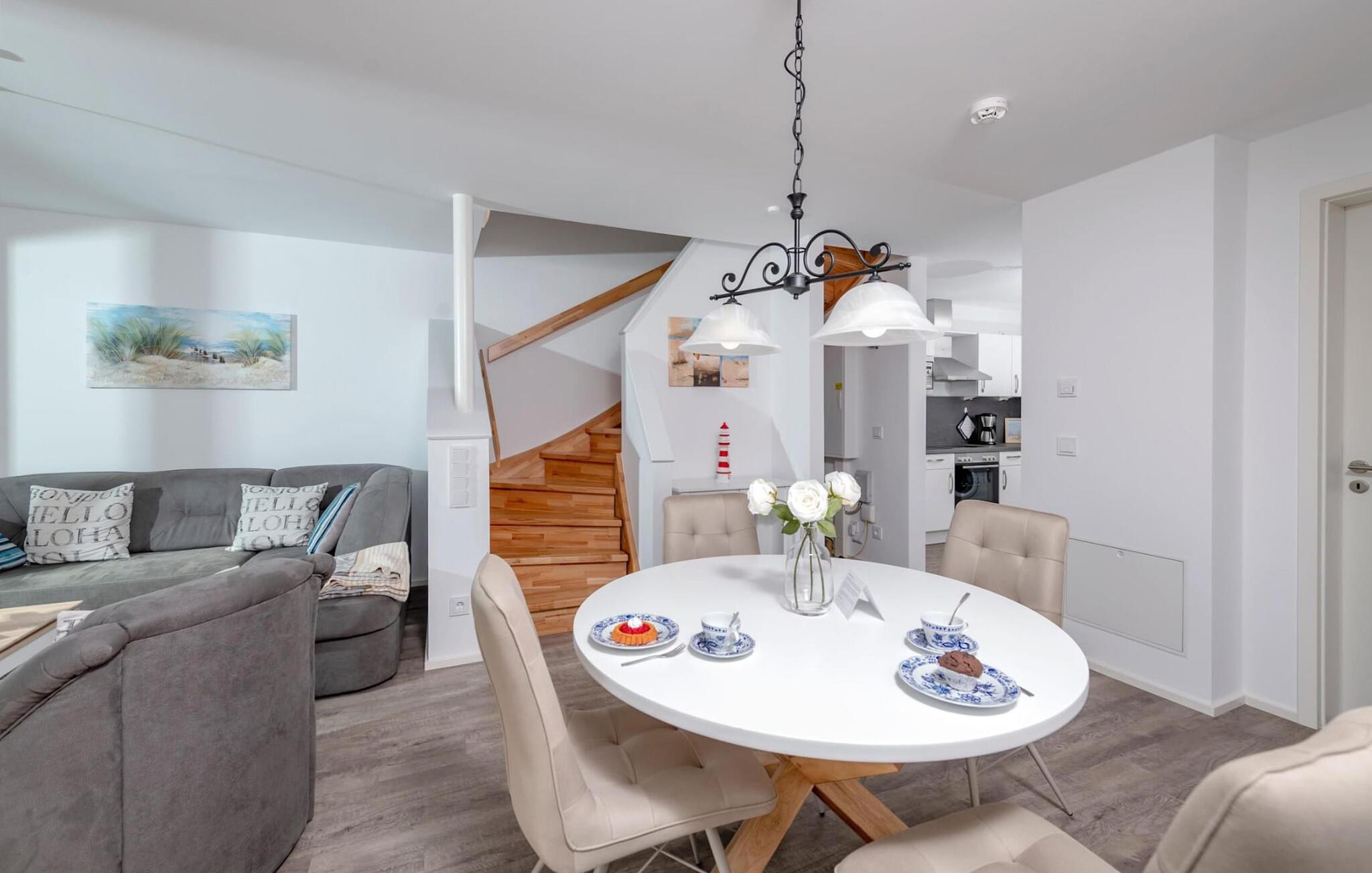 Der offen gestaltete, lichtdurchflutete Wohn- und Essbereich befindet sich im Erdgeschoss des Ferienobjekts. Von hier aus gelangt man direkt auf die angrenzende Terrasse mit nordischem Strandkorb. Frühstücken bei Morgensonne oder ein gemeinsamer Grillabend, Hafenkino ist hierbei garantiert. Die Küche lässt keine Wünsche offen, rundum ausgestattet erlaubt diese vollen Urlaubskomfort.