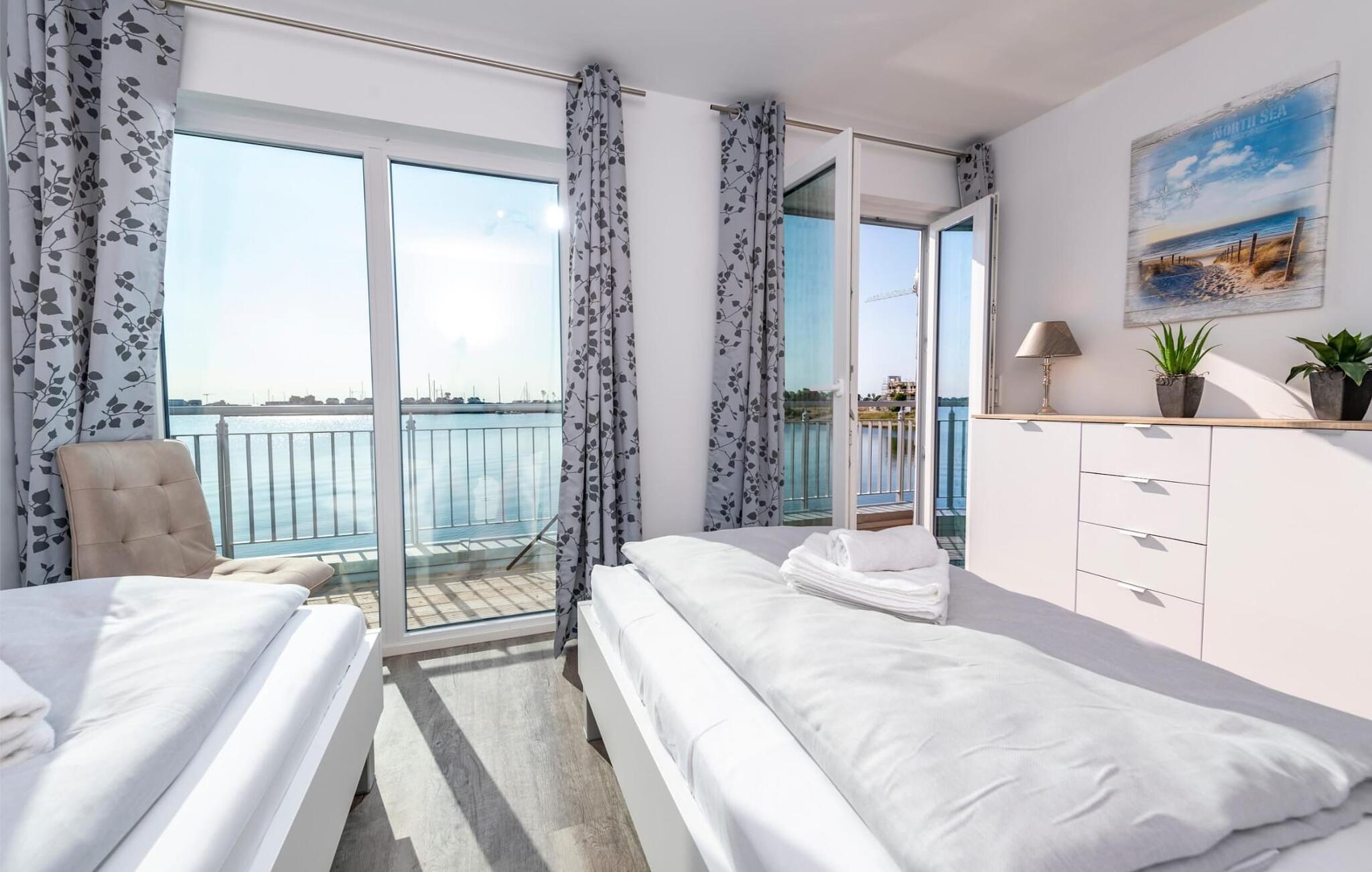 Der Ruhebereich des Ferienhauses befindet sich im ersten Obergeschoss. In zwei Schlafzimmern darf der Gast einschlafen und aufwachen bei Wasserblick. Bei einem morgendlichen Kaffee lassen sich auf der angrenzenden Terrasse des Hafenblick-Schlafzimmers ablegende Segelschiffe beobachten.