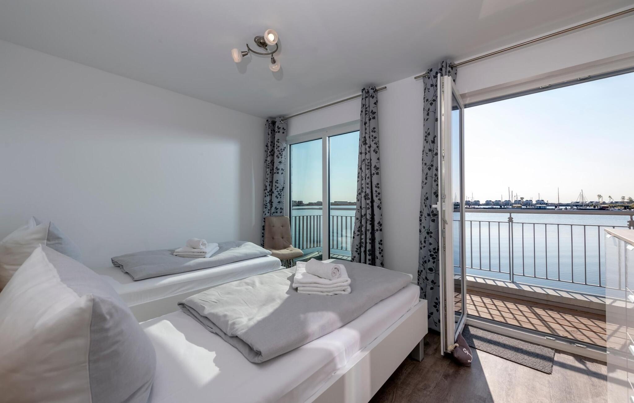 Der Blick fällt durch bodentiefe Panorama Fensterfronten auf wunderschöne Wasserkulisse. Auf jeder Ebene verfügt das Ferienhaus über eine Terrasse mit Hafenblick. Das Highlight: Die große 360° Dachterrasse mit ganztags Sonne.