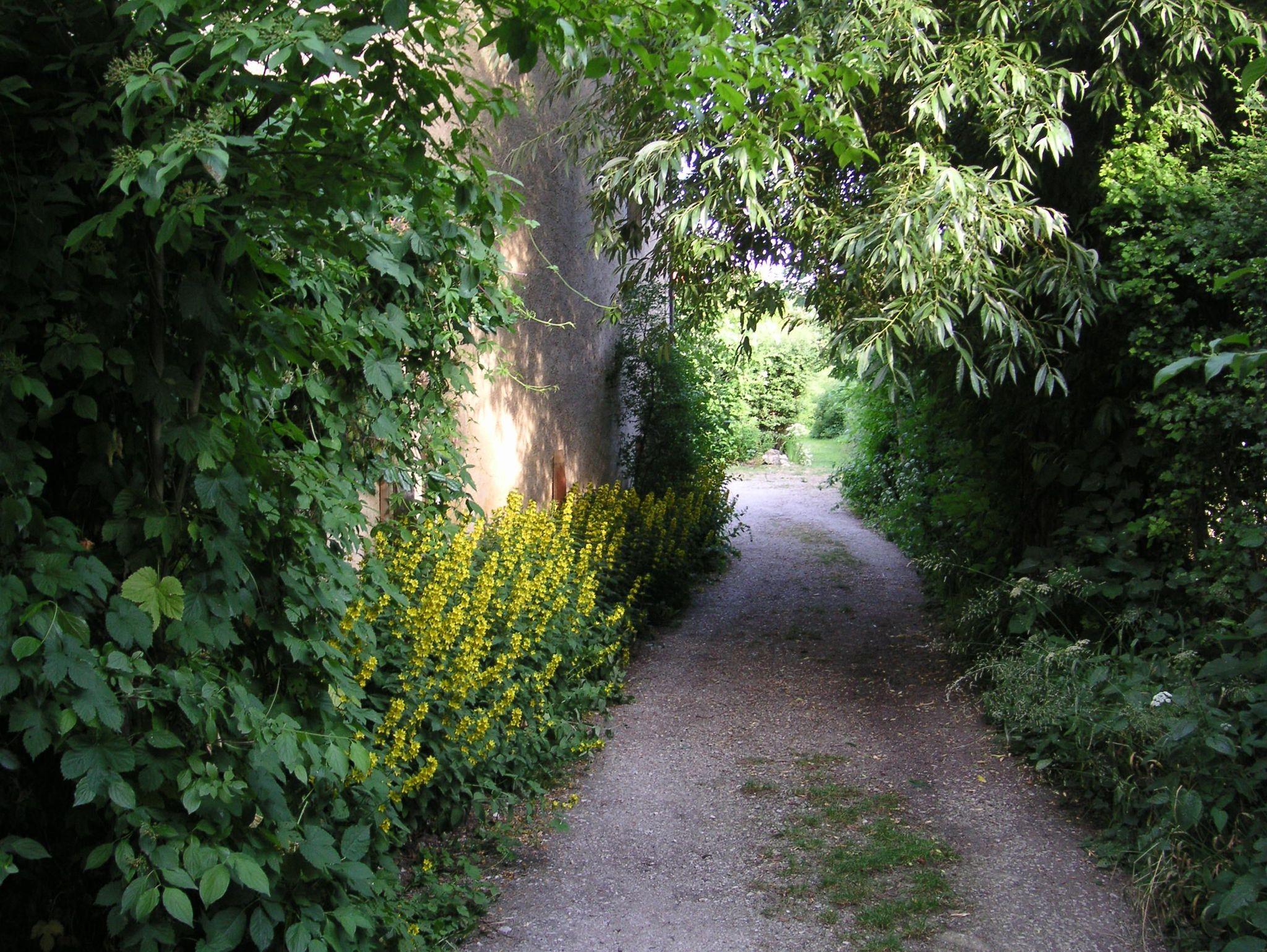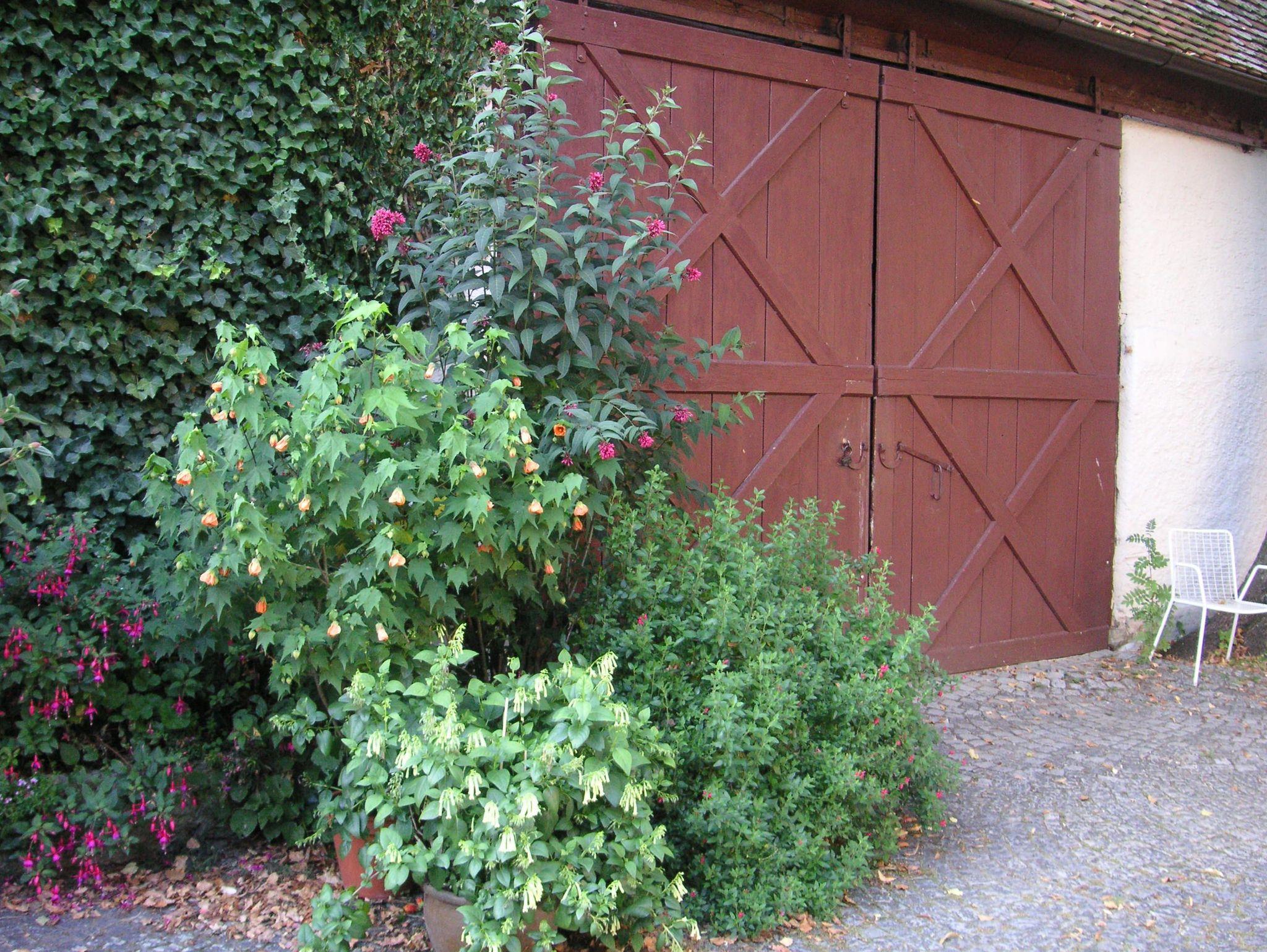 Die Ferienwohnung liegt in einem separaten Nebengebäude im 1. Stock mit grünen Kletterpflanzen von den Außenwänden bis auf das Dach.