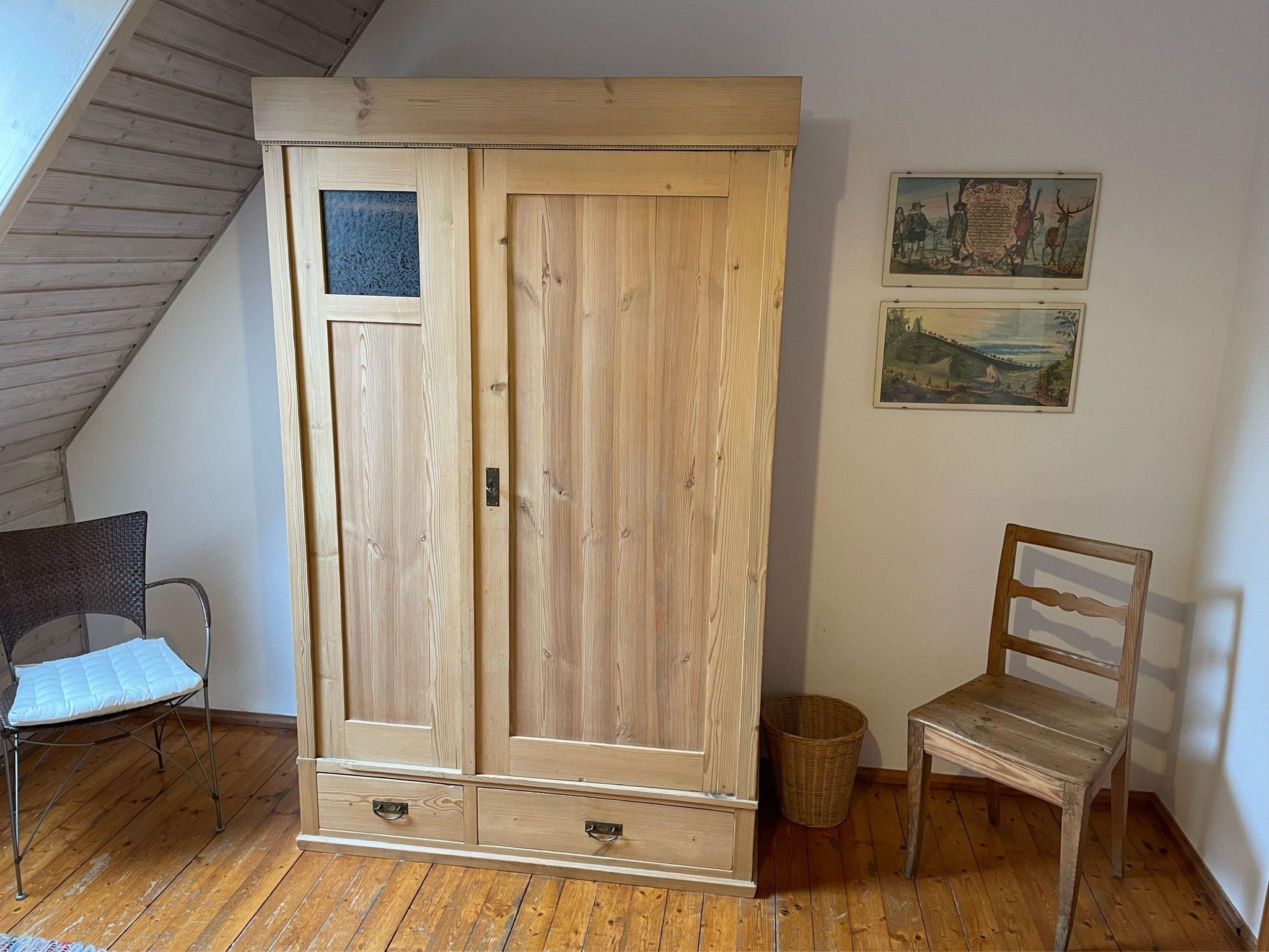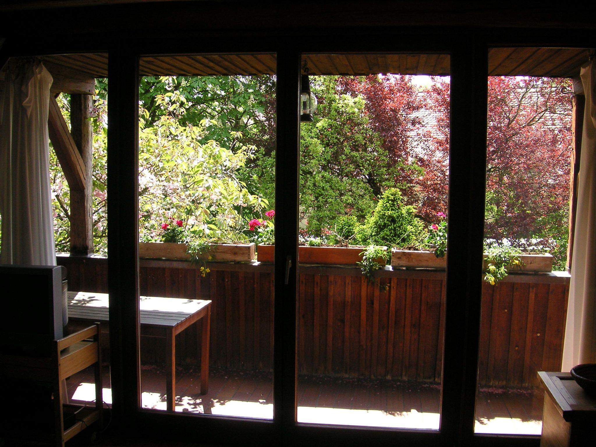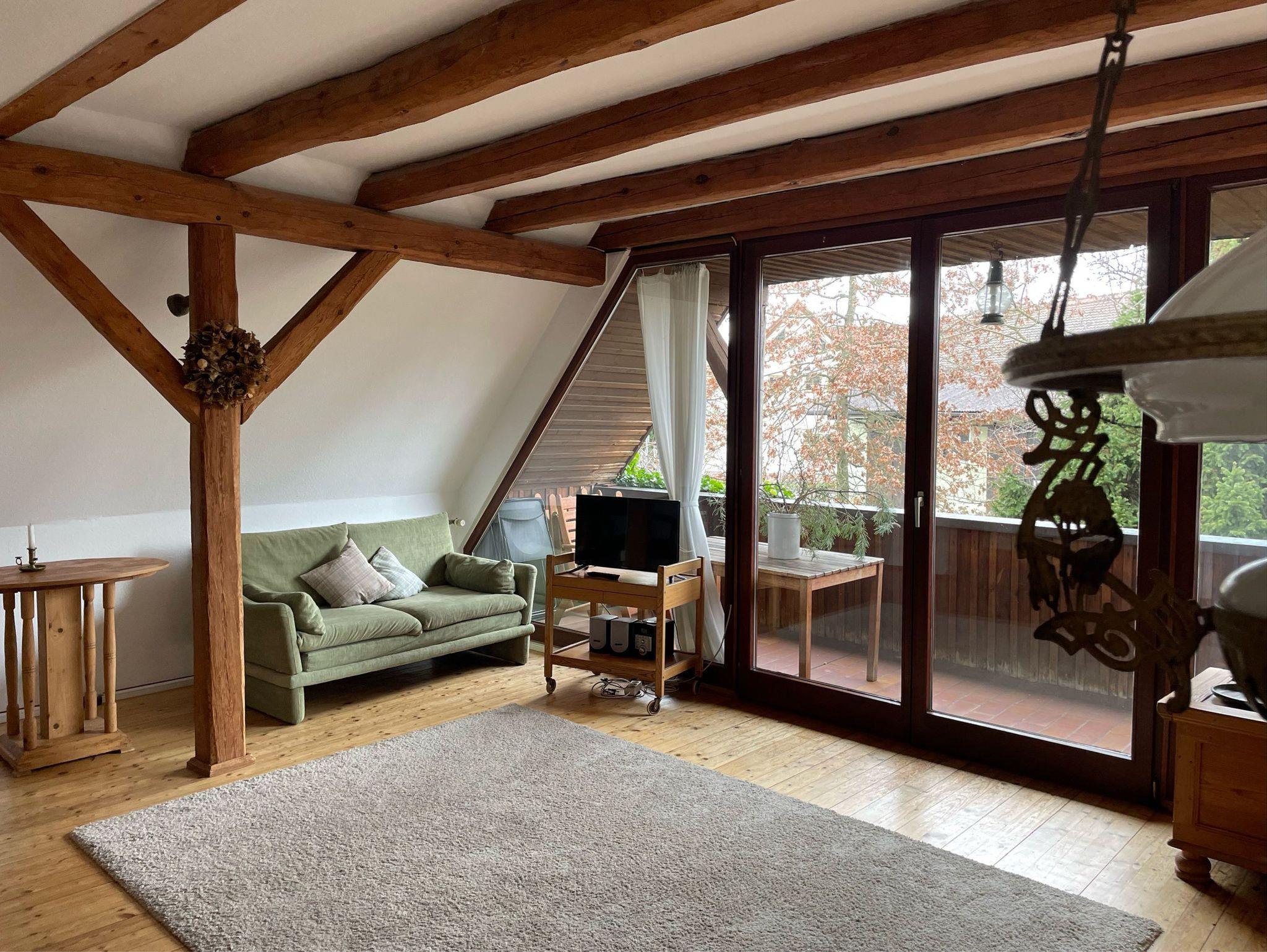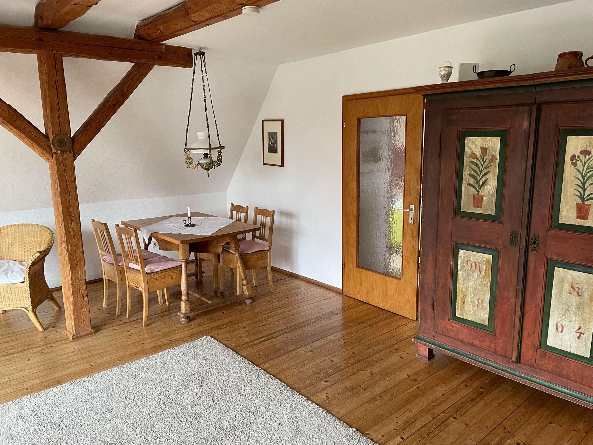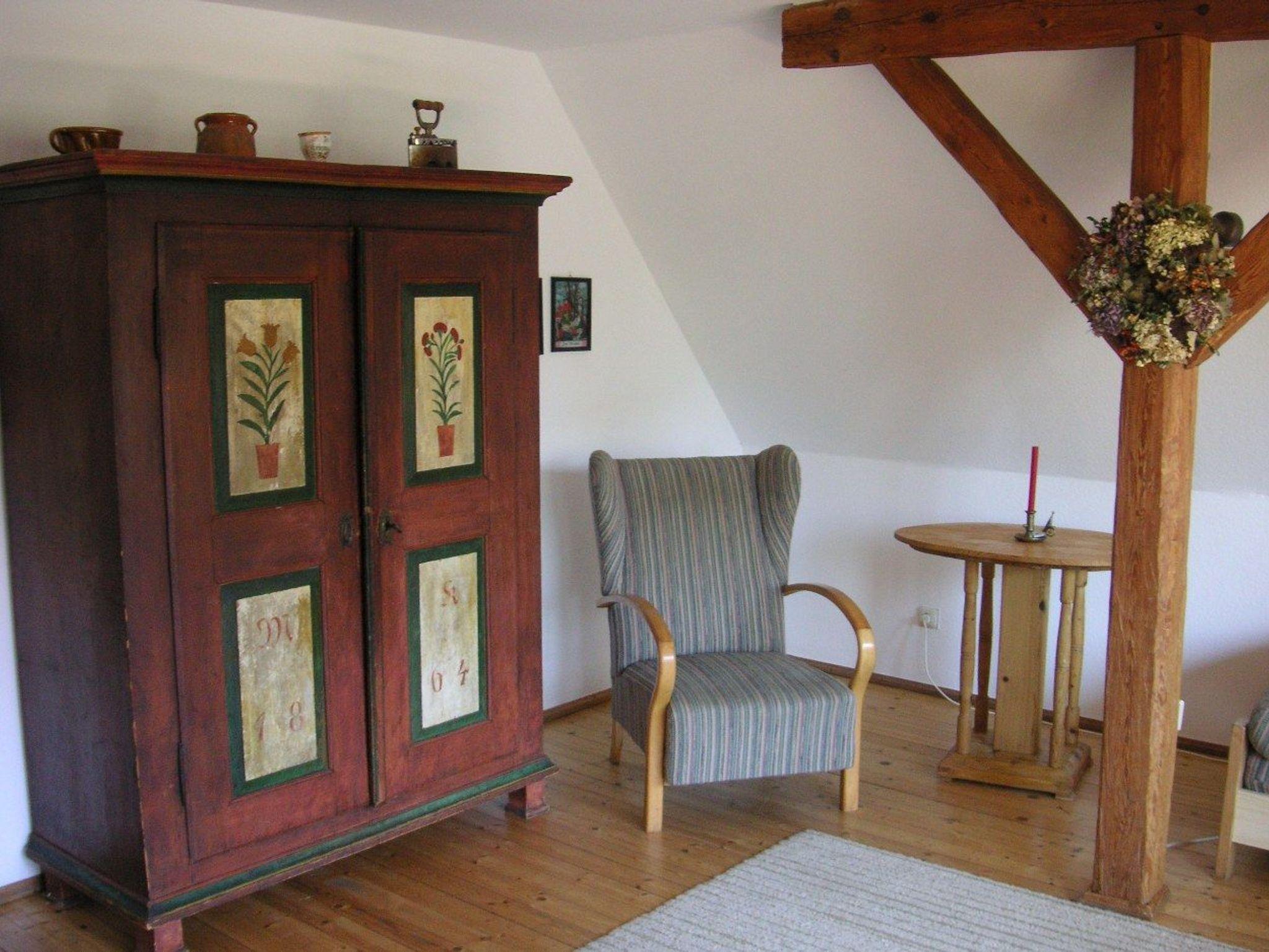 Das große Wohnzimmer erhält seinen Pfiff durch die Komplett-Verglasung der Giebelwand; der vorliegende Balkon ist überdacht, somit lässt er sich eigentlich bei jedem Wetter bedenkenlos nutzen. Gartenblick ! Einrichtung: originale Bauernmöbel nicht nur im Wohnbereich (z.B. gemütlicher Ohrenbackensessel, Holztruhe und ein Schrank von 1860).