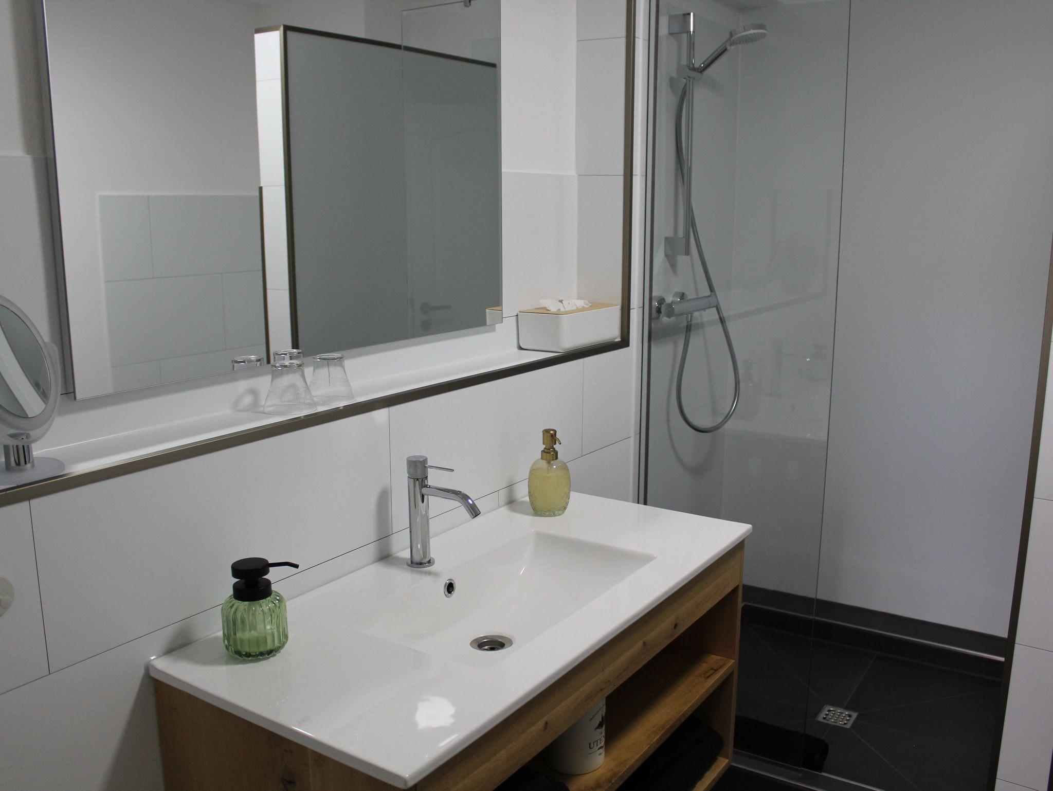 Für erholsamen Schlaf stehen zwei separate Schlafzimmer zur Verfügung: ein Schlafzimmer mit Doppelbett und kleiner Sitzgruppe sowie ein zweites Schlafzimmer mit zwei Einzelbetten - perfekt für Familien oder gemeinsam reisende Freunde. Das moderne Badezimmer ist mit Dusche und WC ausgestattet.