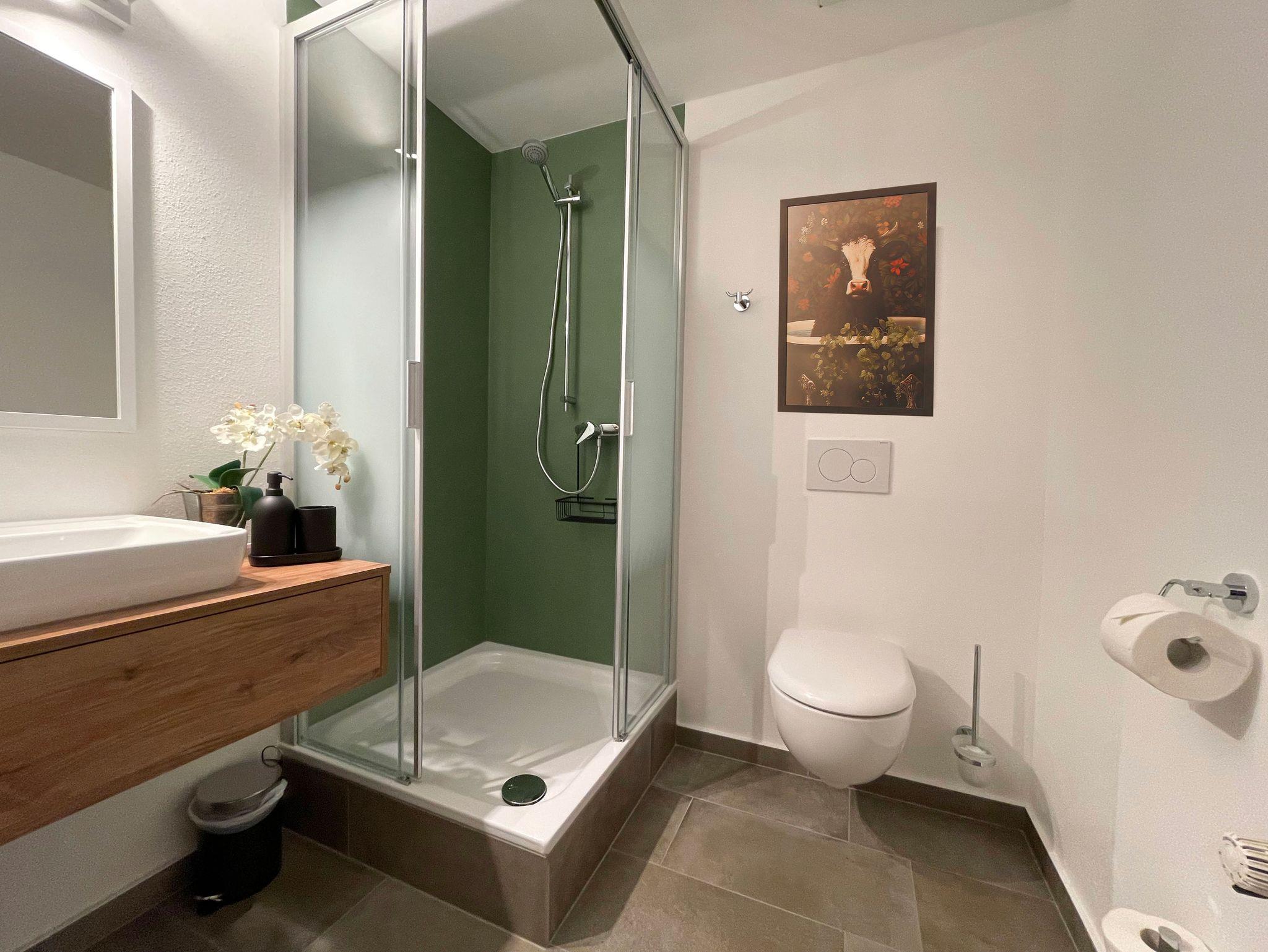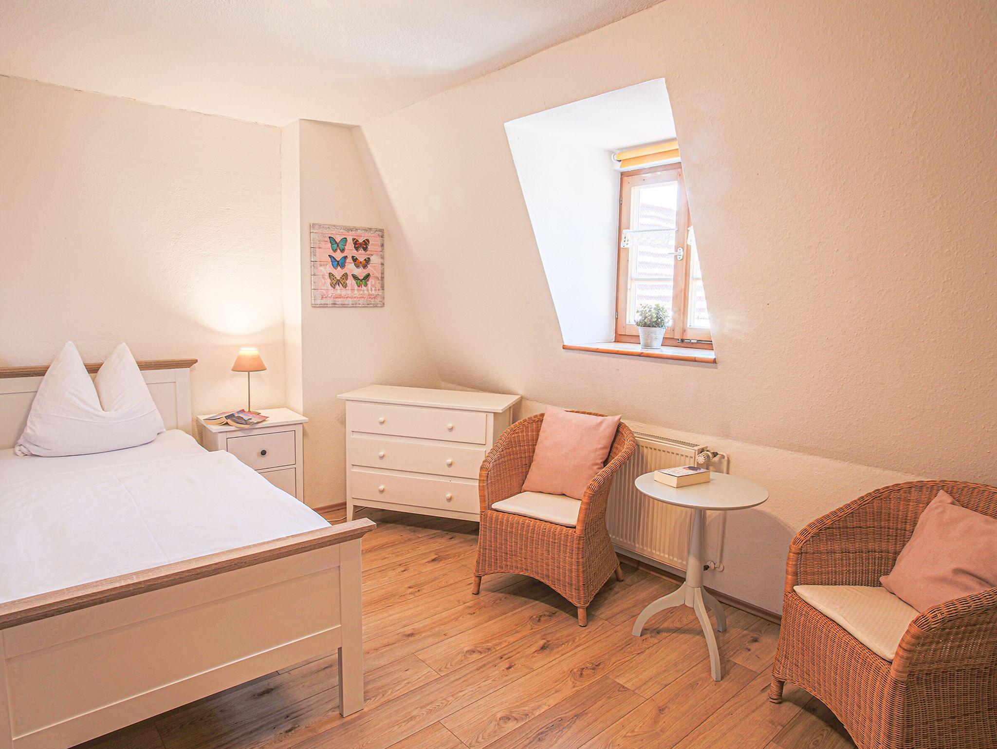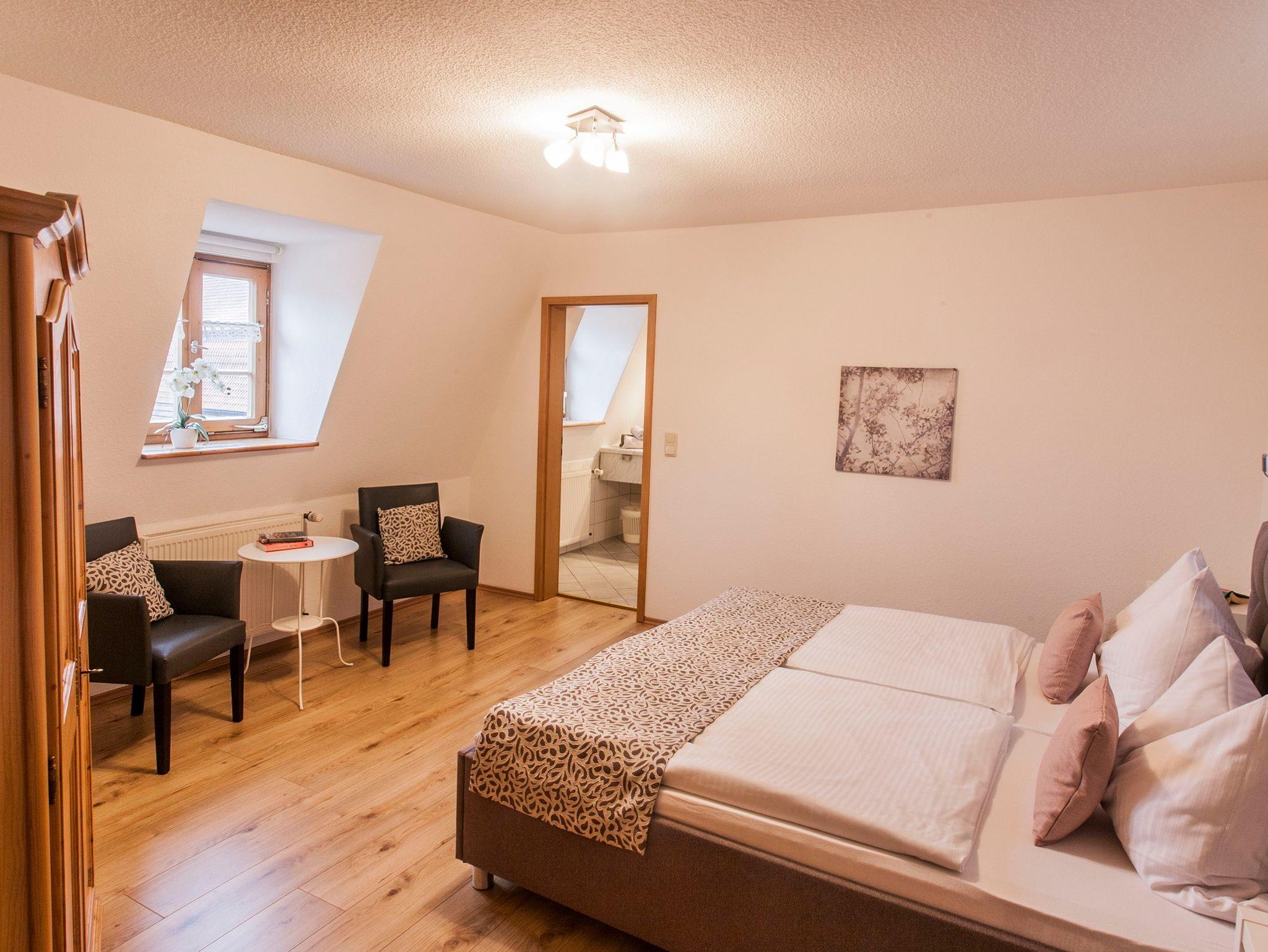 Die Ferienwohnung Schmiede bietet mit ihren 56qm Wohnfläche Platz für bis zu 1-3 Personen. Das erste Schlafzimmer besitzt ein Doppelbett, das andere ein Einzelbett, ein Zusatzbett kann dazugestellt werden. Beide haben ein anliegendes Badezimmer, das mit Dusche und WC ausgestattet ist, außerdem sind Föhn und natürlich Handtücher vorhanden. Ein Kinder-Zustellbett ist auf Anfrage auch möglich. Die Wohnküche hat eine gemütliche Essecke und ein Sofa. Die Küche hat einen Elektroherd mit Ceranfeld, Backofen, Spülmaschine, Wasserkocher, Toaster, Kühlschrank mit Gefrierschrank, Tischwäsche und Kaffeemaschine. Mit Fernseher, Radio und Wlan ist die Wohnung auch technisch gut ausgestattet.