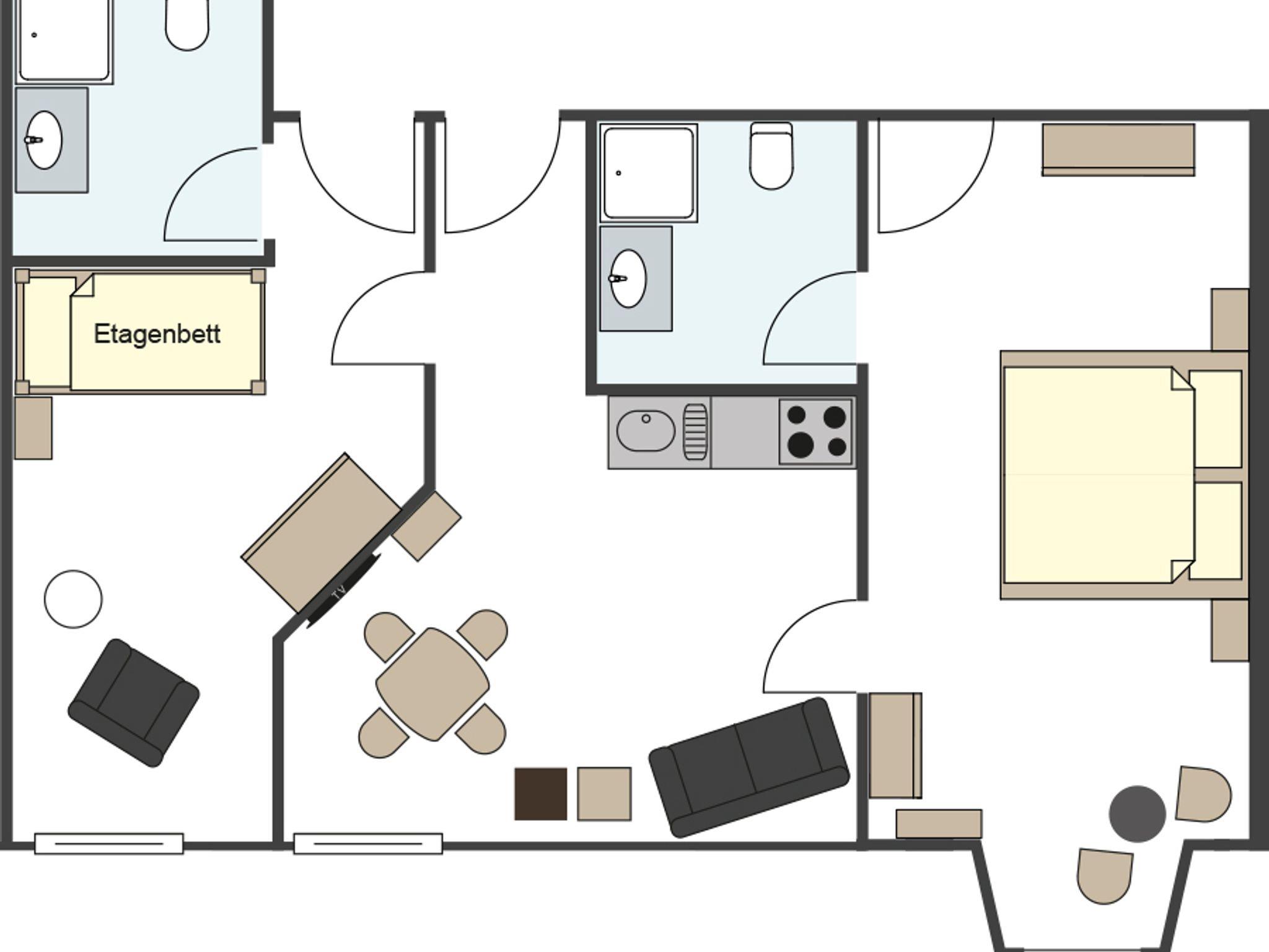 Die Ferienwohnung Blauer Turm ist mit ihrer 57qm Wohnfläche geeignet für bis zu 3 Personen. In der Wohnküche gibt es eine gemütliche Essecke und ein Sofa. Die Küche mit Elektroherd mit Ceranfeld, Mikrowelle, Toaster, Kühlschrank mit Gefrierschrank, Spülmaschine, Wasserkocher, Tischwäsche und Kaffeemaschine lässt keine Wünsche übrig. Das erste Schlafzimmer ist mit einem Doppelzimmer versehen, das Zweite mit einem Einzelbett. Beide Zimmer haben direkten Anschluss an ein Badezimmer, das jeweils mit Dusche, WC, Föhn und Handtücher ausgestattet ist. Mit Fernseher, Radio und Wlan ist die Wohnung auch technisch gut ausgestattet.