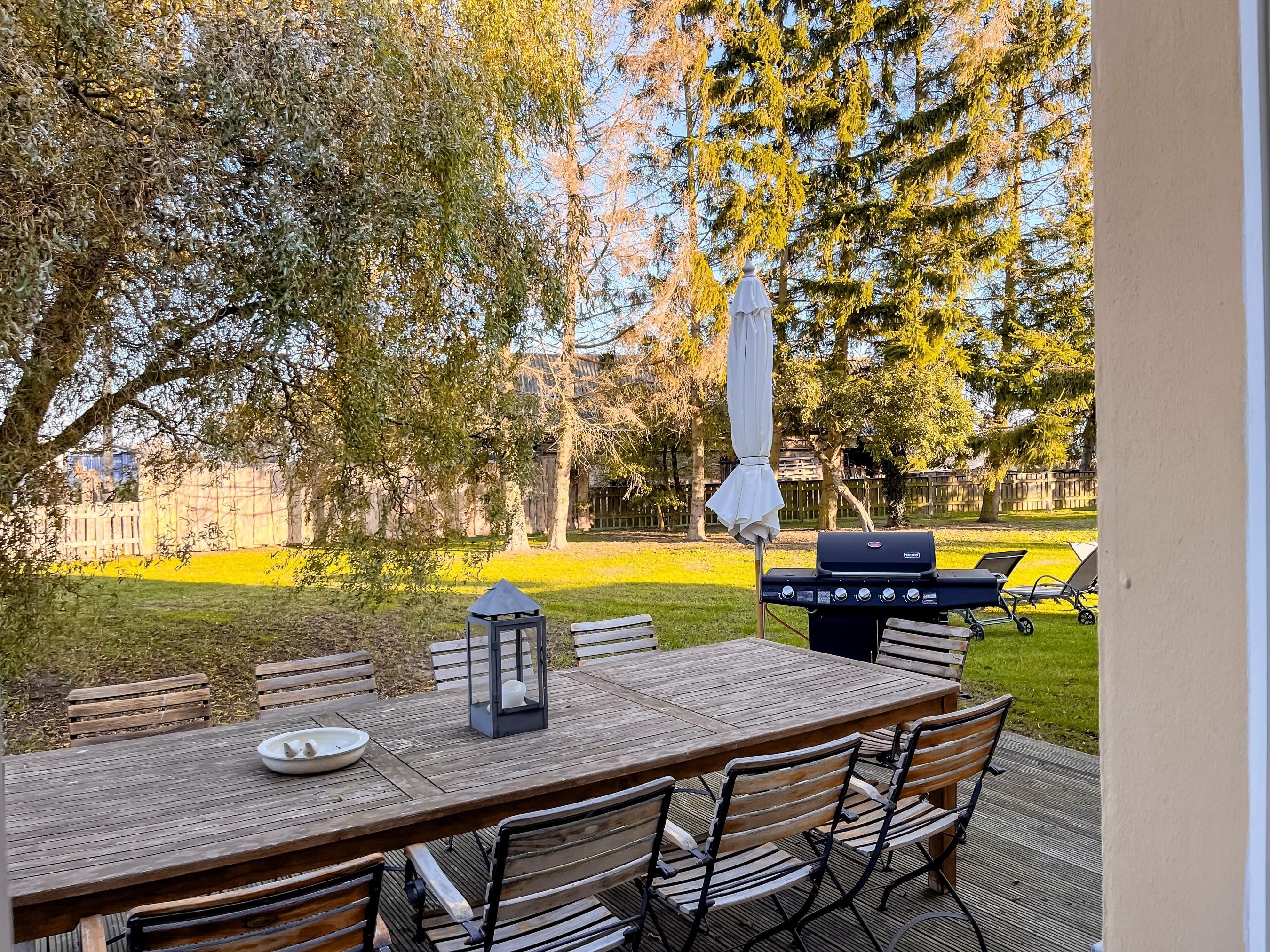 Terrasse: Mit Gartenmöbeln, Sonnenschirm und Grill – für entspannte Stunden im Freien.